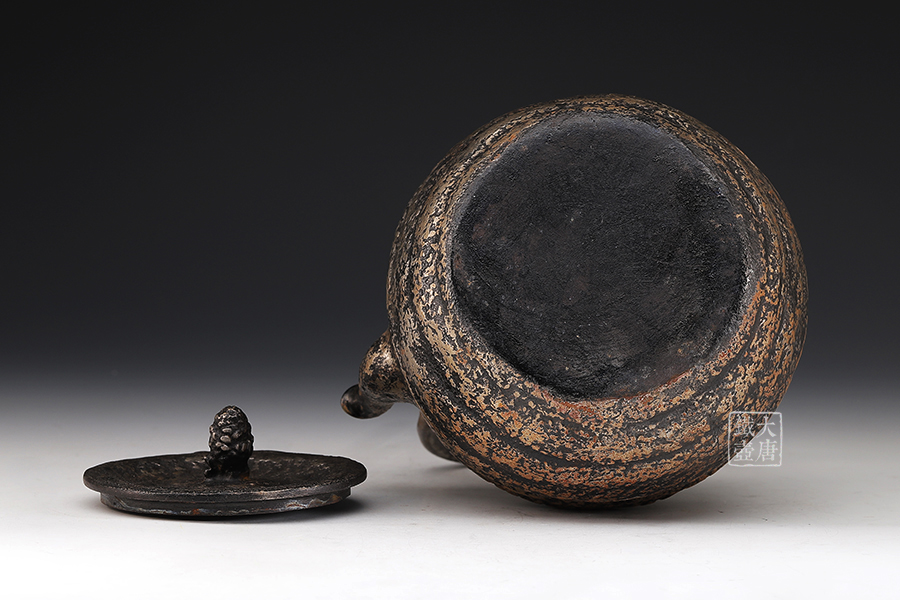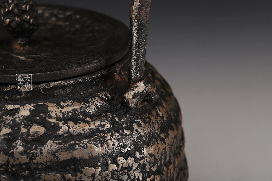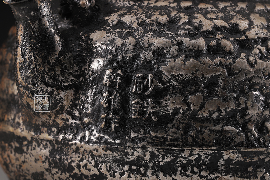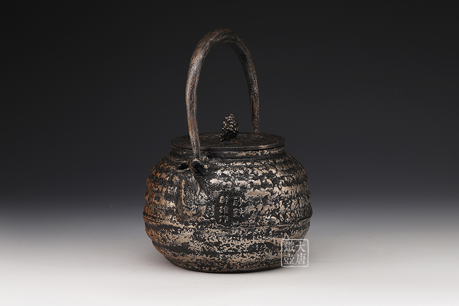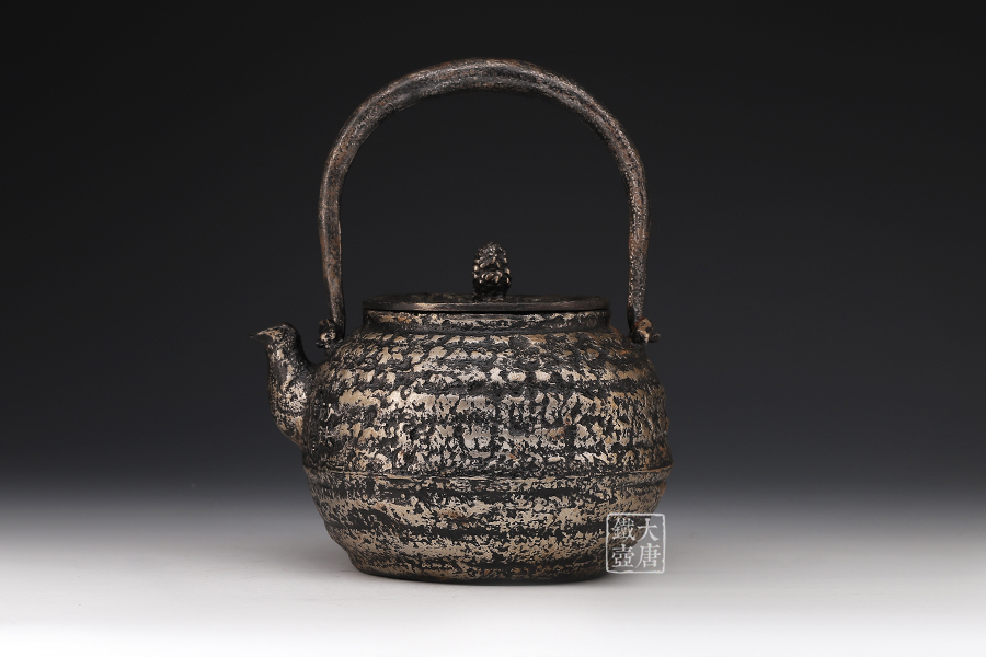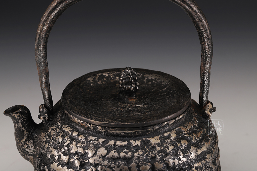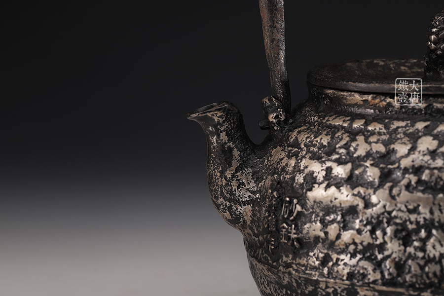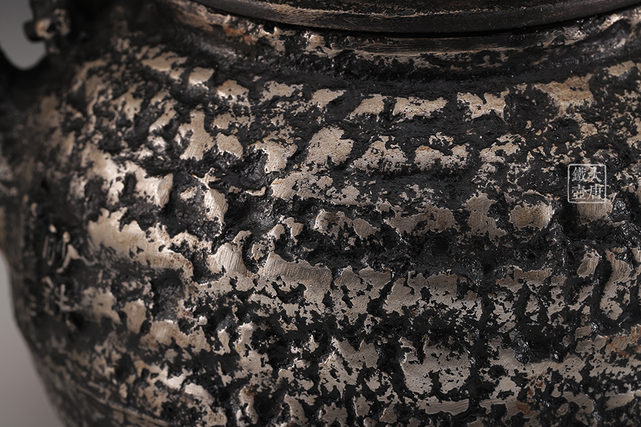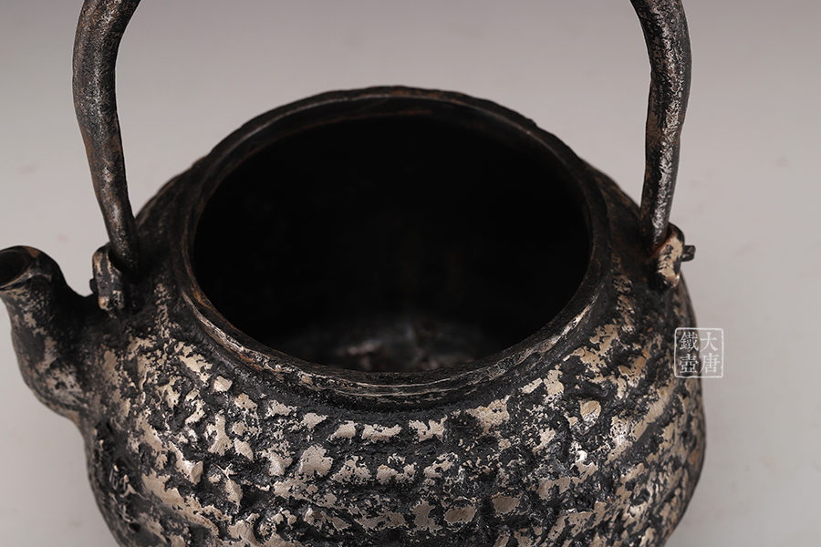 荒井工房的鐵瓶除了在鑄造工藝上有嚴格的規(guī)范和體系,在鐵瓶裝飾技術上也頗有建樹。除了傳統(tǒng)的印刻技術外,荒井工房還掌握了非常出色的金銀鑲嵌技藝,尤其以大片的鏨刻銀片最為出眾,這在山形當地堂口中獨樹一幟。