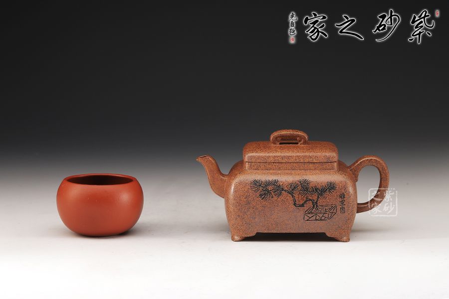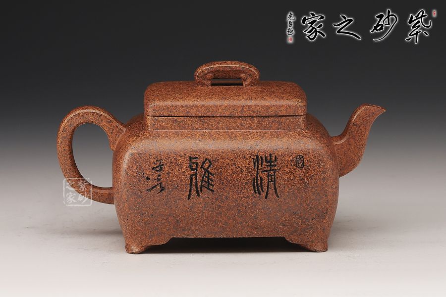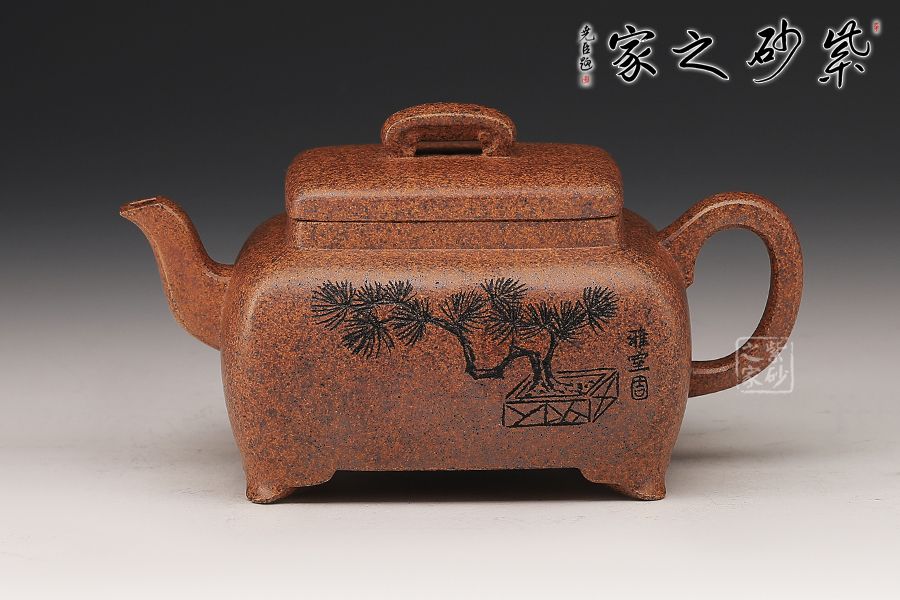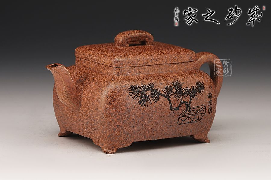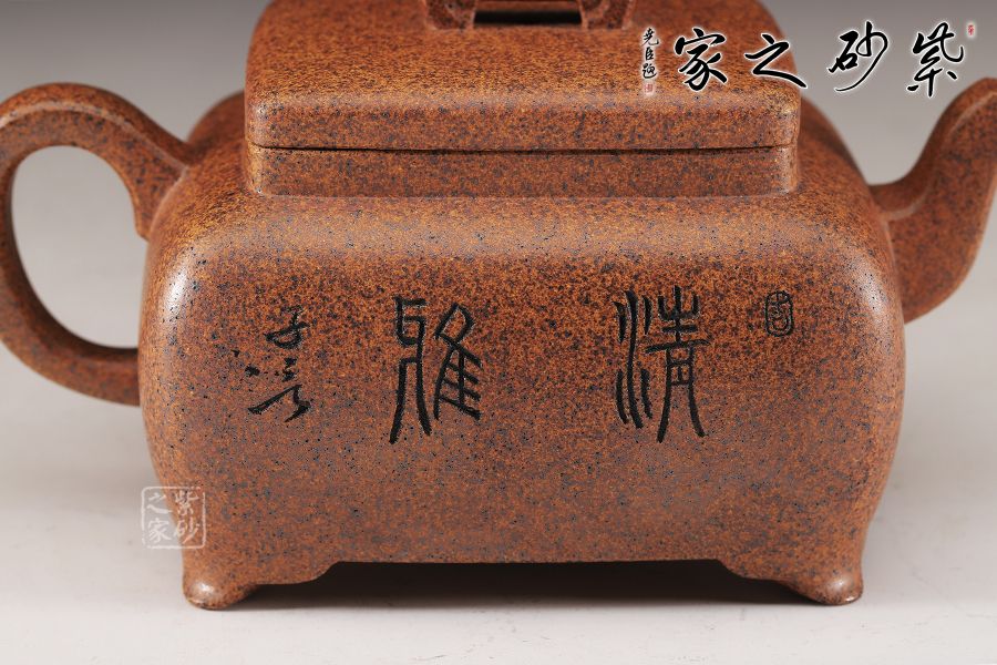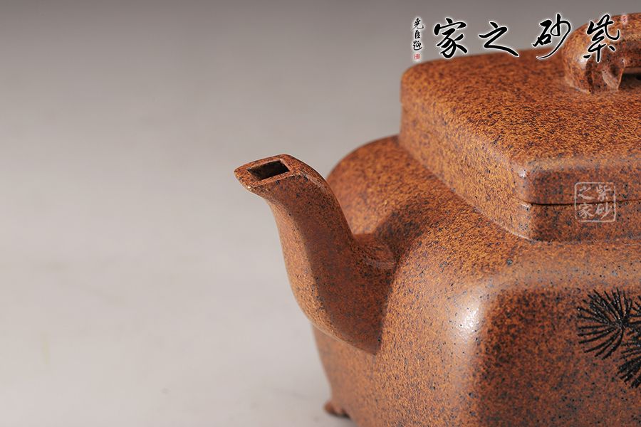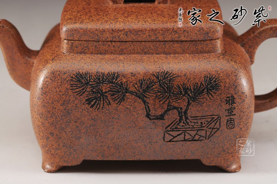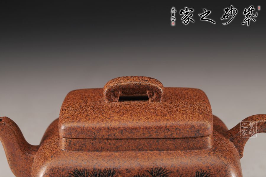 這款四方橋梁雖為經典器型,在老師手中形神俱備,更加出彩,方形橋鈕,寬厚有力。四方鼓蓋,折線分明,截蓋壓于壺口之上,氣勢雄大,彎流在方器中極為常見,其霸氣十足,嘴頭平衡直出,朝向水平方向,方形壺把,轉折迂回之間步步到位,四方壺體加底設計,穩(wěn)重中見大氣,是制作方壺人的胸襟和氣度。傳統(tǒng)方器,韻味十足。壺身沉穩(wěn)厚重,朱婷老師的刻繪讓壺身的觀賞性更加有意境。