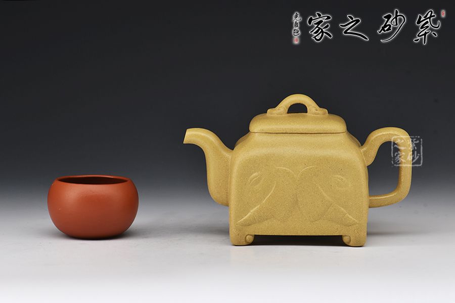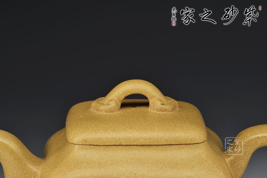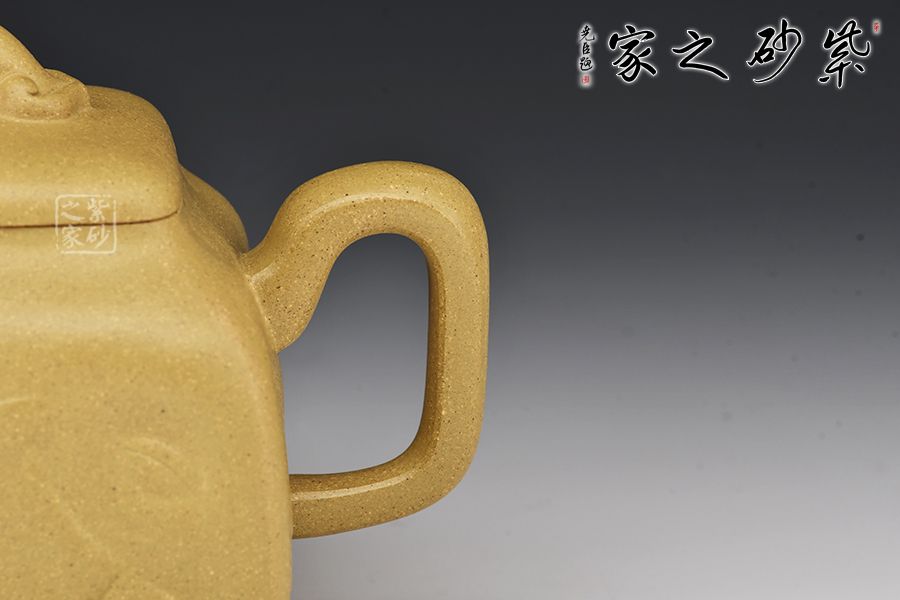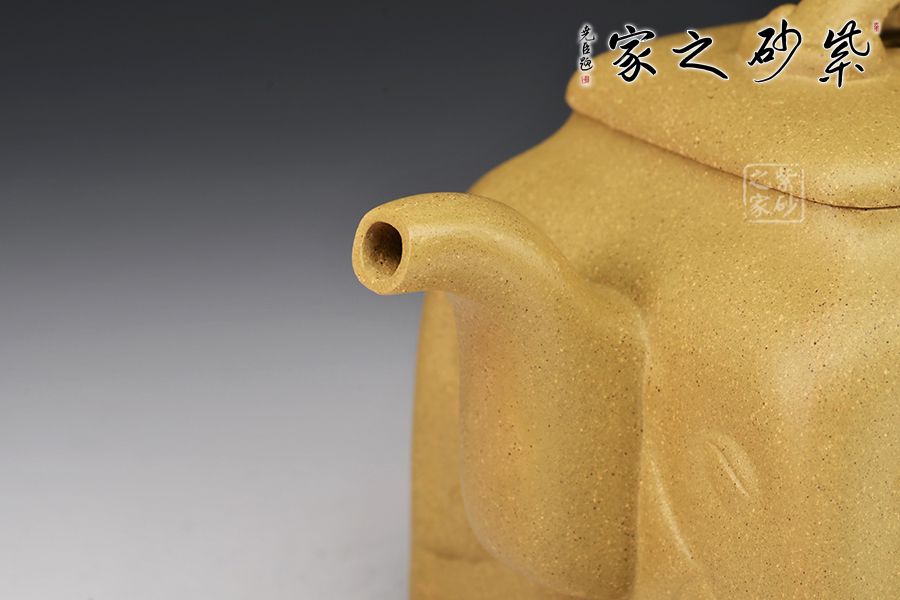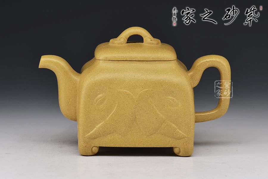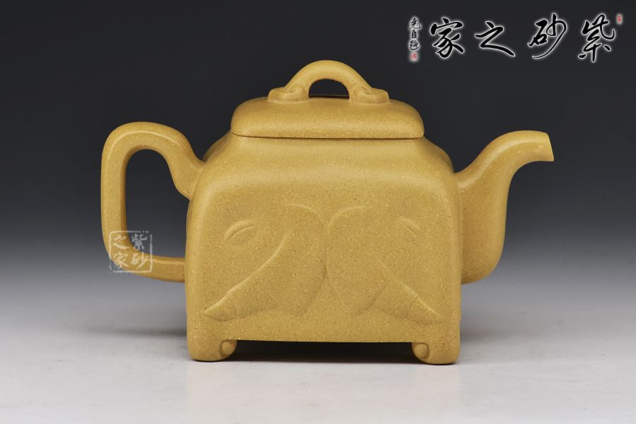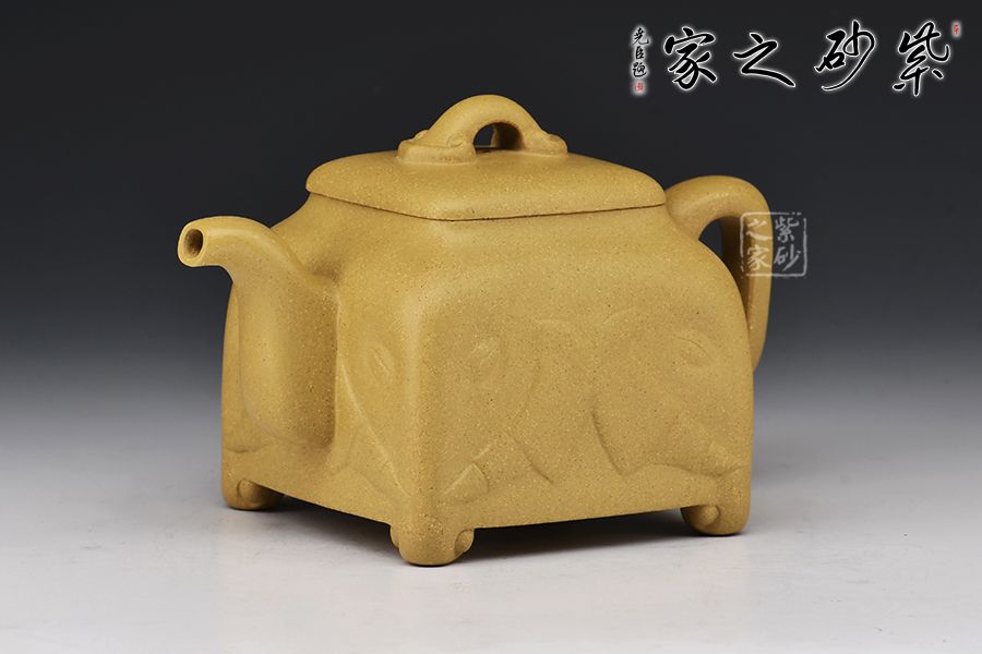 壺身為四方造型,略顯扁圓狀,矮而敦實。壺底四足,呈犴門狀,尤顯渾厚有力。彎嘴胥出,耳形把隨身勢。高頸,四方蓋,如意橋形鈕與壺身呼應,表現出如意吉祥的寓意來。