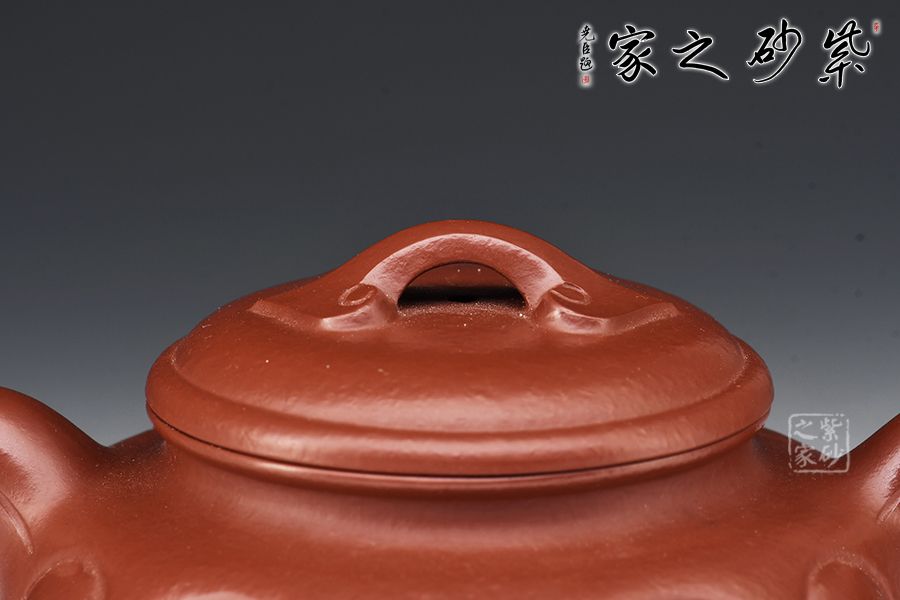 此作品在傳統(tǒng)仿鼓扁壺造型上加飾如意筋紋,身、蓋、頸、腹、鈕,錯落有致,骨肉亭勻,壺的口沿與壺蓋截成一條圓線,口蓋各占一半,蓋子蓋上即合成飽滿的圓線,其對作者的考量可想而知,壺流胥出自然,壺把勻勢而起,且與壺身如意貫氣,壺鈕為如意形橋梁式,平緩舒展合體,整器精美絕倫,而且能夠在泥色的襯托下呈悠然、典雅之美。