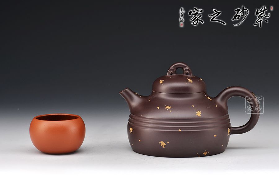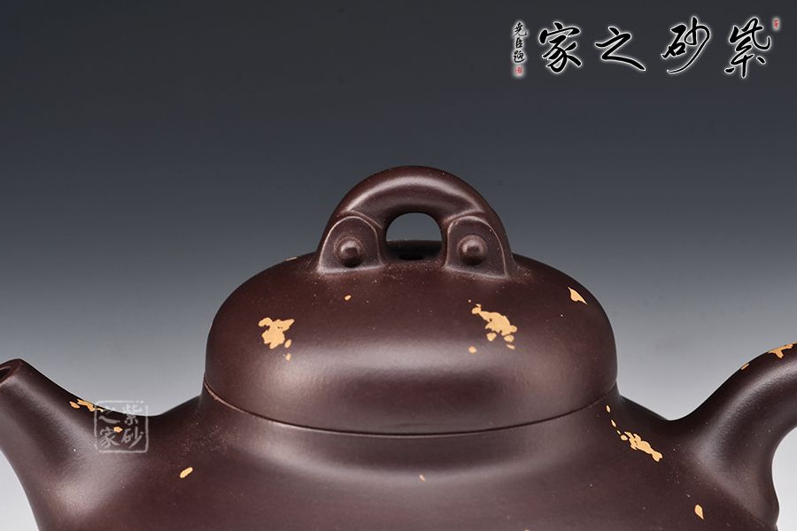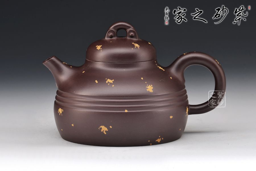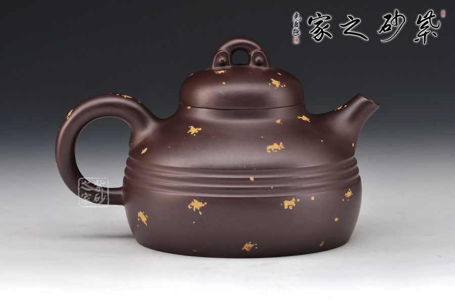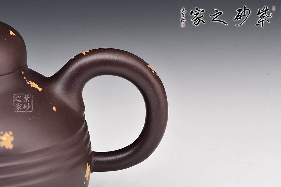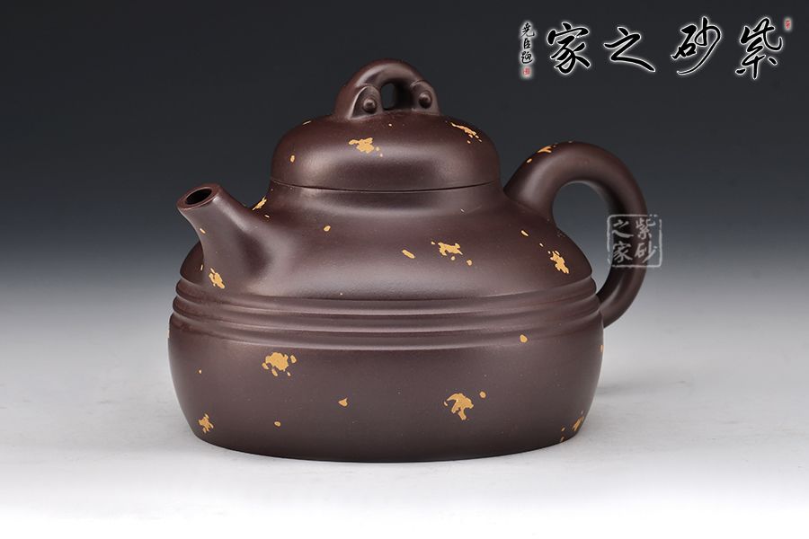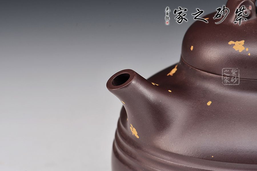 此款為漢靈壺,壺嘴短直,出水利落,壺蓋嚴(yán)絲合縫,氣密性佳,壺身上小下大的兩個(gè)圓面突出了中間的線條美,壺面點(diǎn)綴灑金給壺增添幾分活潑之意