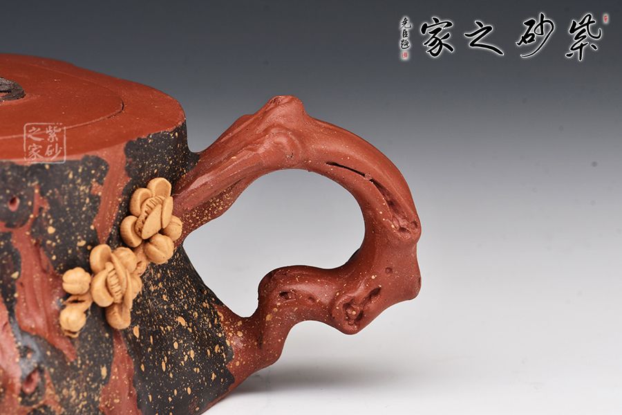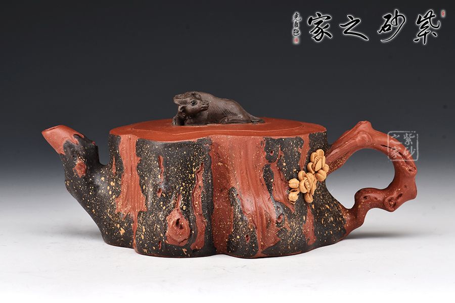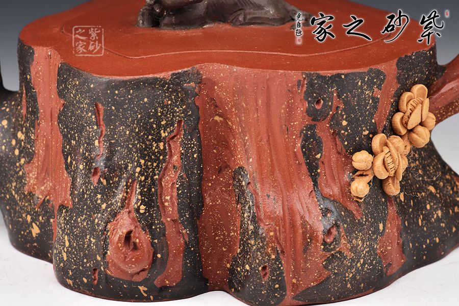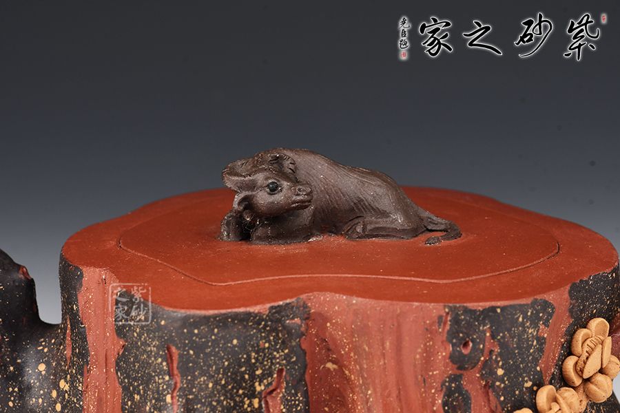 吳菊鳳老師的花器非常難得,每一把都是靜心設(shè)計(jì)成品。此壺拋開(kāi)壺鈕則是標(biāo)準(zhǔn)的梅樁器型,梅花的貼花逼真靈動(dòng),壺鈕做成了一只爬臥的老牛,牛氣沖天,花器仿生器的結(jié)合,非??简?yàn)做工,同時(shí)觀賞性寓意是一絕,值得把玩。