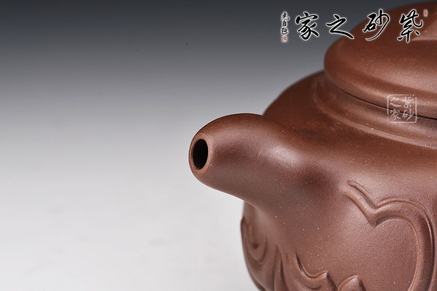 此壺是吳菊鳳老師在傳統(tǒng)的仿古如意造型上加以改良的,在壺身的三個方向延伸出三個小足,壺身的紋路也做成了現(xiàn)代比較流行的愛心形狀,趣味無窮,整把壺都是愛你的形狀。