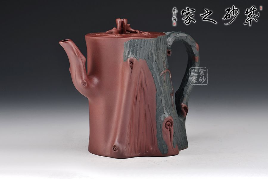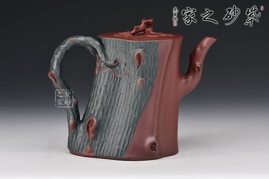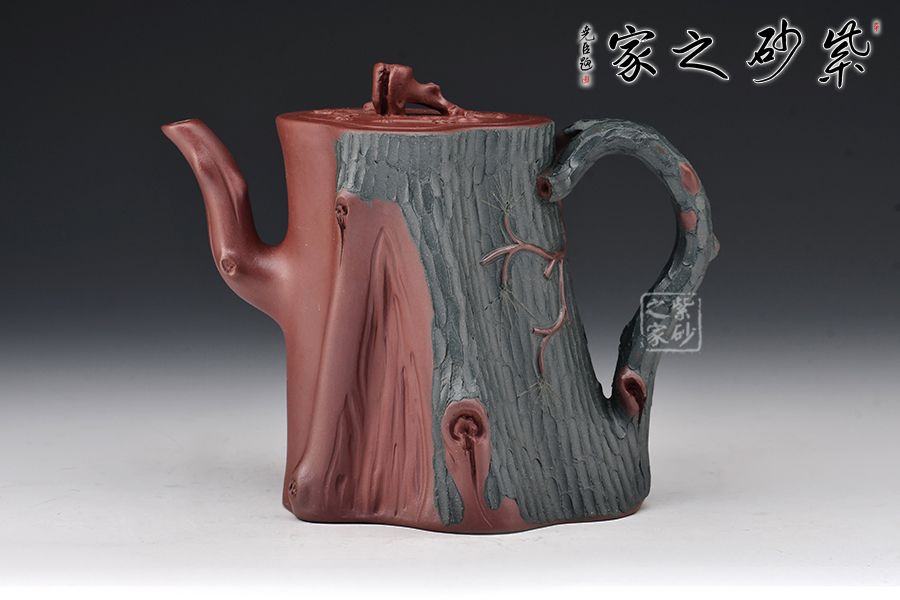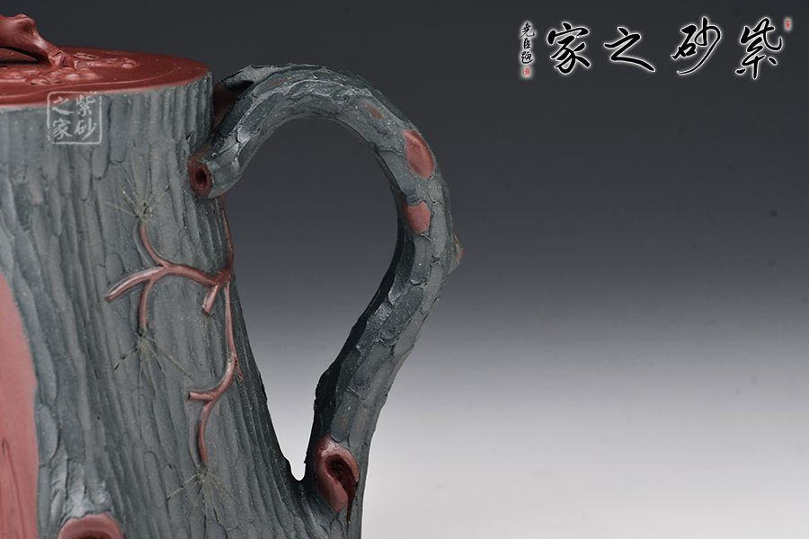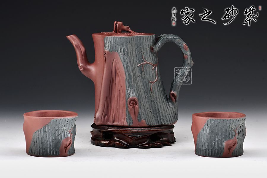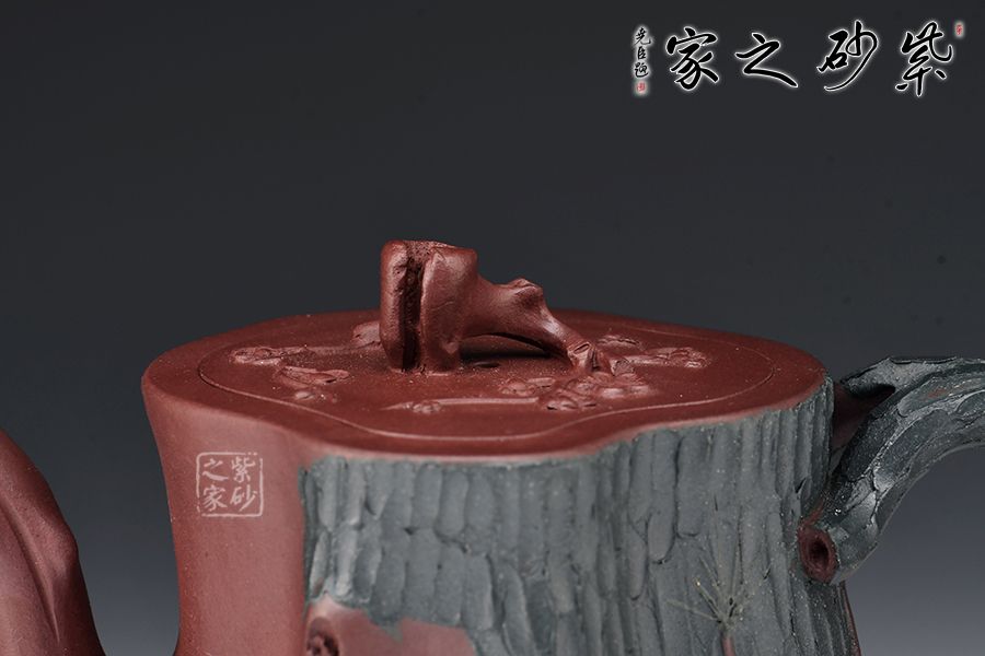 此壺以松段做壺身,樹皮斑駁蒼勁, 松枝虬蟠其上,針葉寫形亦寫意,形意俱佳。壺鈕與把均以老松枝塑成,挺秀有神,嵌蓋為不規(guī)則形,一壺二杯,自然生趣。