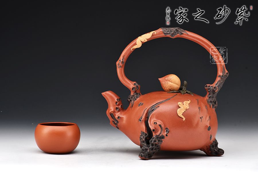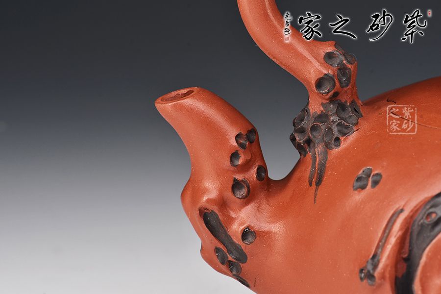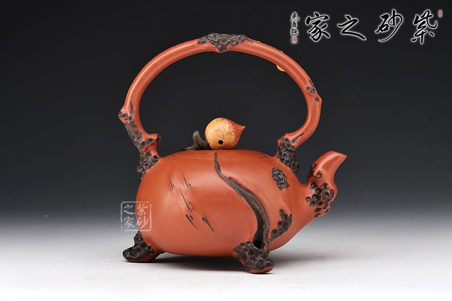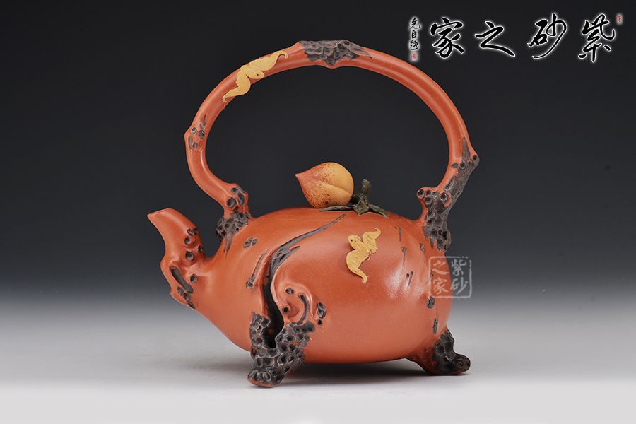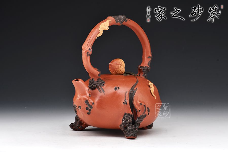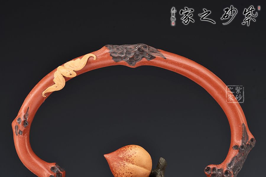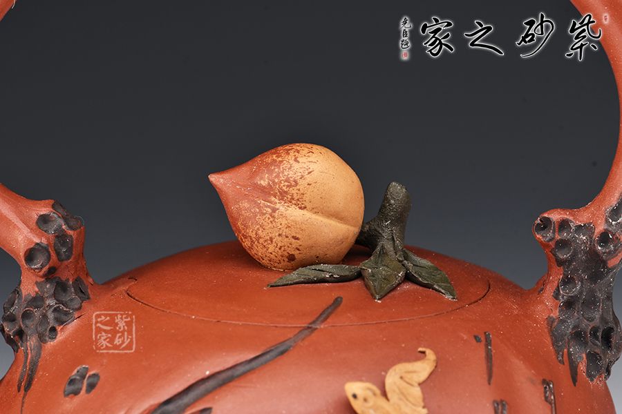 此壺是以貼花的形式,桃與蝙蝠盤于提梁與壺身,花器與圓器結合,以蒼老有力的桃桿為把呼應主題,象征福壽康寧,蜿蜒曲直,別致有趣,多種泥料撞色,雅致生動。形神氣韻兼?zhèn)?,渾然天成,不失為收藏佳品?/strong>