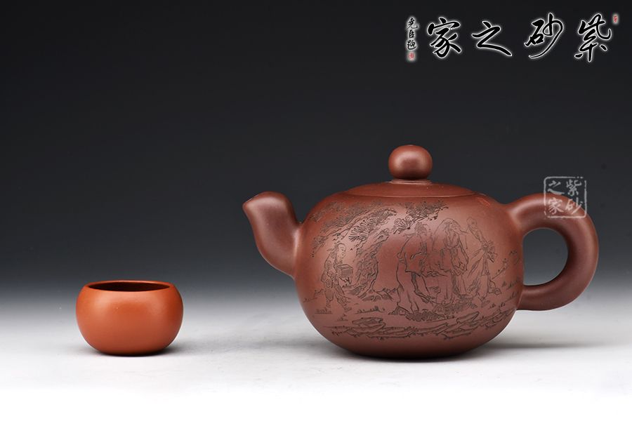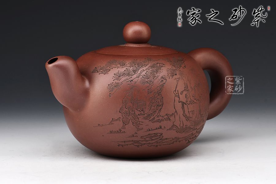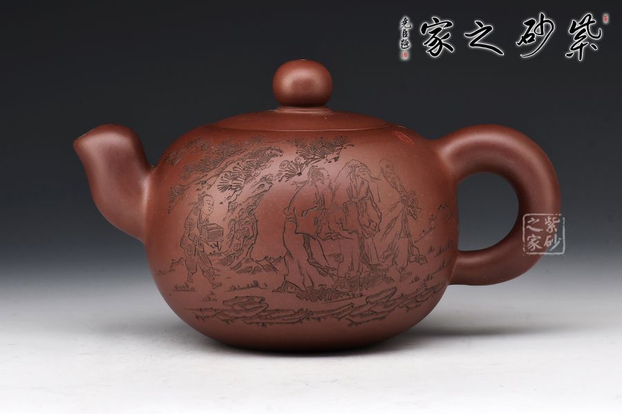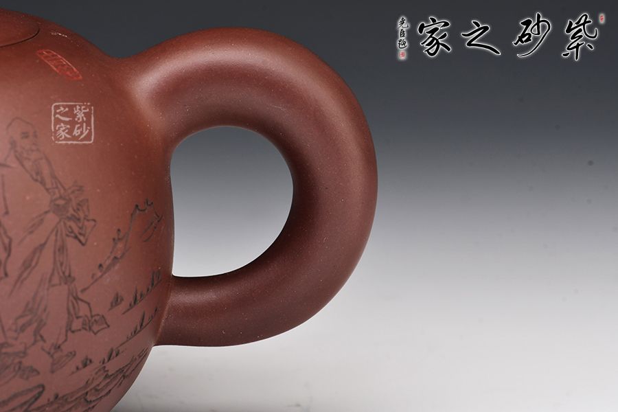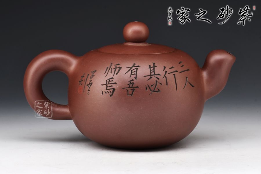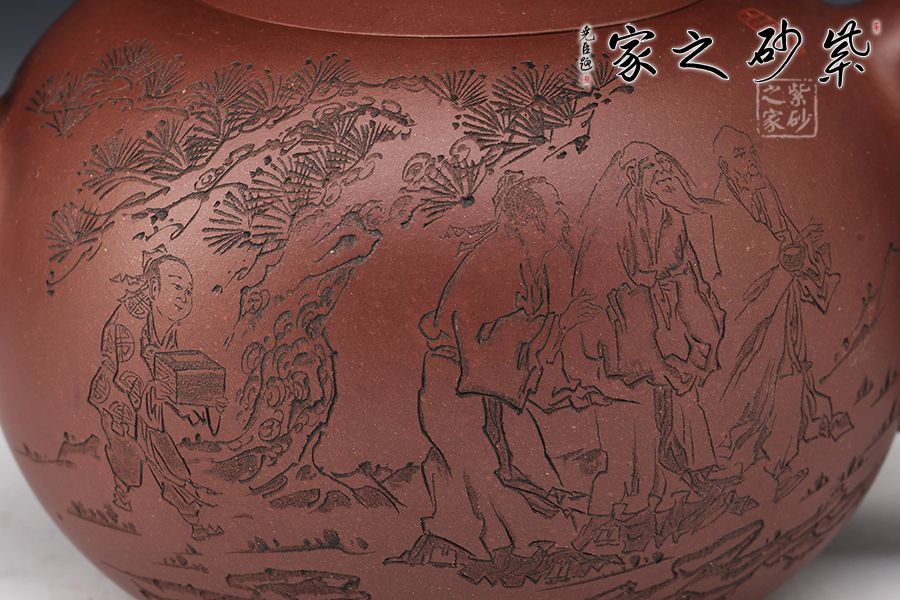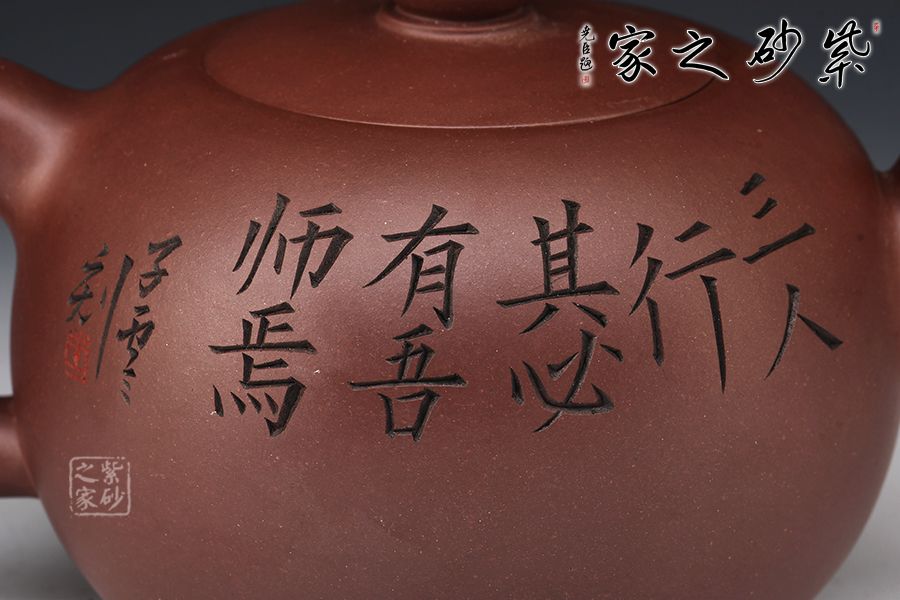 該壺正面刻繪著三位同行的友人和一位書童,反面刻繪著“三人行,必有我?guī)熝伞痹⒁馐悖浅V档檬詹?/p>
