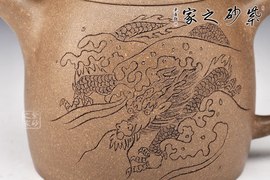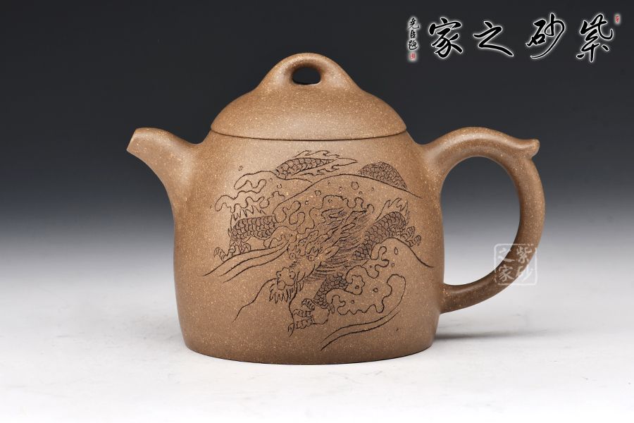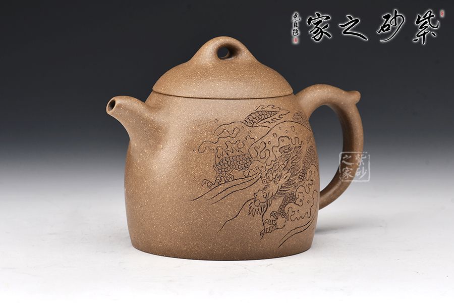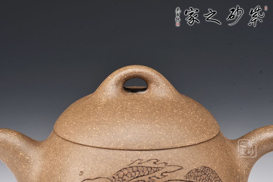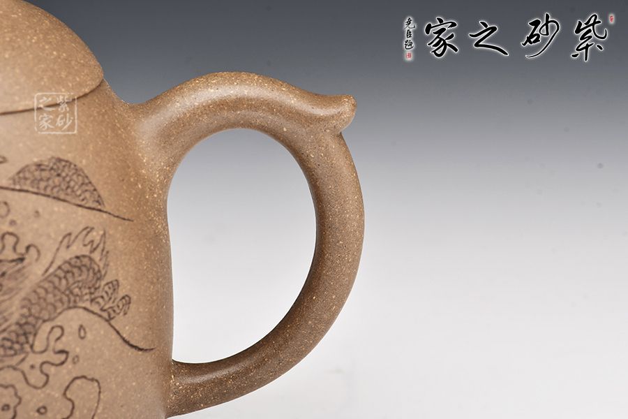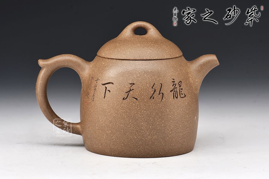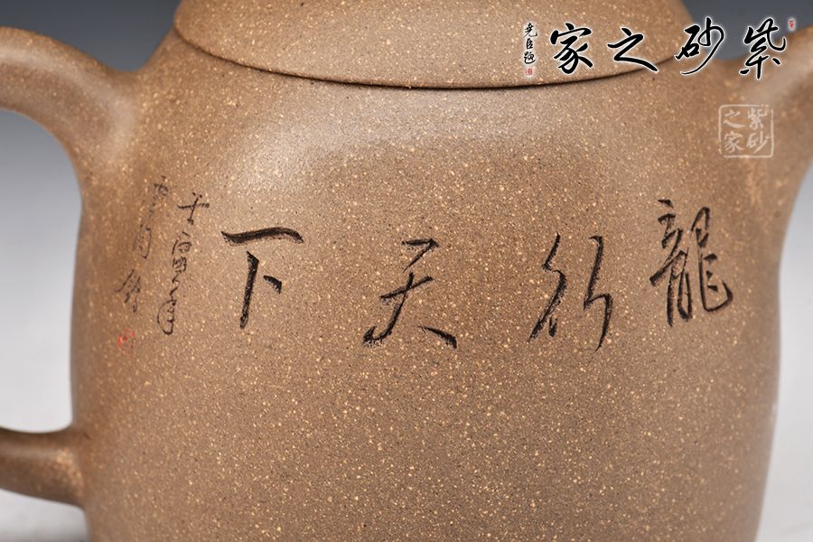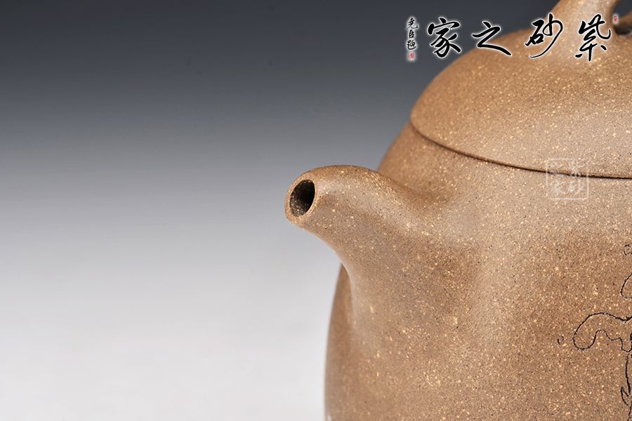 整款壺極其簡(jiǎn)練、古樸,橋鈕壓頂,與壺身形態(tài)相應(yīng)和;可以看出鈕狀略平,顯內(nèi)斂、沉穩(wěn),正切合秦權(quán)古韻。此壺在壺身反面刻繪梅花,疏影橫斜,暗香浮動(dòng),簡(jiǎn)單的刻繪不僅使整款壺古樸中帶幾分文人墨氣,更似乎嗅到幽幽茶香,切壺切查,極為難得。壺身正面兩個(gè)行書刻字業(yè)正好切壺,簡(jiǎn)潔而大方,為老韻壺中典范。喜歡的壺友不妨細(xì)賞一番!