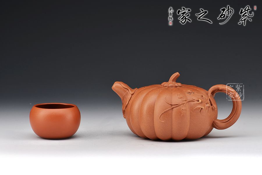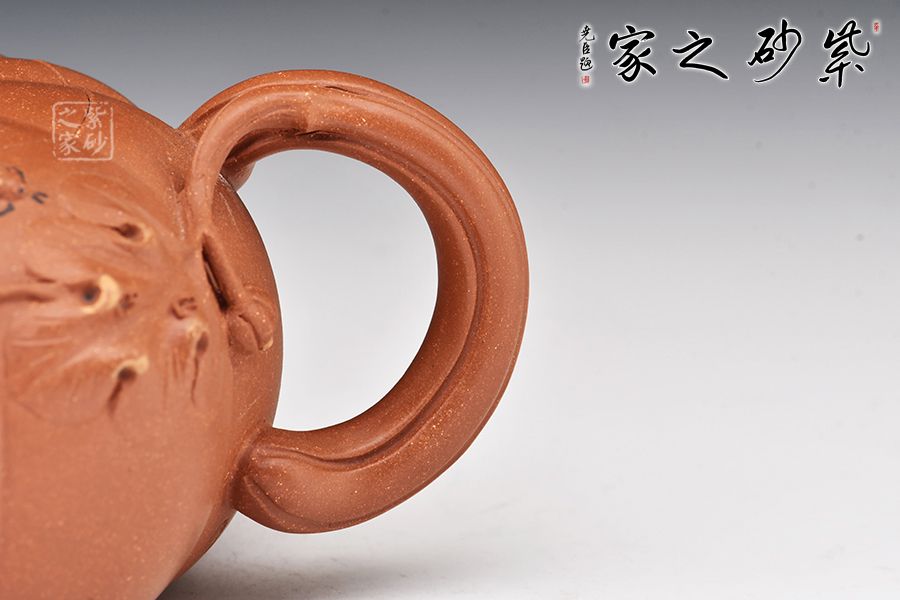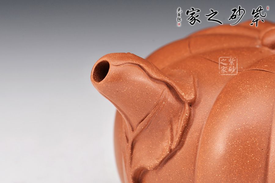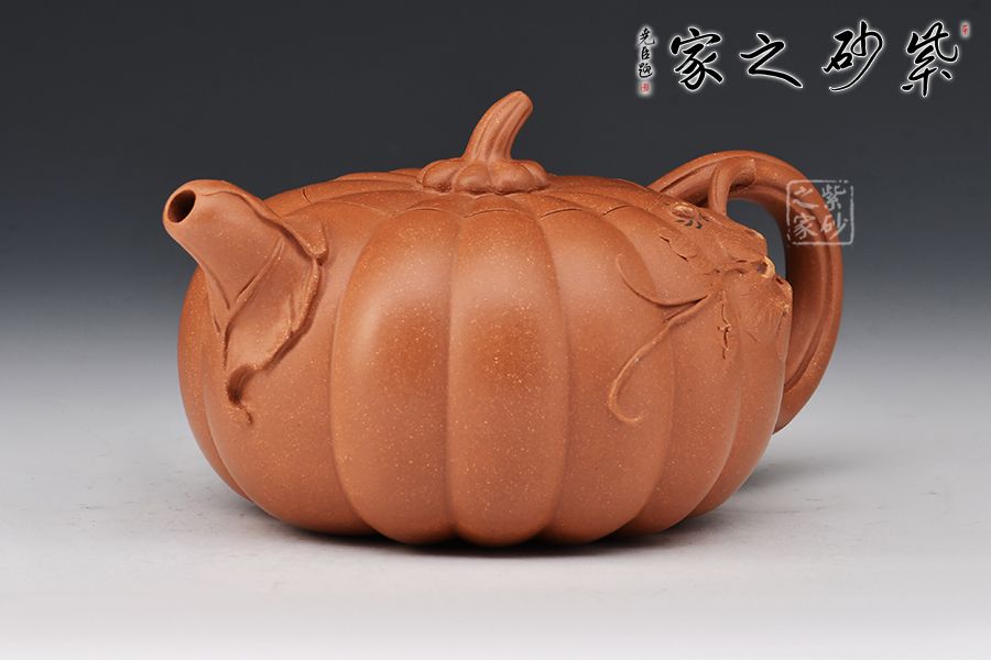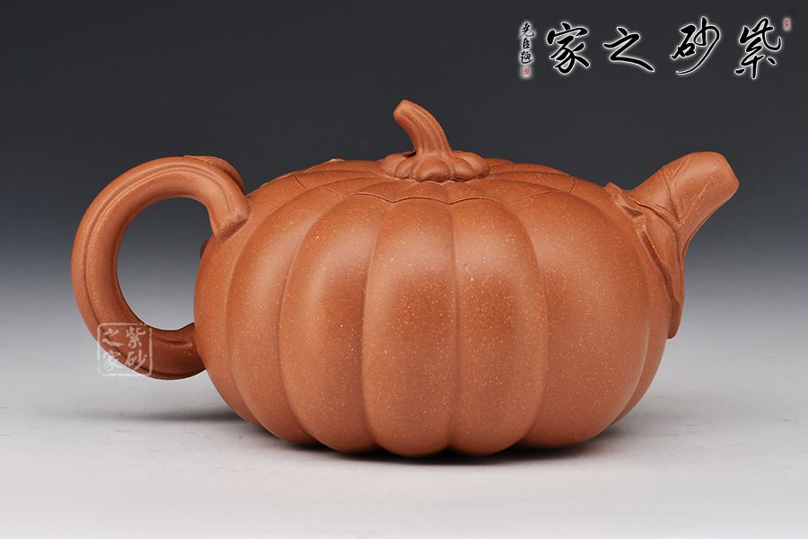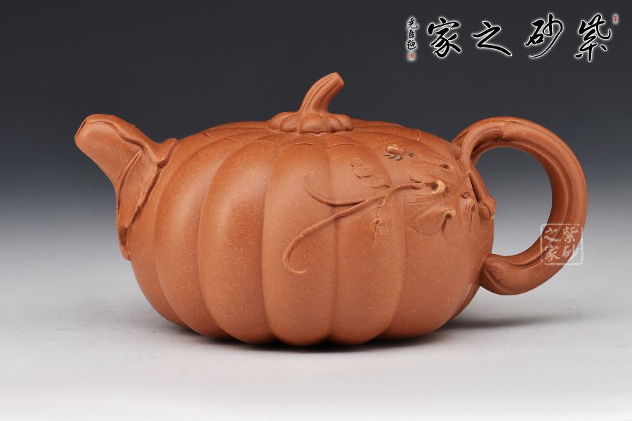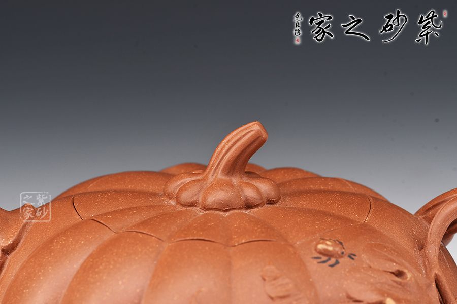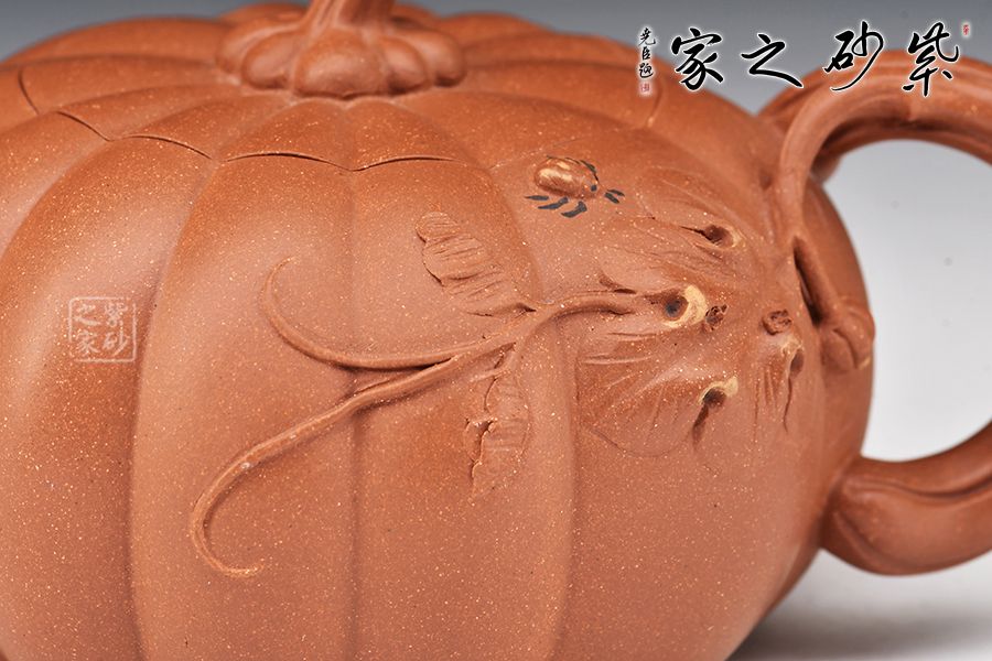 南瓜壺是紫砂壺中很常見的一種款型。此南瓜不僅外形酷似南瓜,更是集聚了南瓜的神韻,猶若瓜熟即將待落。壺鈕、壺把嫉皆以南瓜藤為原型,形象逼真。壺嘴則若南瓜葉包裹而成,精巧別致,創(chuàng)意極新。壺把處一南瓜葉子胥出,蒼老卻不失神氣。而南瓜壺身,紅色斑駁,極似熟透了的南瓜,讓人有快速采摘拿去熬湯的沖動。此南瓜壺,顯然活矣!