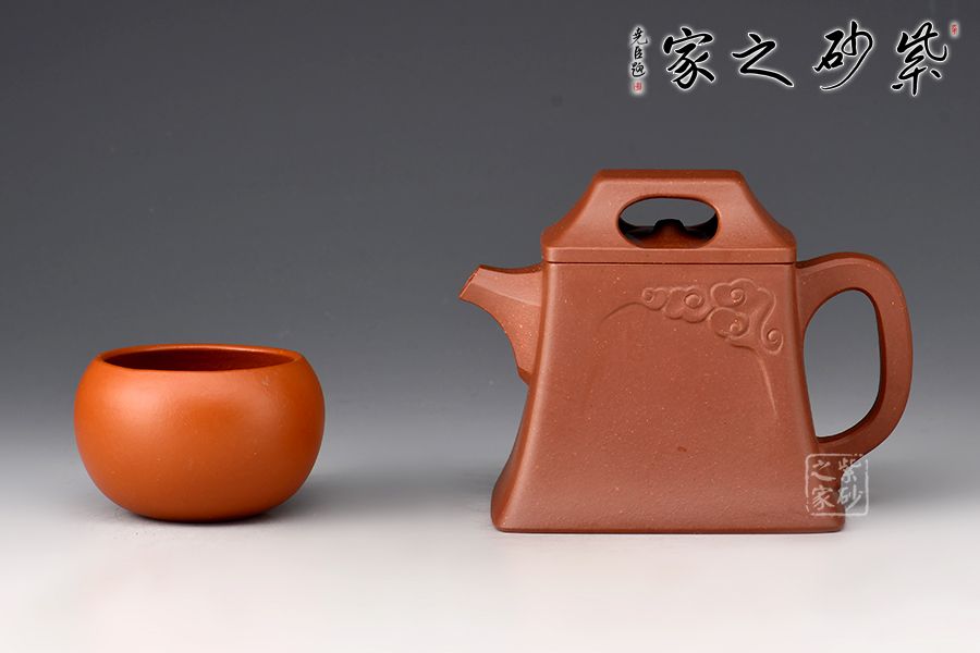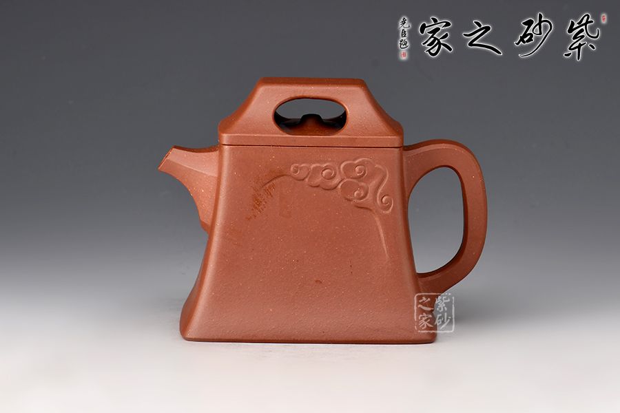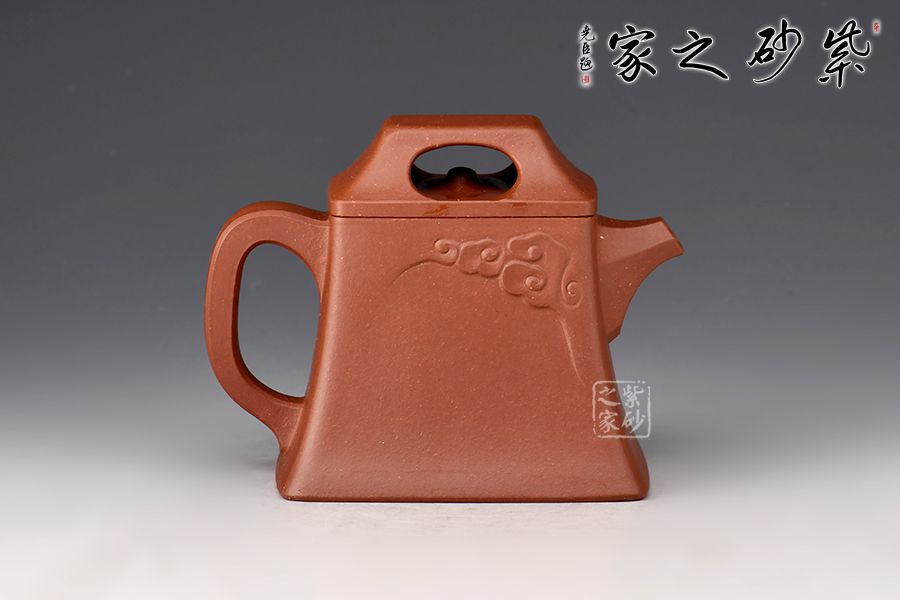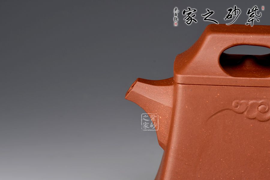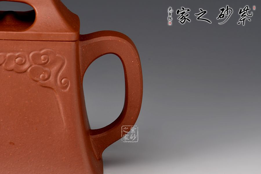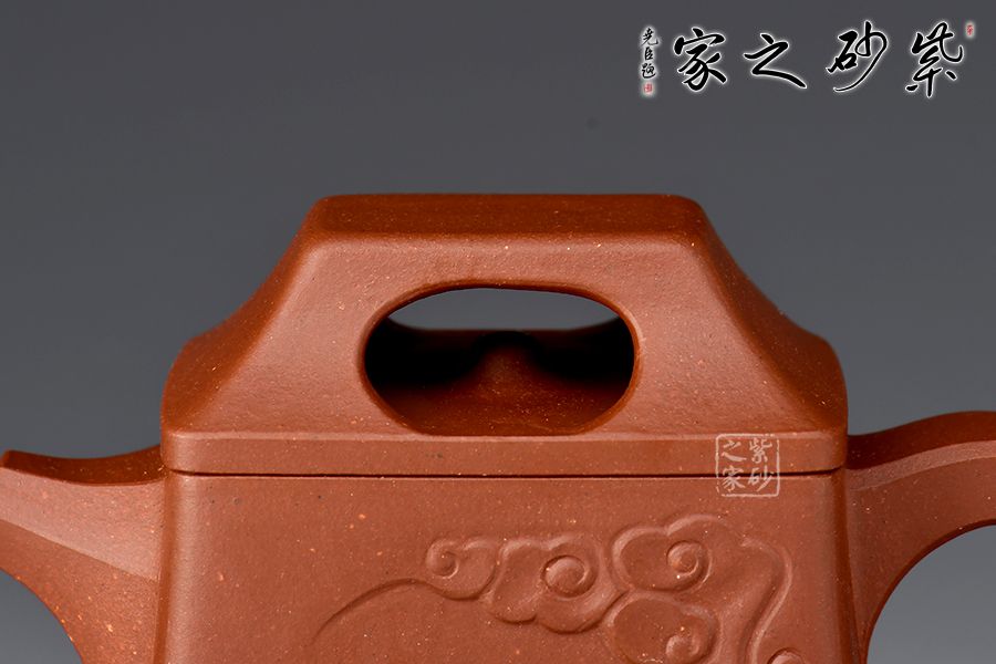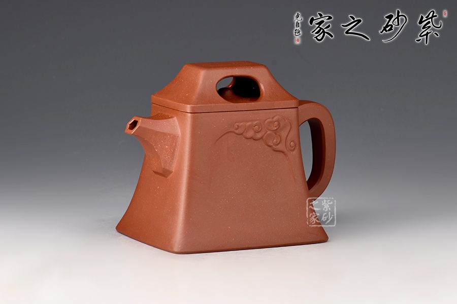 壺體造型簡約素雅,祥云圖案裝飾,寓意吉祥。身如方鐘,棱角分明,極具力蘊;壓蓋壺鈕四方中空,上斂下侈,如供懸索之鐘鈕,與壺身上下協(xié)調(diào),氣韻貫通。直嘴出水爽利,壺把上下轉(zhuǎn)折有力,處理得細(xì)致入微,使曲流方把,左右呼應(yīng),渾然一體,在彰顯力蘊的同時更具線條美感。