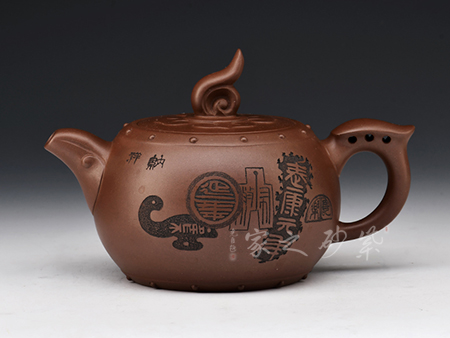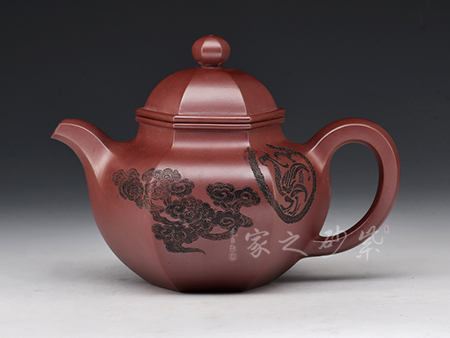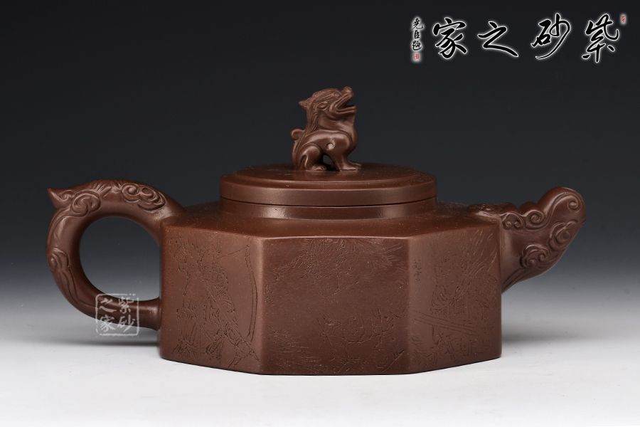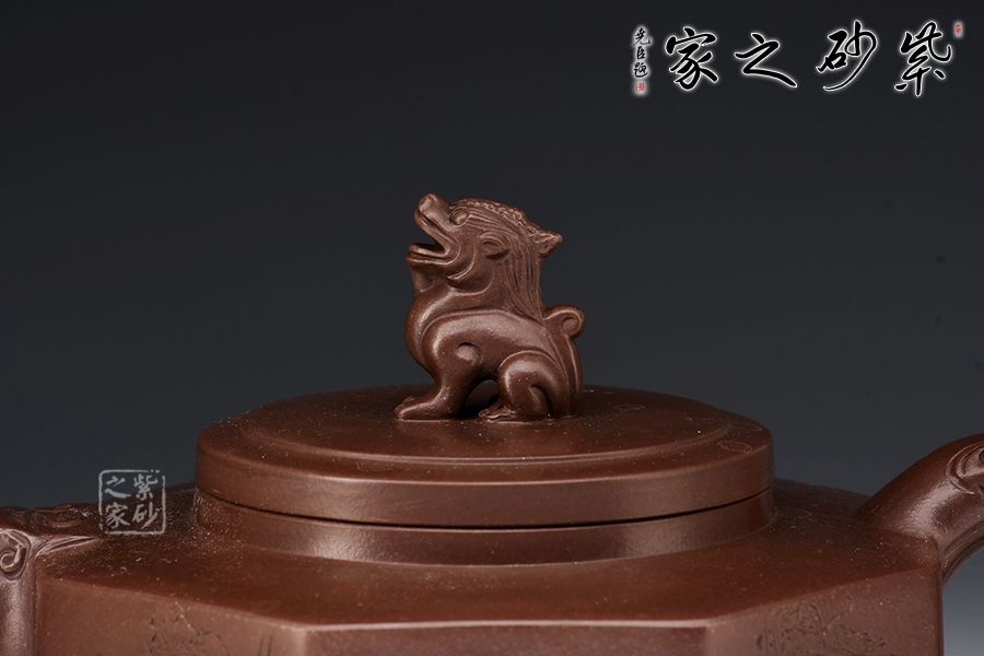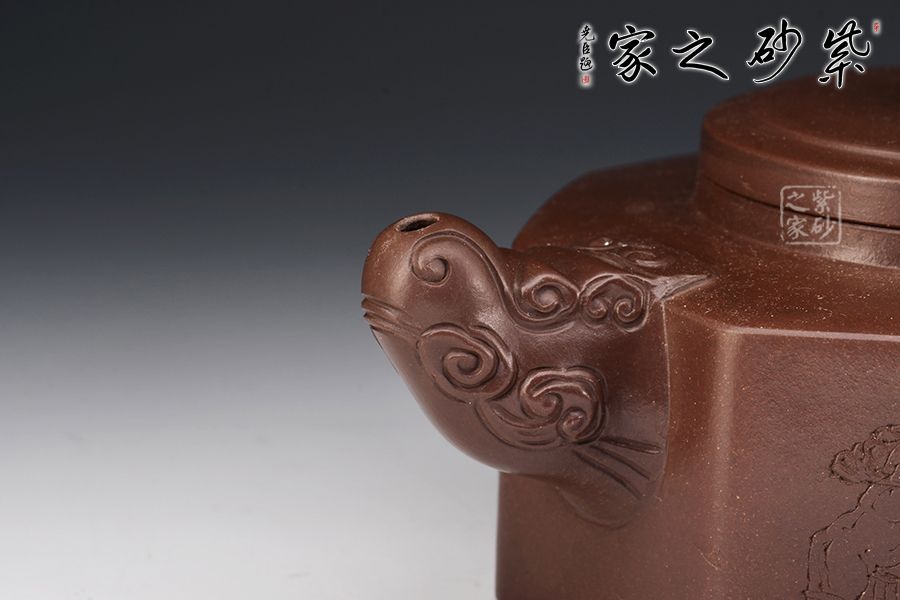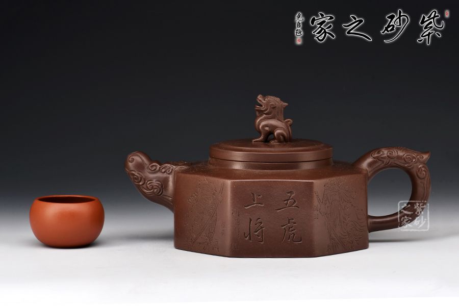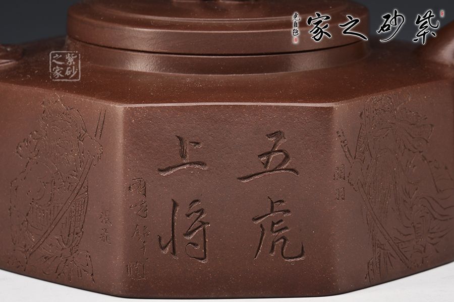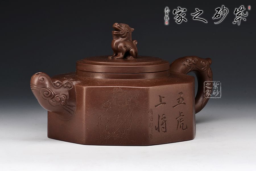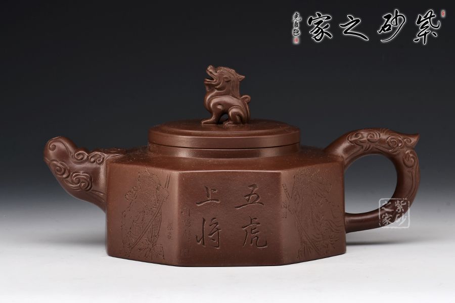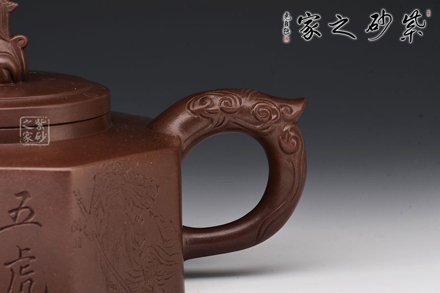 方器成型難度大,棱角分明,費(fèi)時費(fèi)工。此壺型呈六方,塊面挺括,線條利落。壺身刻繪裝飾,并題字“五虎上將”兩者結(jié)合切合題意。壓蓋設(shè)計,一只雄獅做紐,威武霸氣。壺嘴為龍頭,把為龍尾,細(xì)節(jié)精細(xì),值得珍藏。?