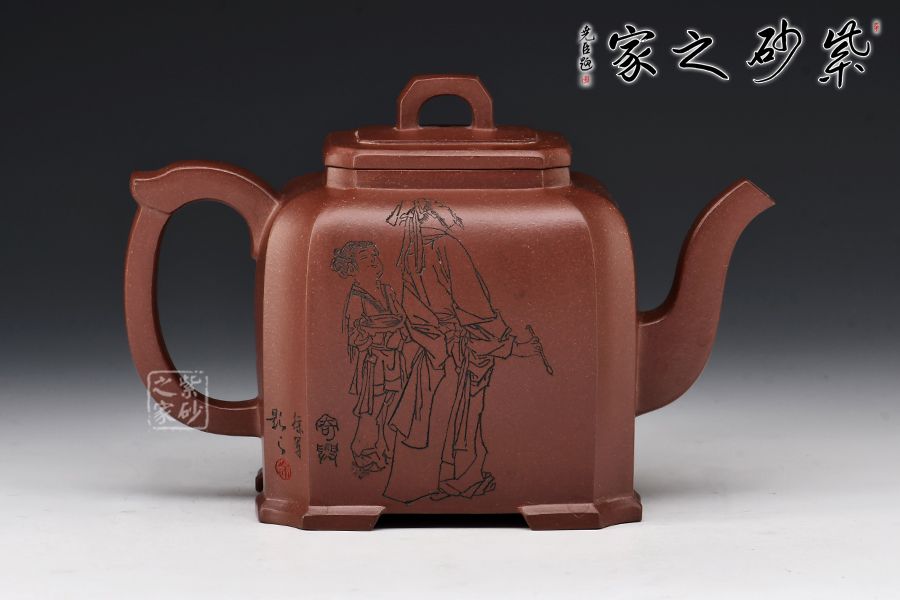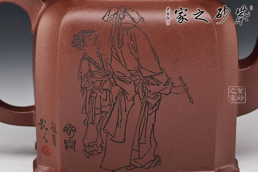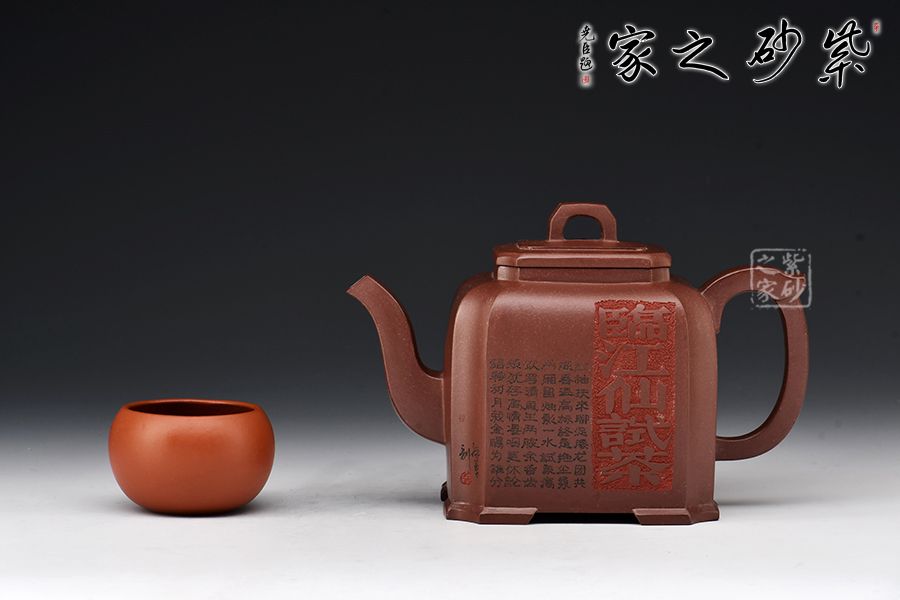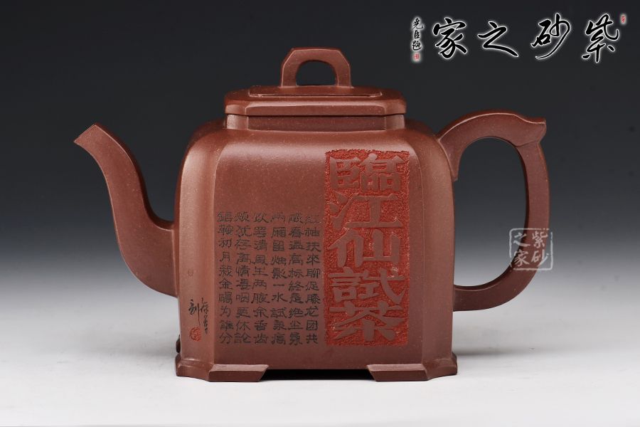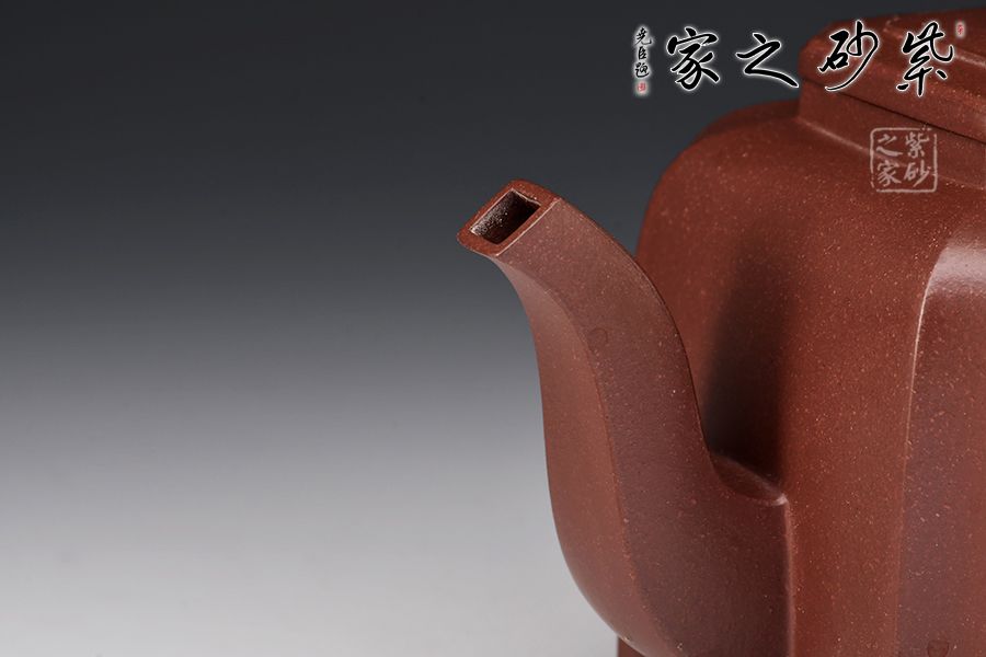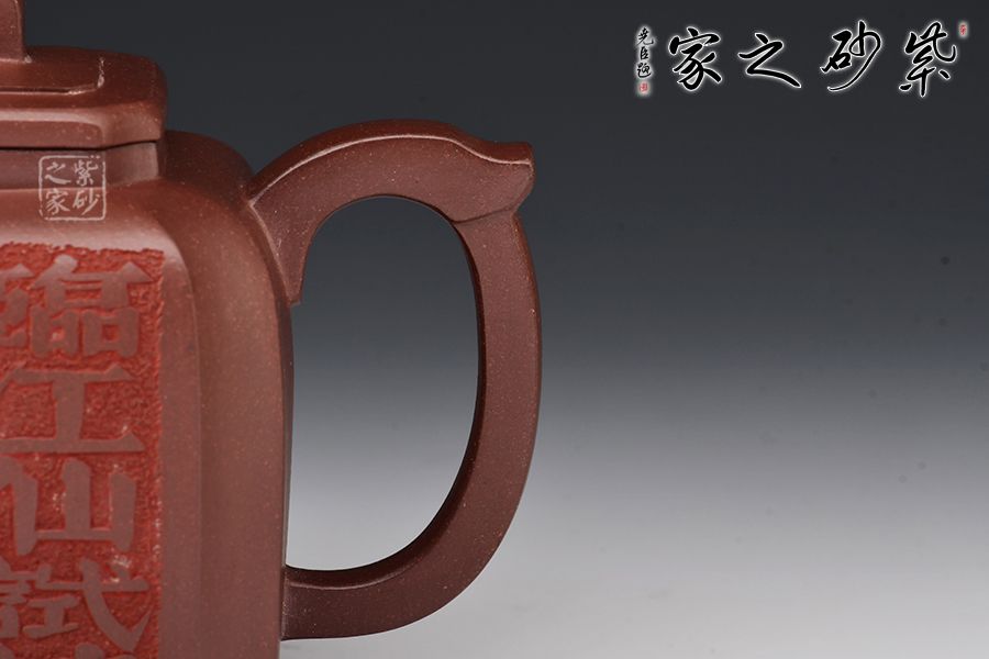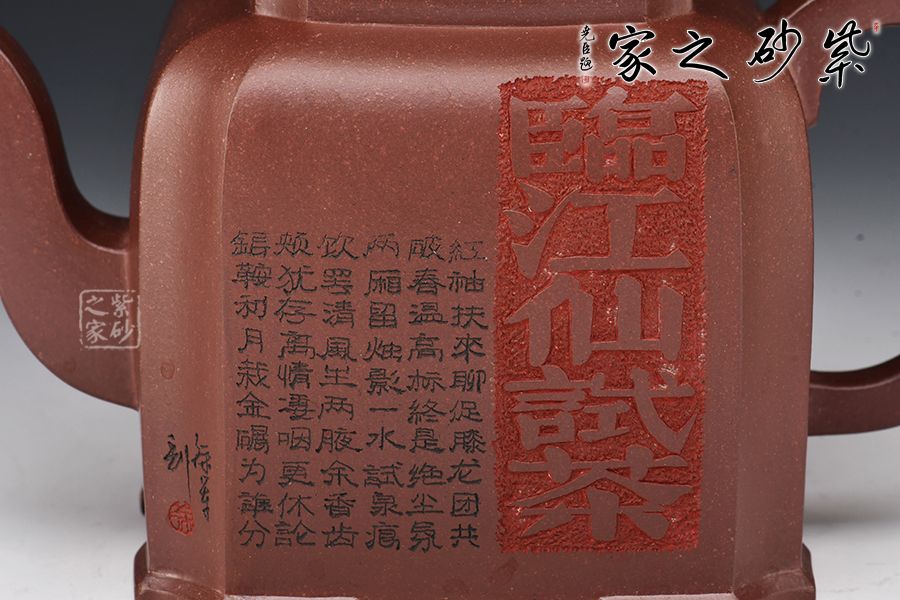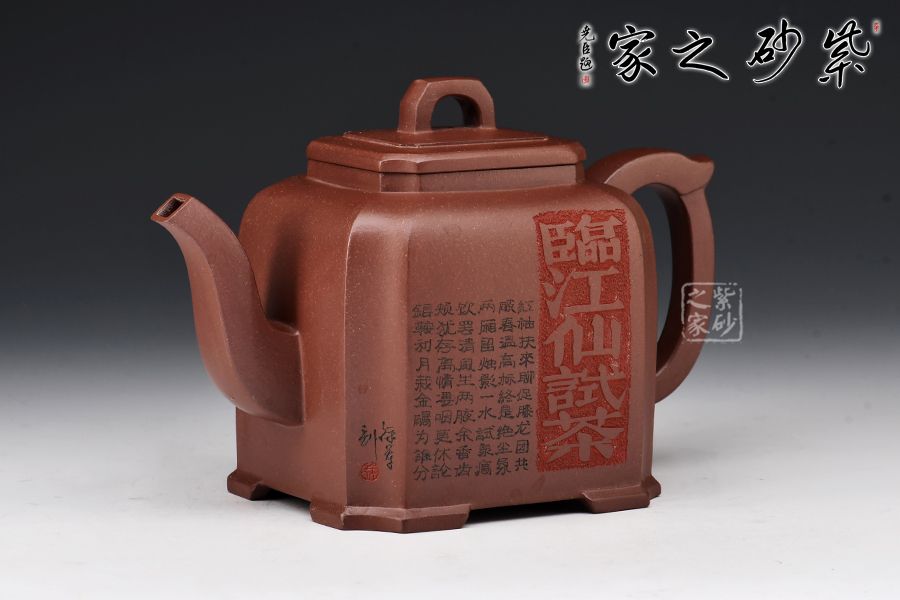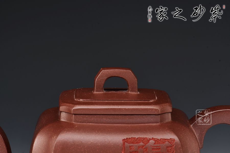 臨江仙四方壺體,端莊大氣。壺身四棱作圓化處理,方蓋與壺身完美結(jié)合,做工精細,對稱和諧,拱形壺紐,高高豎起,拿捏舒適。二彎嘴,出水流暢,飛把拿捏舒適。此器制作難度極大,大氣雄渾,做工嚴謹,技藝高超,氣韻非凡,為方器中的集大成者,實乃典藏之極品。
