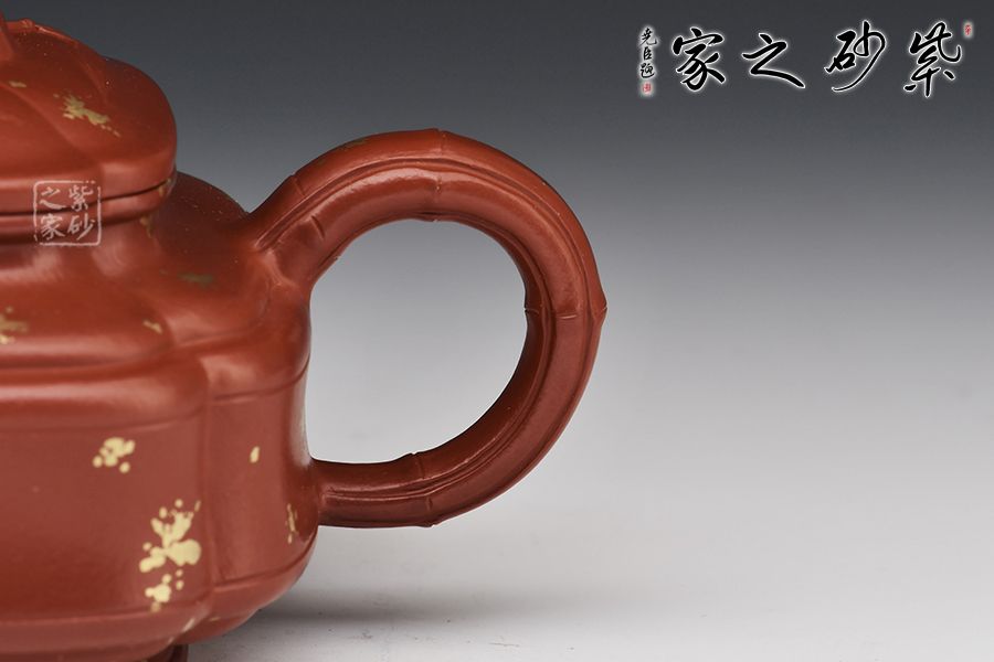 此壺是雙線竹與筋紋的結(jié)合,雙線竹鼓壺是一種傳統(tǒng)壺式,其器形工整,雍容大方。采用稀有小煤窯朱泥制成,該壺底為圈足,四條筋紋將壺分成等四方,從壺蓋至壺底,似菱花造型,竹形鼓身,壺身雙線,飽滿有力。壺肩部凹陷舒展圓潤(rùn),形成端正雅致的氣質(zhì)。一彎嘴、圓把均塑是竹