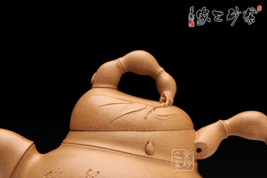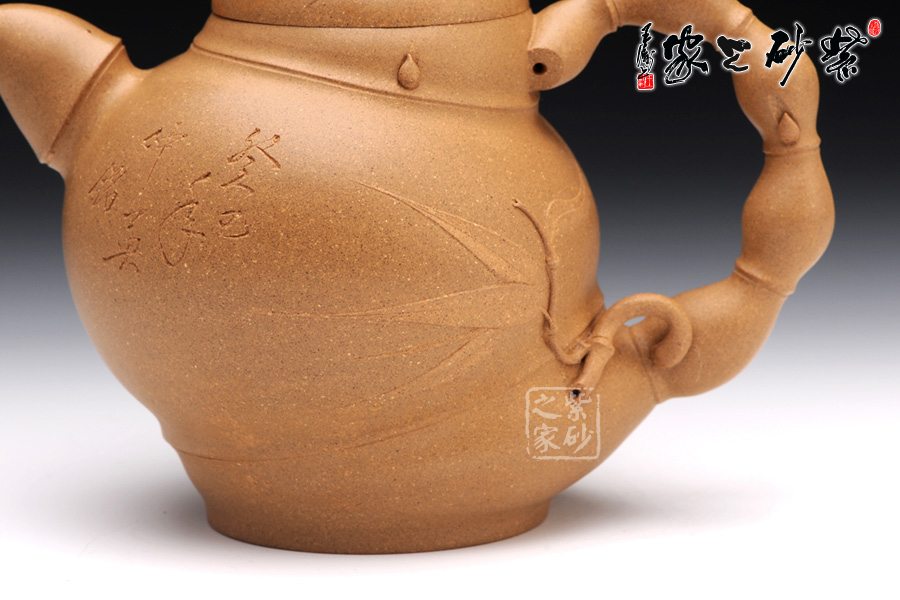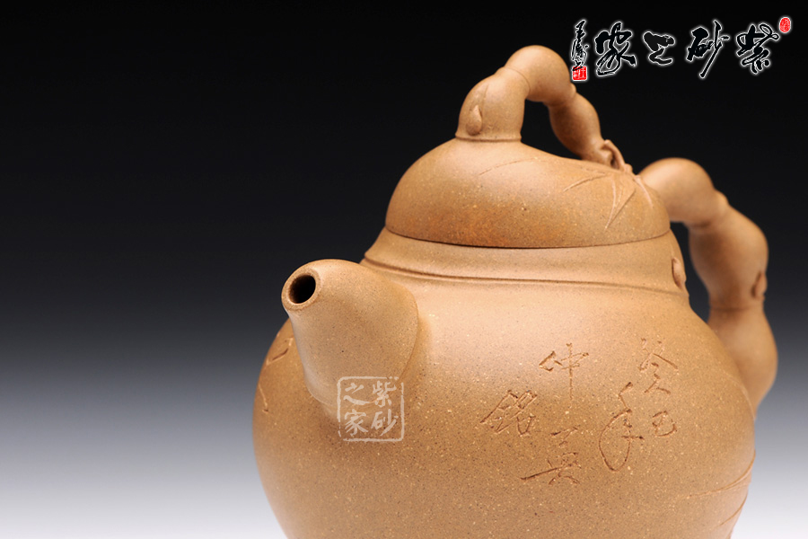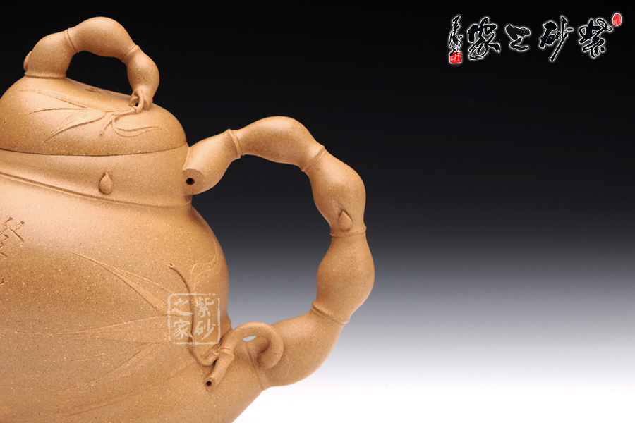 竹的普通造型是挺拔,而此壺的竹卻是圓潤(rùn)。通身上下是弧線組成,然后用竹節(jié)將這些線條連接,如此一來(lái),便能容下佛肚的外觀。大肚圓潤(rùn),飽滿似球,這是經(jīng)典的彌勒形象。在此基礎(chǔ)上,將竹節(jié)收縮、放大或者拉長(zhǎng)、縮小,便有了壺嘴、壺把和壺鈕的多變形態(tài),如此扭曲卻不給人帶來(lái)反感,的確難得。