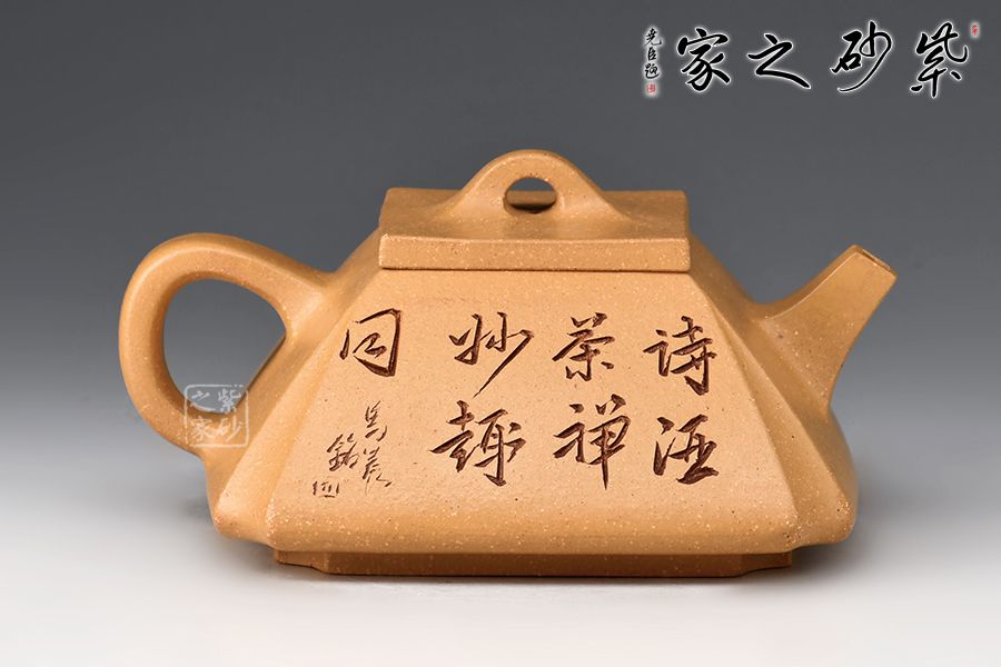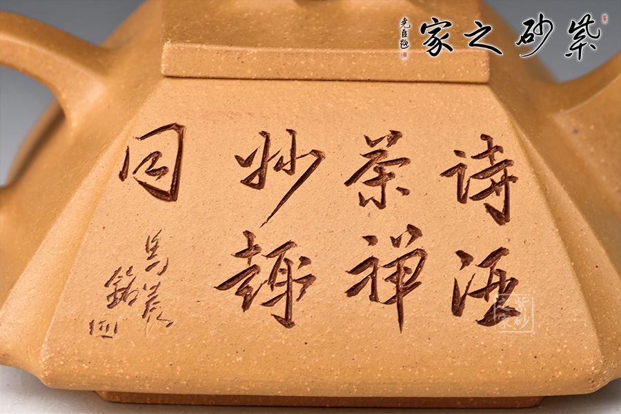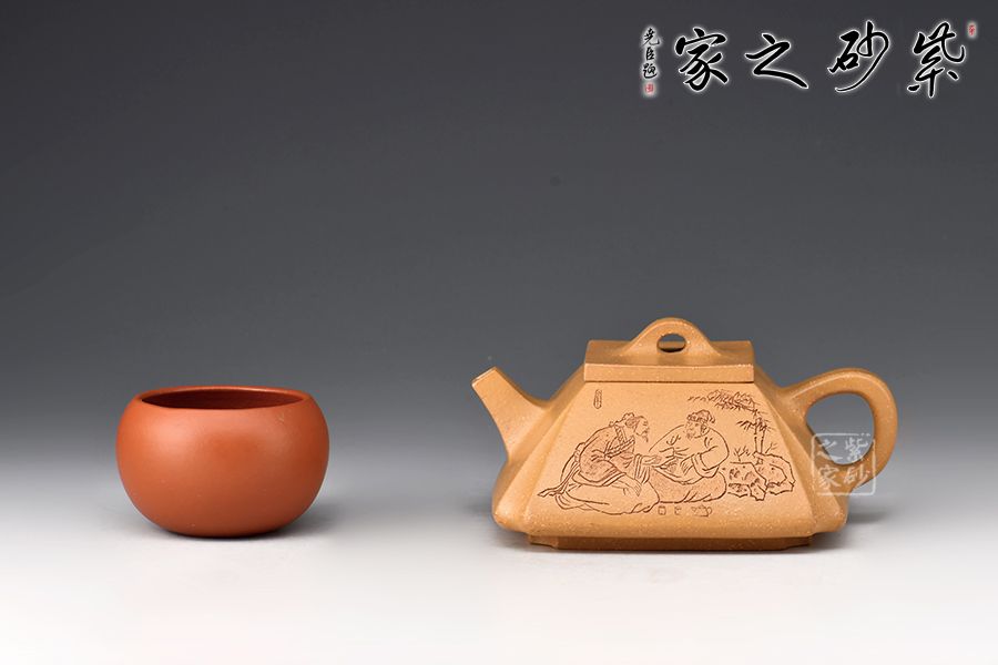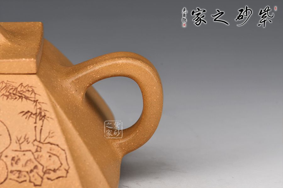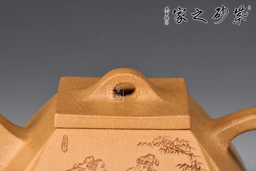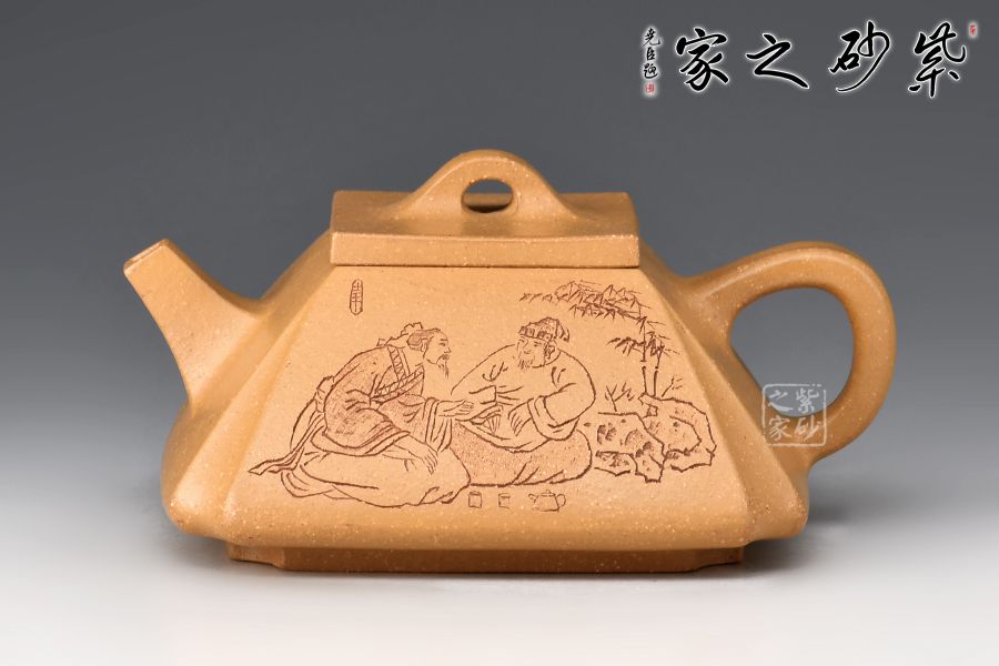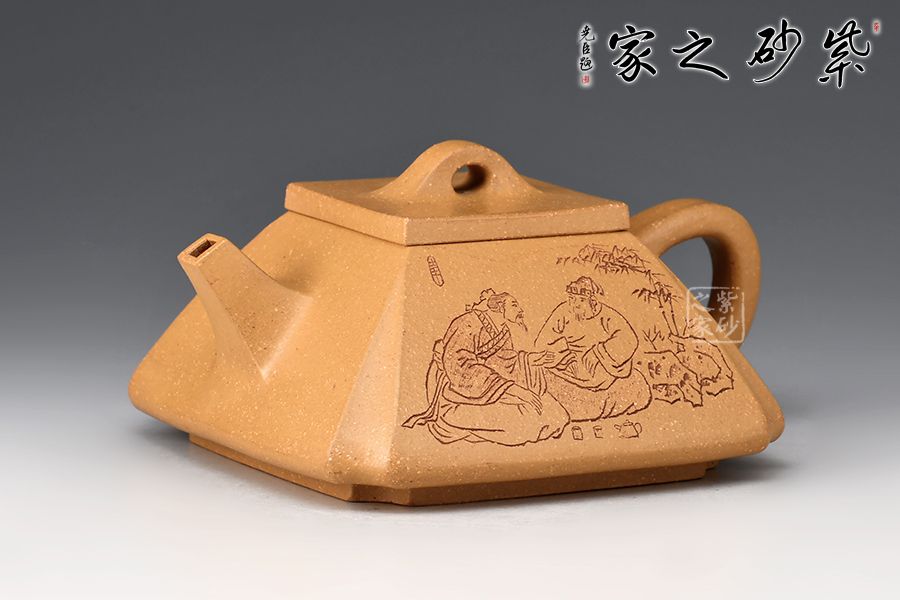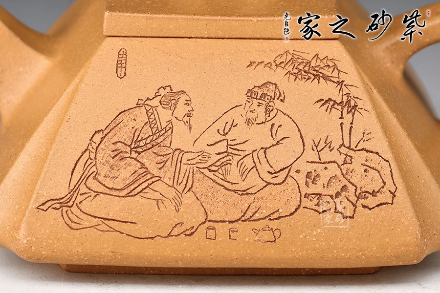 這款壺四方型正,抽角塊面富有張力,線條清晰有勁,塊面分明,過渡自然。整器上下照應(yīng),氣韻貫通,完美詮釋了方與圓結(jié)合的完美藝術(shù),壺身刻繪老者氣定神閑,趣味十足!