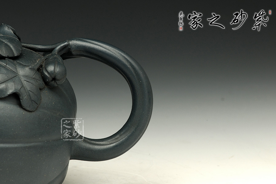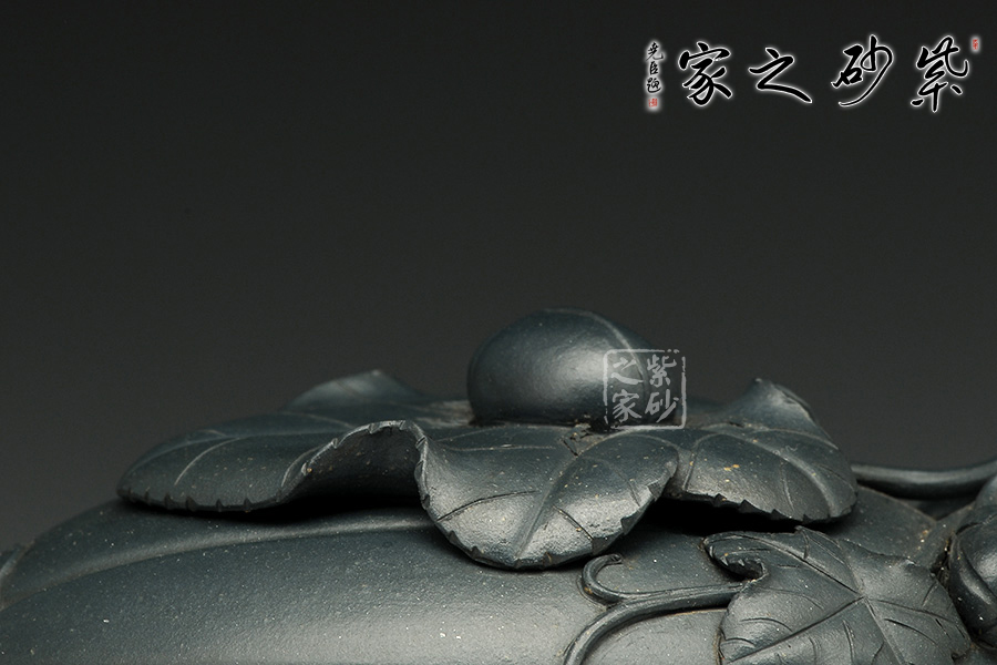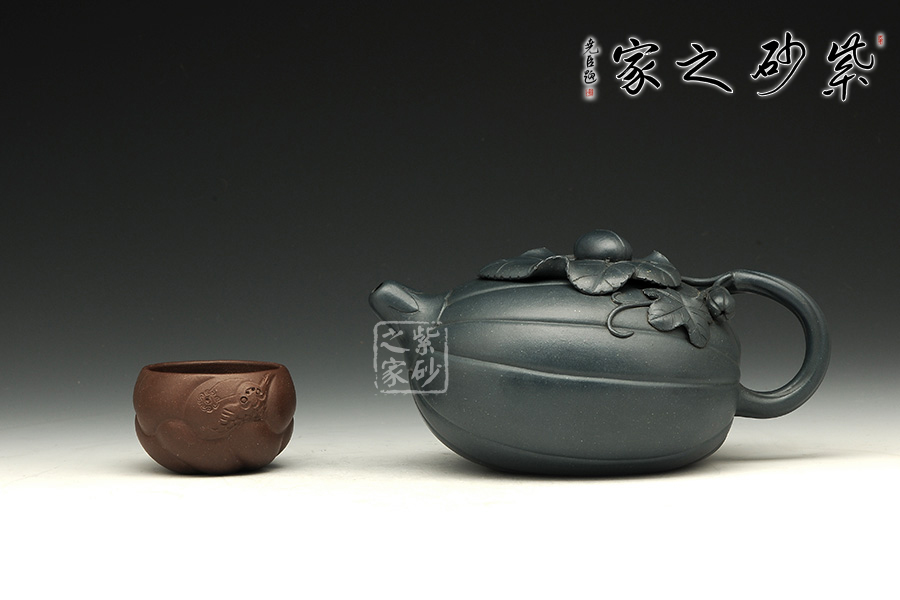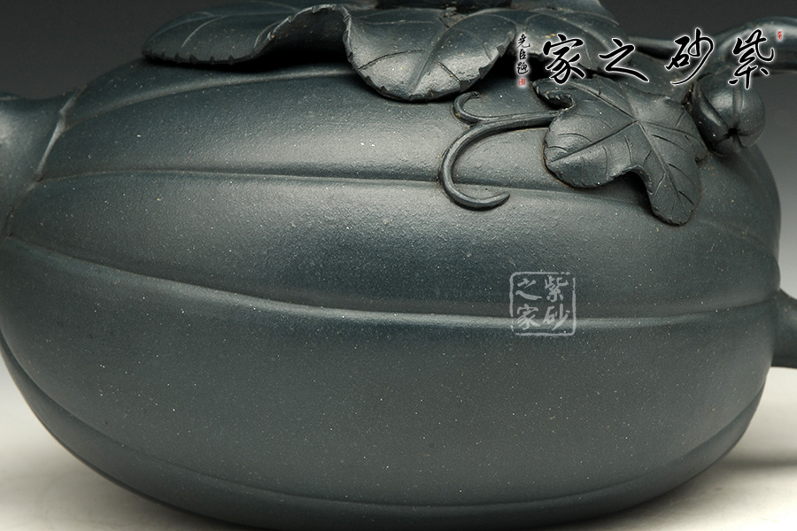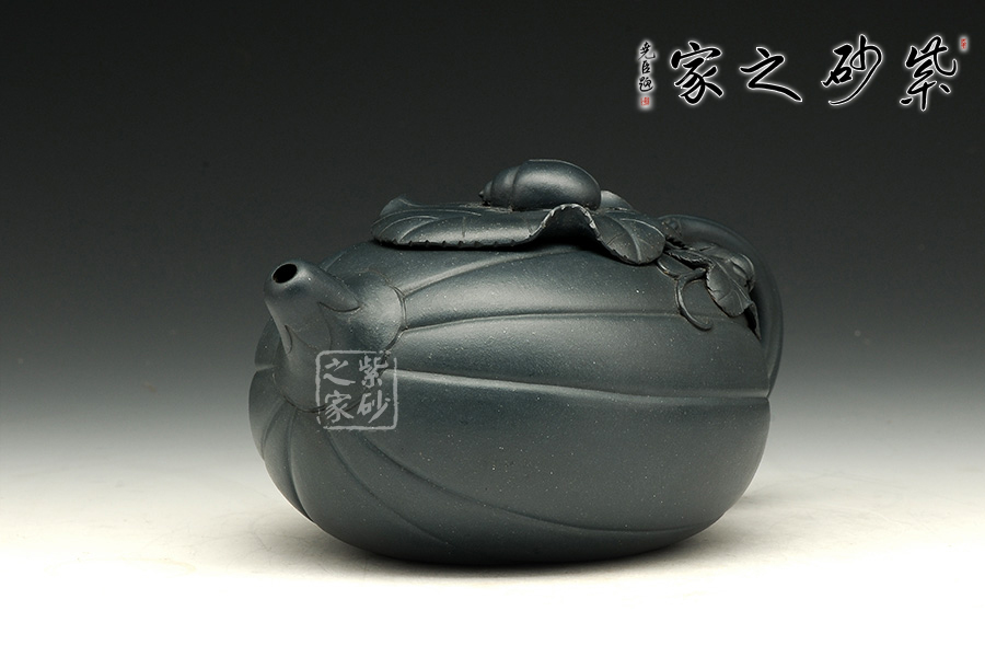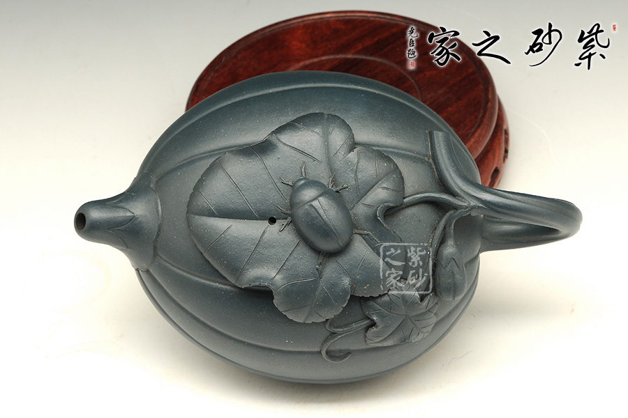 此壺制于90年代,是葛陶中與妻子李惠芳合制的一款作品,一般金瓜壺皆為樹立的金瓜造型,而葛陶中定要以最淳樸自然的造型制成此壺,所以取材于瓜地里還未摘下的金瓜,藤蔓卷曲,葉片豐腴,蟲兒栩栩如生,方得此作。仿金瓜的形狀創(chuàng)作,壺身的裝飾表現(xiàn)出其生動形象的生命體,壺身筋紋像極了金瓜的紋路,瓜藤作把,瓜葉當蓋,瓢蟲成鈕,自然成趣。