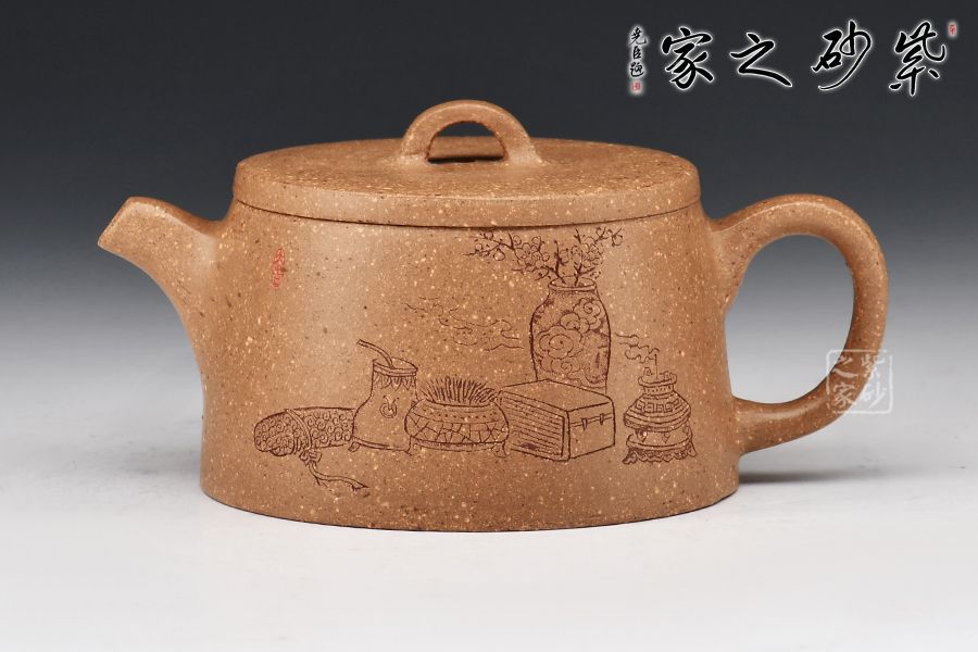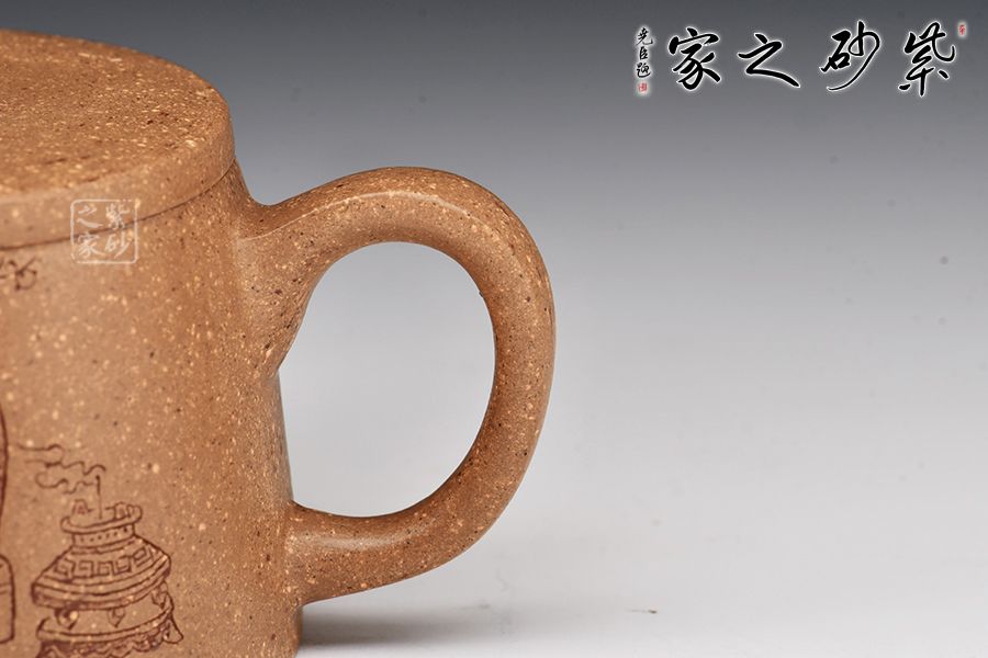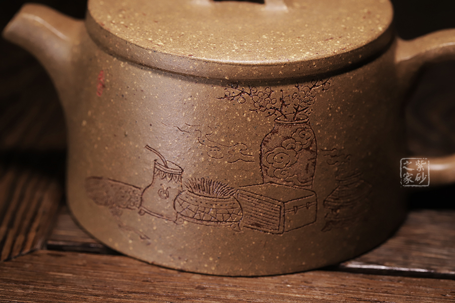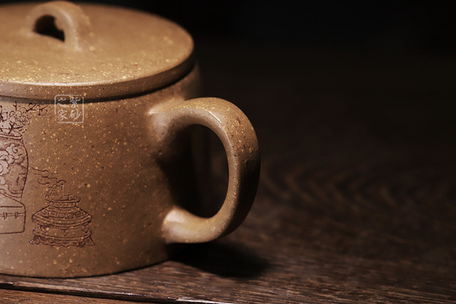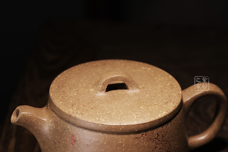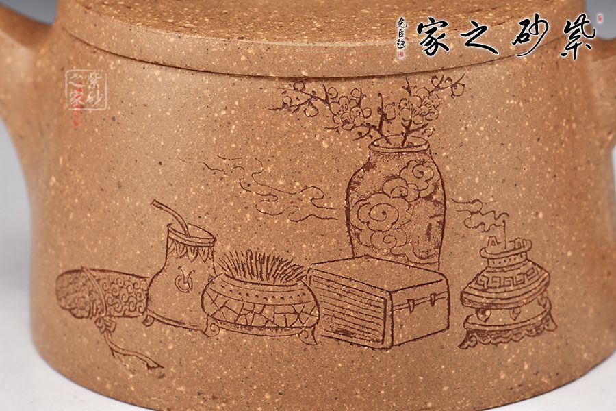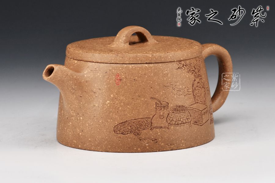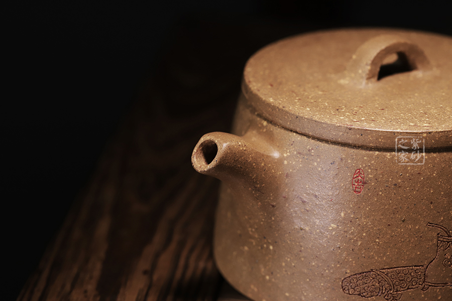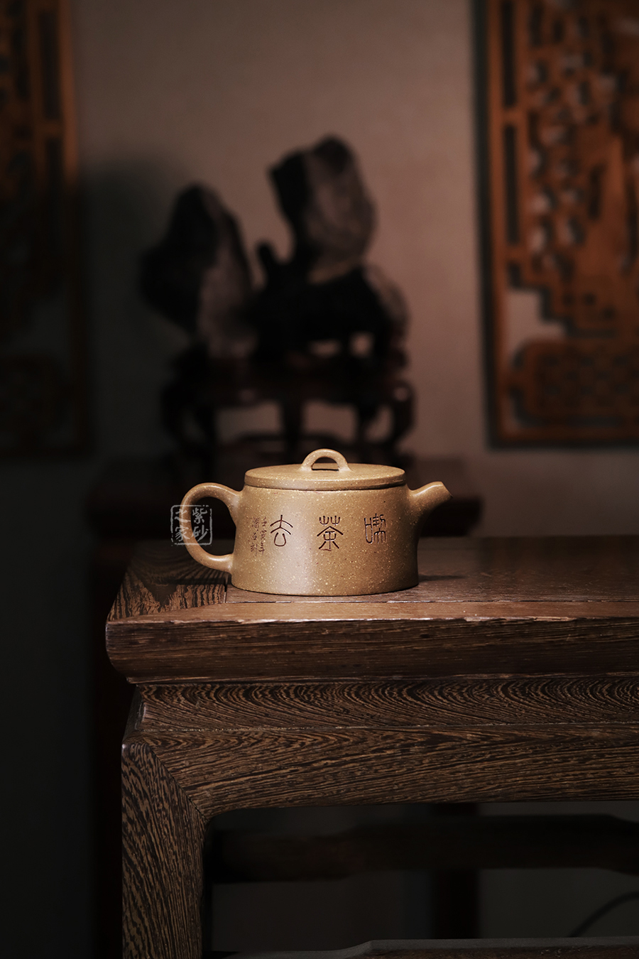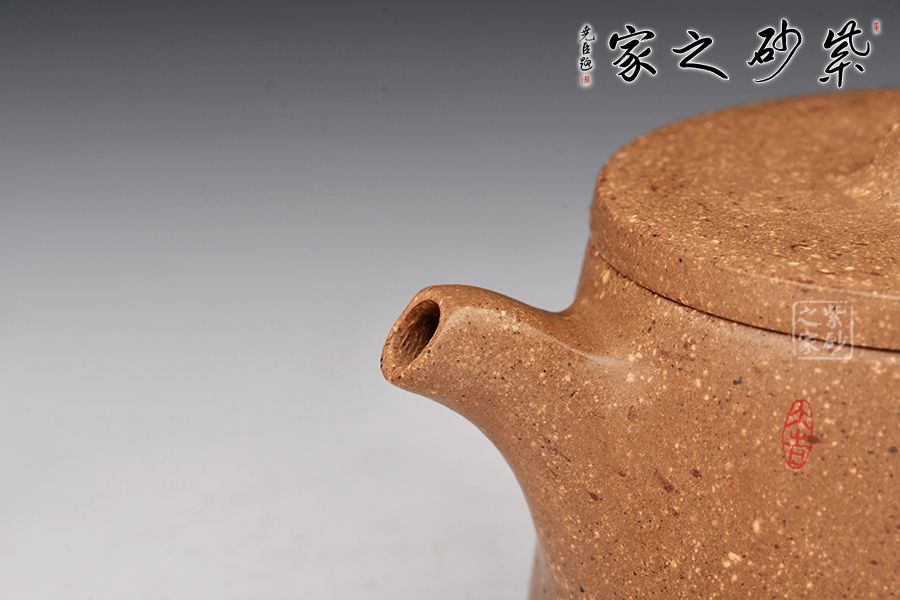 此壺精選五彩砂,全手工精制而成,泥料稀有,細(xì)膩溫潤,若隱若現(xiàn)的金砂,彰顯古樸之味。壺身呈圓柱狀,線條圓潤有力,簡潔明快。嵌蓋之上,橋型形鈕挺拔矗立,彎流俊俏胥出,出水爽利,耳把端莊秀麗,端握舒適。比例精湛,氣韻內(nèi)斂,雋永耐看,成色潤澤,易于泡養(yǎng),是一把非常實(shí)用的殺茶利器,值得入手。