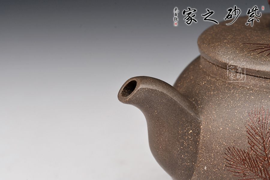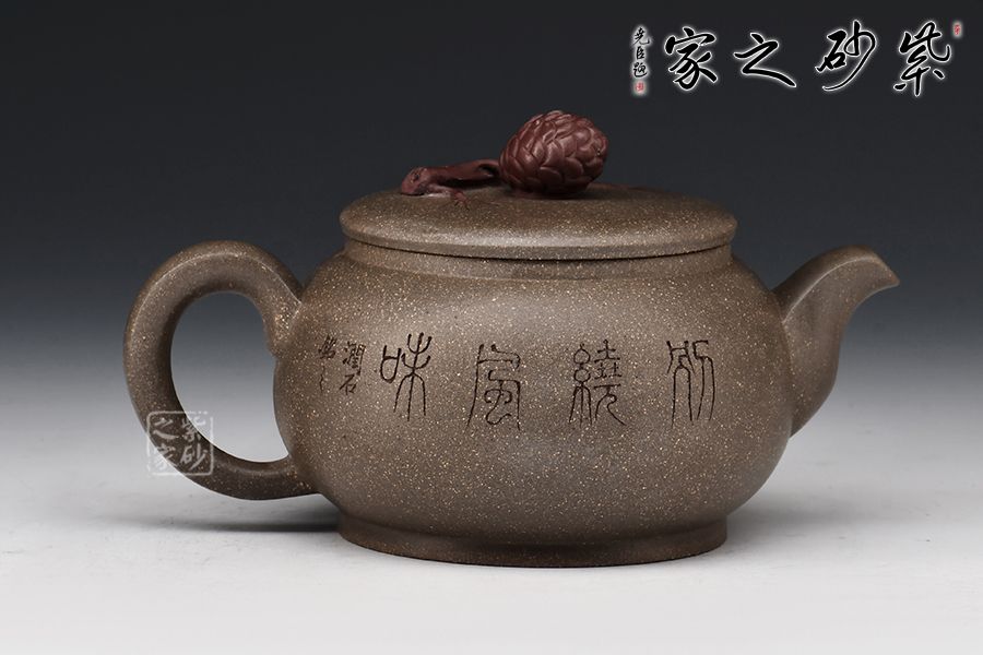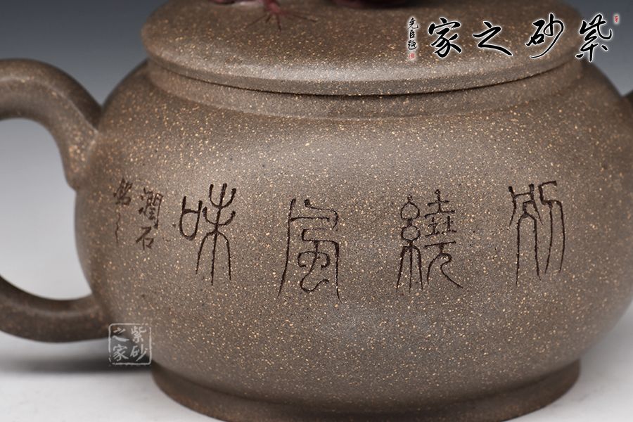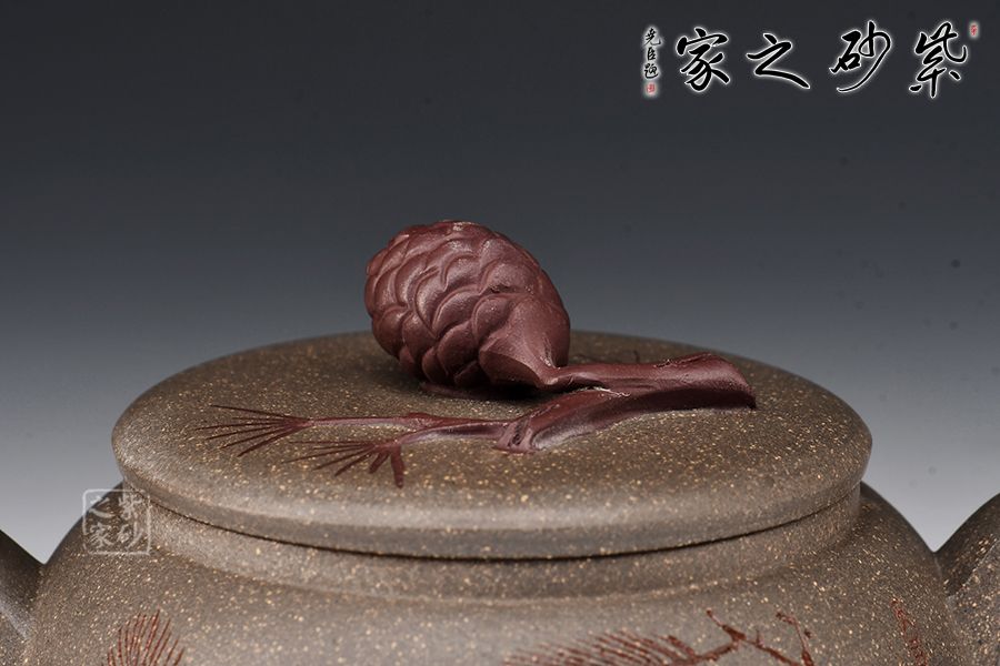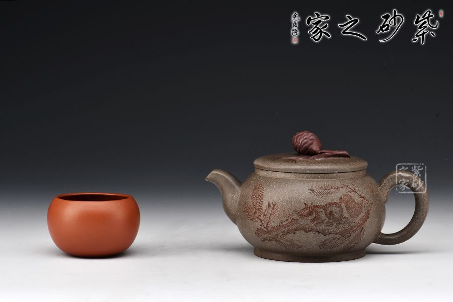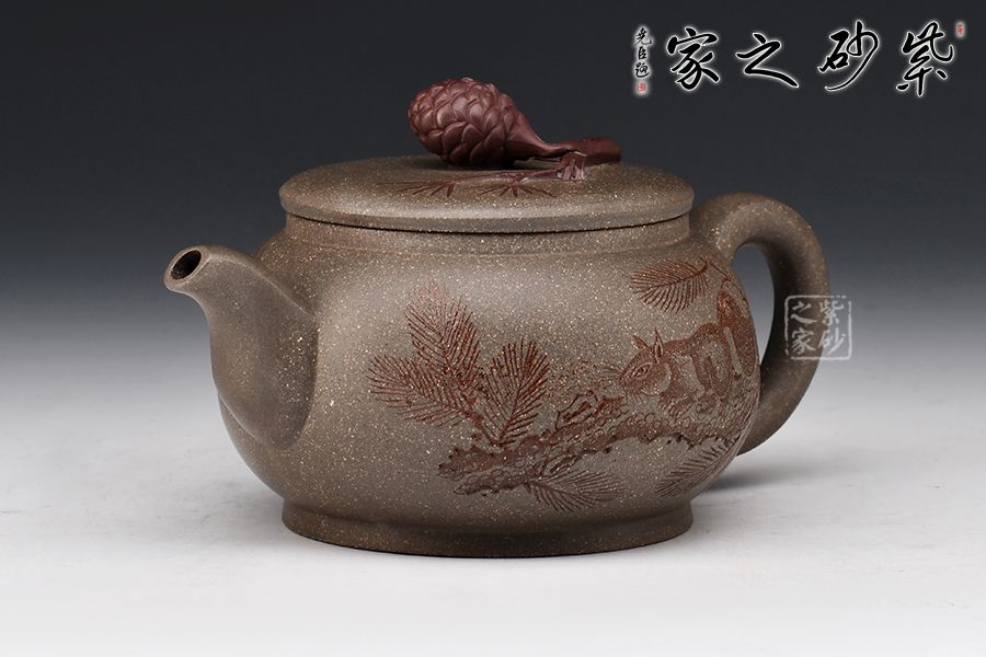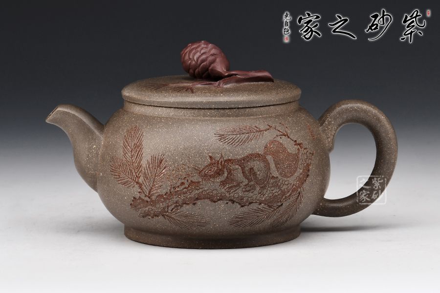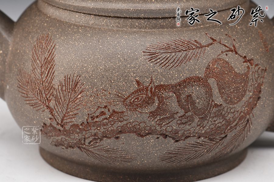 壺身呈圓柱形,圓潤飽滿,上斂下豐,圈足底,彎流嘴向上,出水爽利,耳形把端拿舒適,平蓋設(shè)計(jì),氣密性強(qiáng),壺鈕 的獨(dú)特設(shè)計(jì)與壺身渾若一體,壺腹刻繪淘氣松鼠,自然有趣!