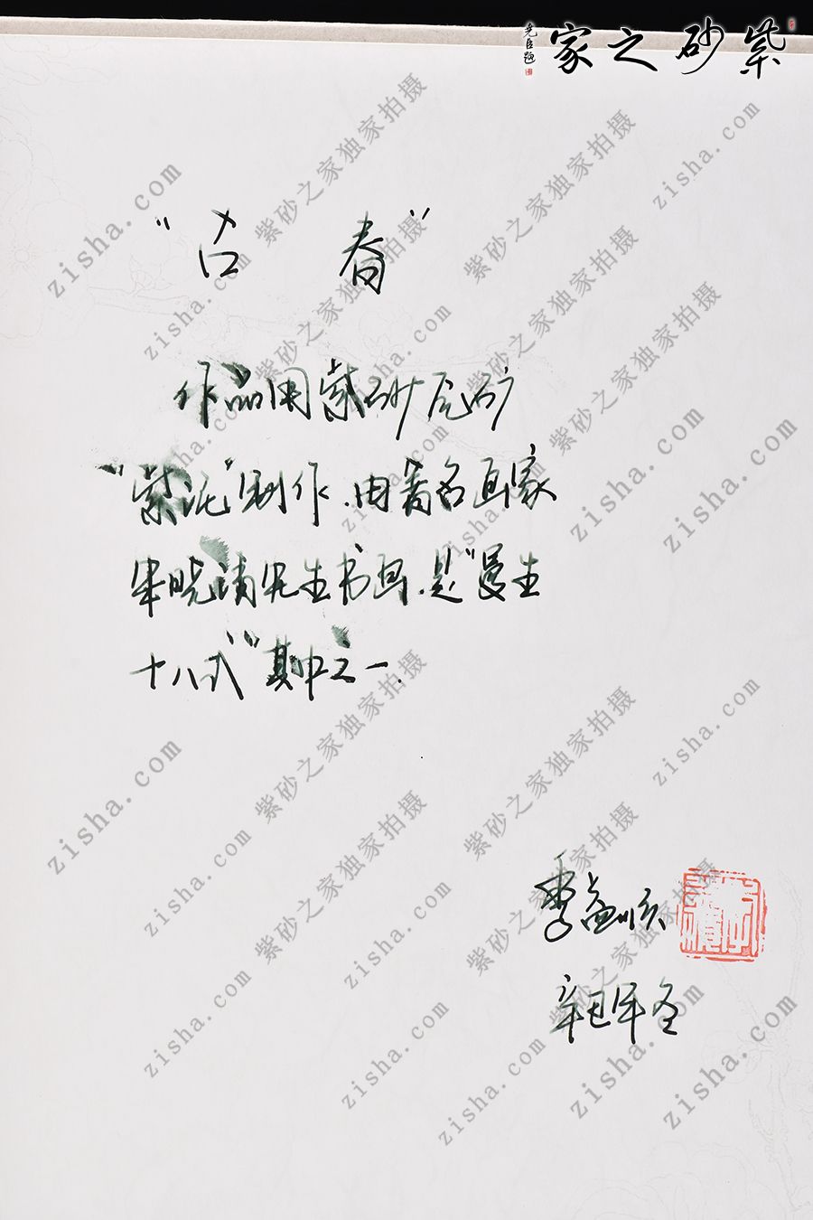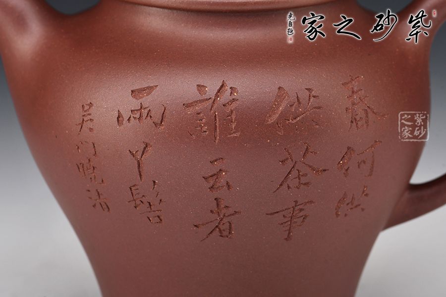 古春,曼生十八式之一,傳統(tǒng)經(jīng)典壺。 古春壺之美,首先是造型美。整器形態(tài)猶如佳人般亭亭玉立,壺身上滿下斂成底,高挺峻拔,壺蓋微隆壓蓋于壺口,良好的密閉性。壺鈕珠圓玉潤,靈動而富美感。彎流壺嘴斜出自然,勢頭微微收斂,圈把渾厚,彎曲有度,張力十足。 其次是是壺名”古春壺”,古者,古樸典雅;美者,青春之美,一如其壺型。 再其次是其壺銘:“春何供,供茶事,誰云者,兩丫髻”,言簡意賅,畫面生動,丫環(huán)的純樸活潑躍然紙上。其意與壺名有關(guān),與茶有關(guān),切壺,切茶。