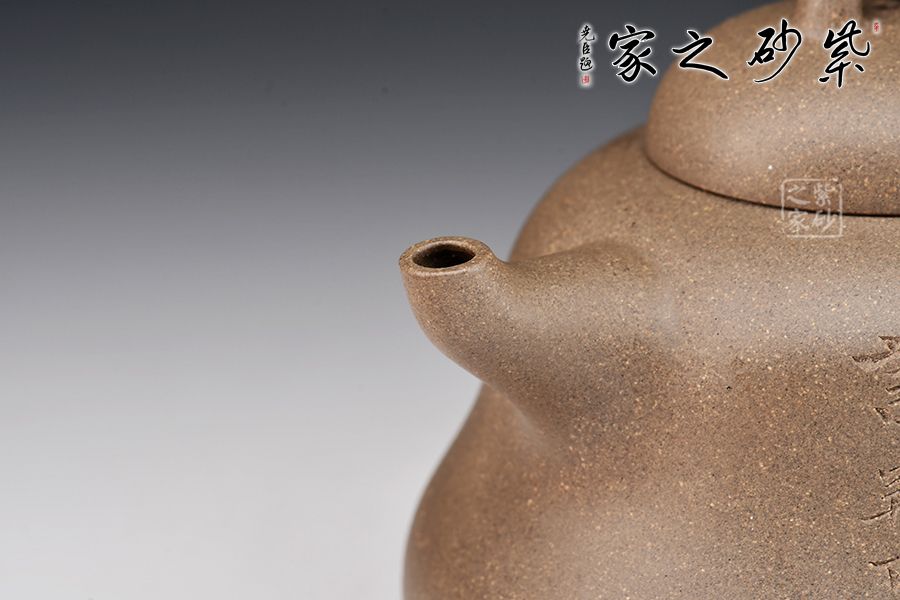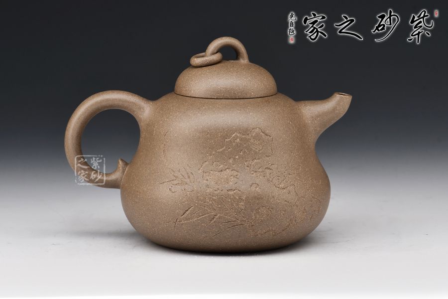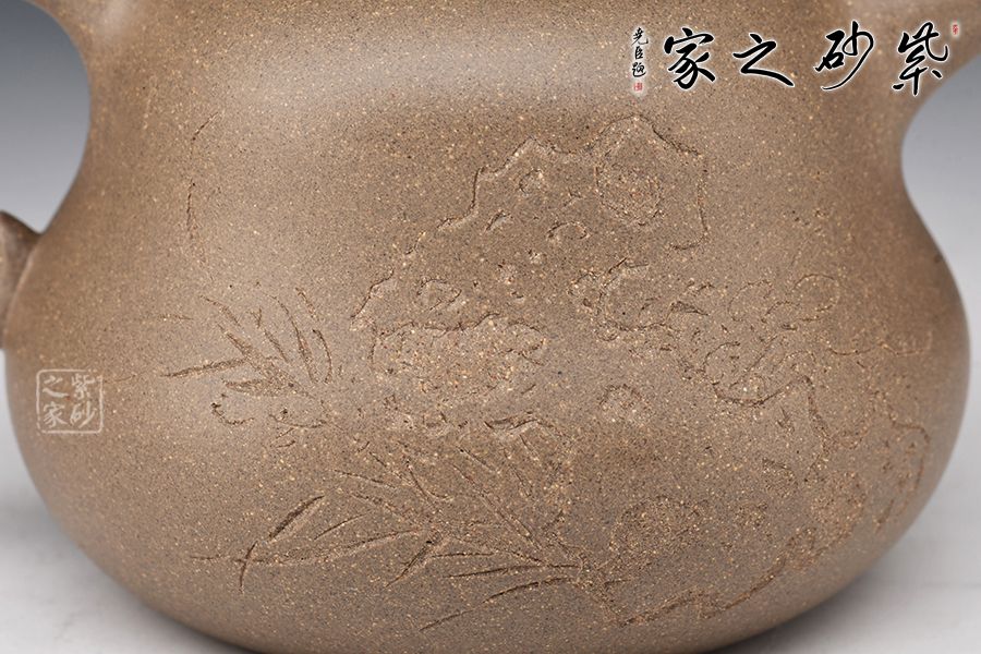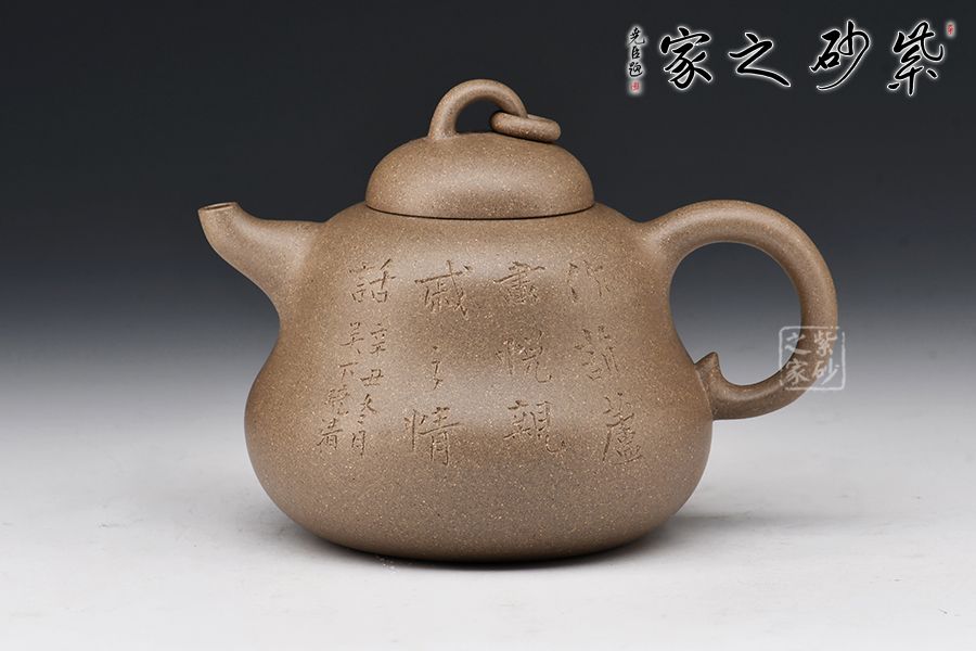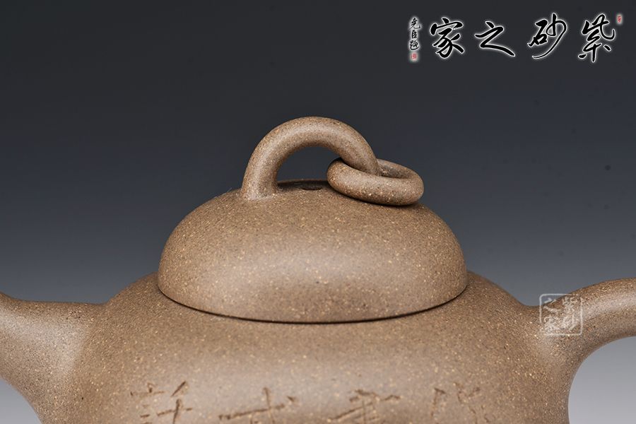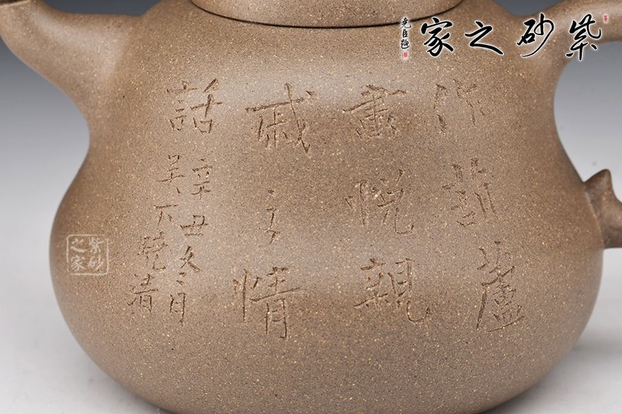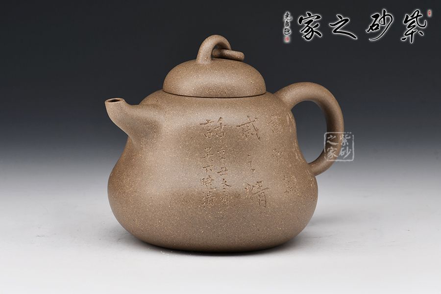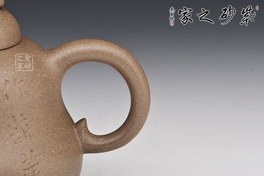 曼生壺材質(zhì)為紫砂,壺體設(shè)計新穎。造型呈葫蘆狀,壺流短直而微向上翹,把成半環(huán)形,蓋頂設(shè)有套環(huán)鈕裝飾。整器形制的線條以渾圓為主,十分流暢。