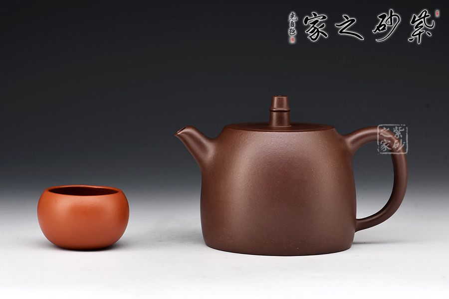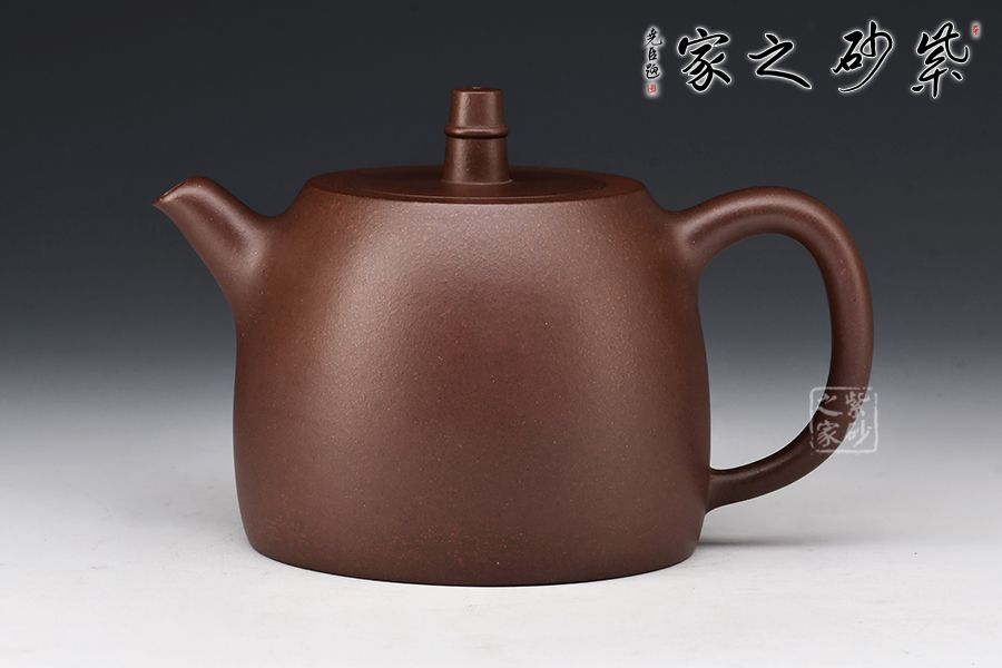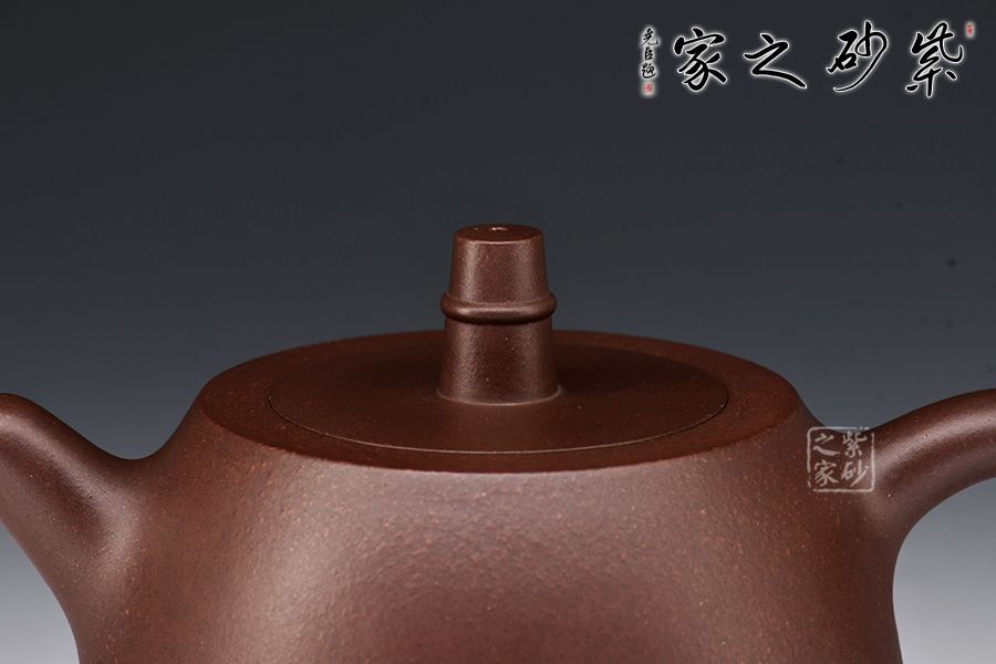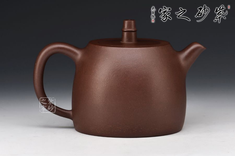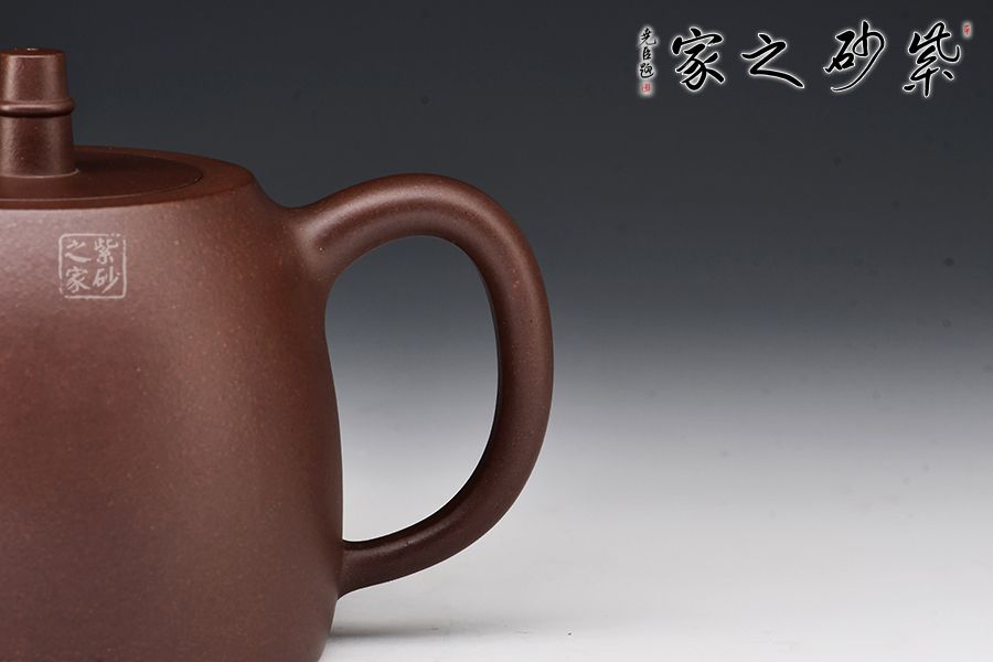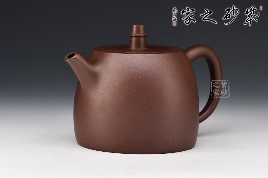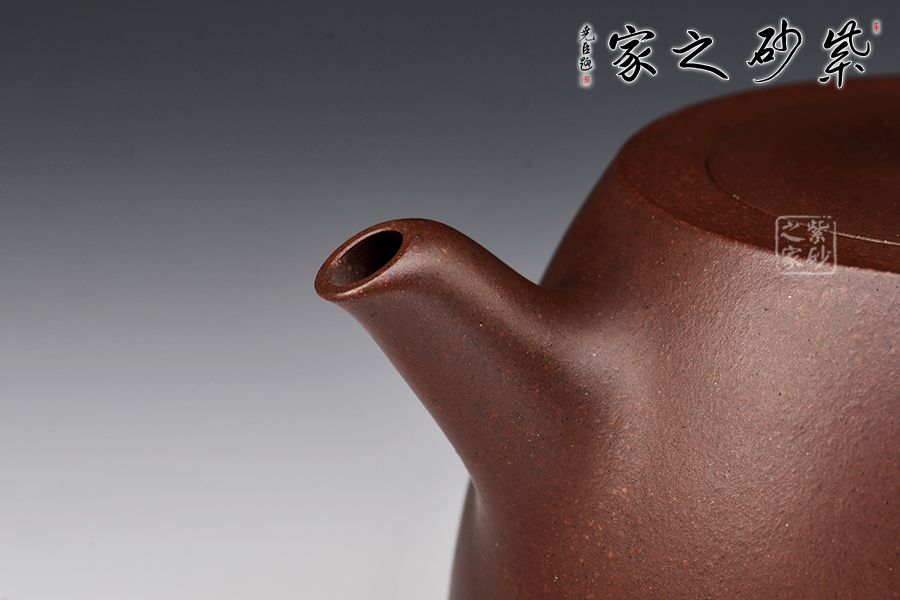 壺型源自漢代之“鐸”,呈上斂下寬的圓柱之形,壺肩與嵌蓋完美吻合,嚴絲合縫。直挺的柱鈕,與壺身之形相呼應(yīng),揭拿便利。直流挺括昂揚,弧線優(yōu)美,出水爽利,彎把剛?cè)岵瑴喓裼辛?。蓋、鈕、流、把相輔相成,卓顯整壺雄渾氣度。整器古拙樸雅,色澤層次豐富,韻味獨特,是一把非常實用的殺茶利器。