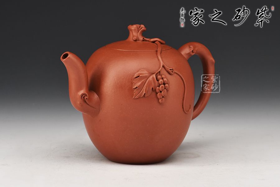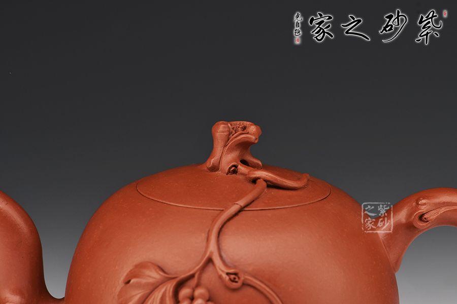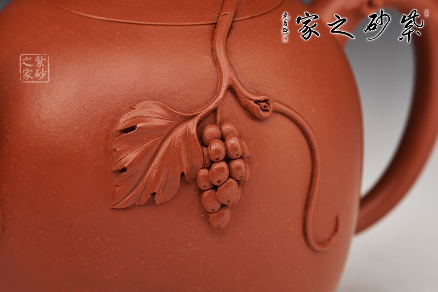 壺身圓潤飽滿,嵌蓋設(shè)計,嚴(yán)絲合縫。壺鈕宛若枝干虬曲而出,葡萄自上而下垂掛著,果實累累。整器制作精美,氣韻飽滿,意趣盎然,充分展現(xiàn)作者花塑器技藝之精湛,欣賞、把玩、使用皆宜。