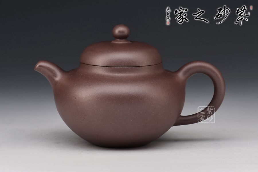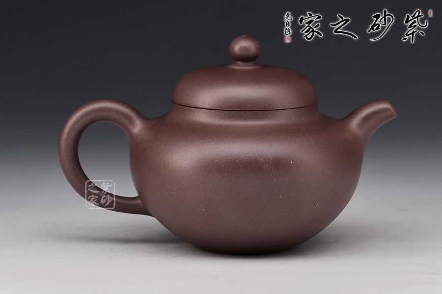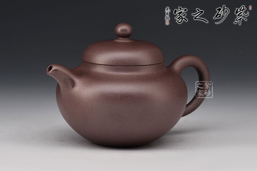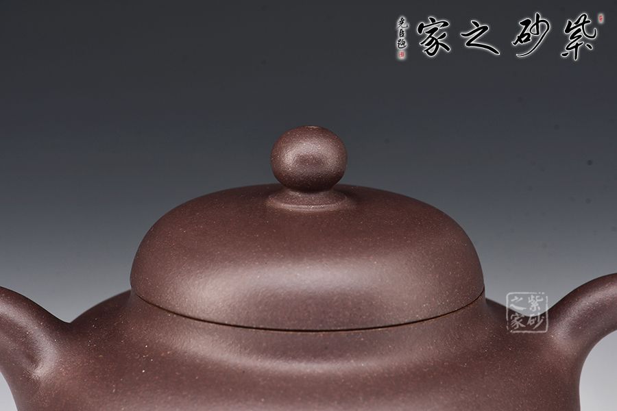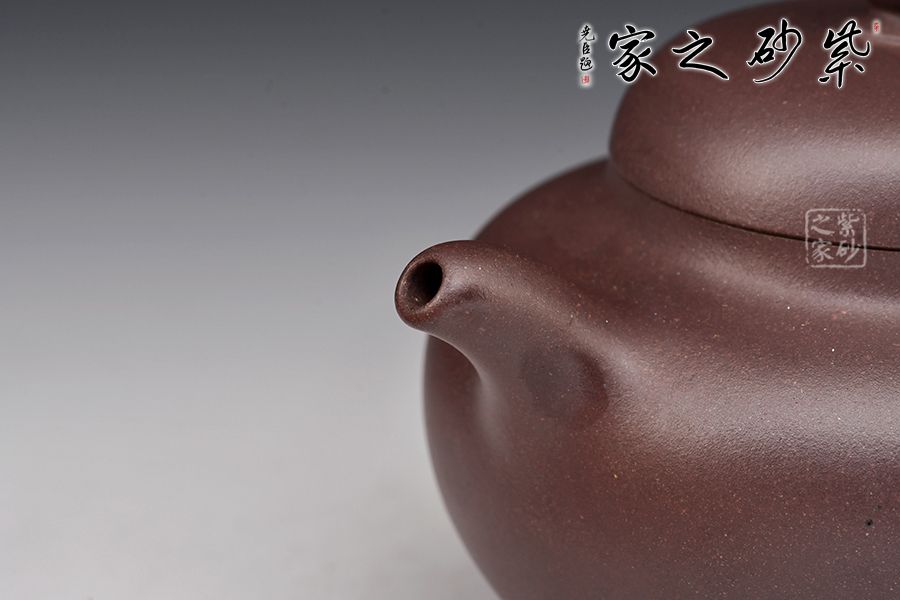 此柿圓壺壺身圓潤飽滿,上下收斂。圓鈕、彎流、耳把比例恰到好處,與整體形成和諧之美。作者全手素器功力深厚,整器線條周轉(zhuǎn)柔順,氣韻通貫,于簡約之中,透出一種自然質(zhì)樸之味,表以事事如意、萬事亨通的美好寓意,成色佳、易泡養(yǎng)、上手舒適,是一把賞用皆宜的殺茶利器。