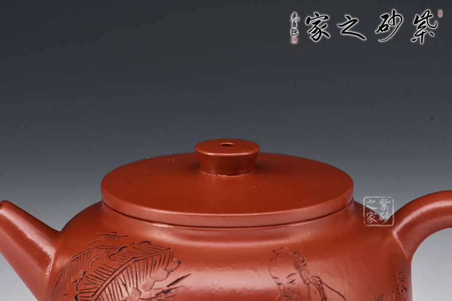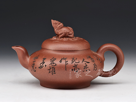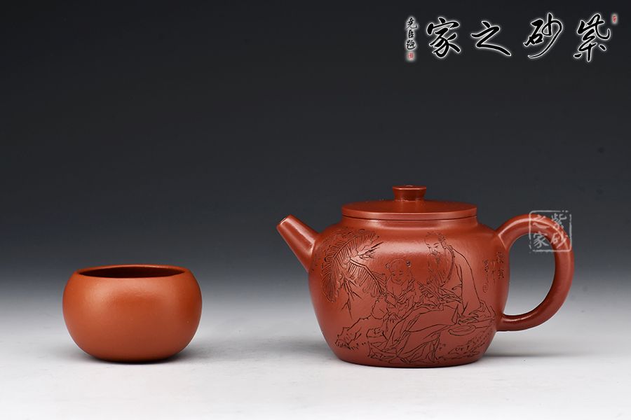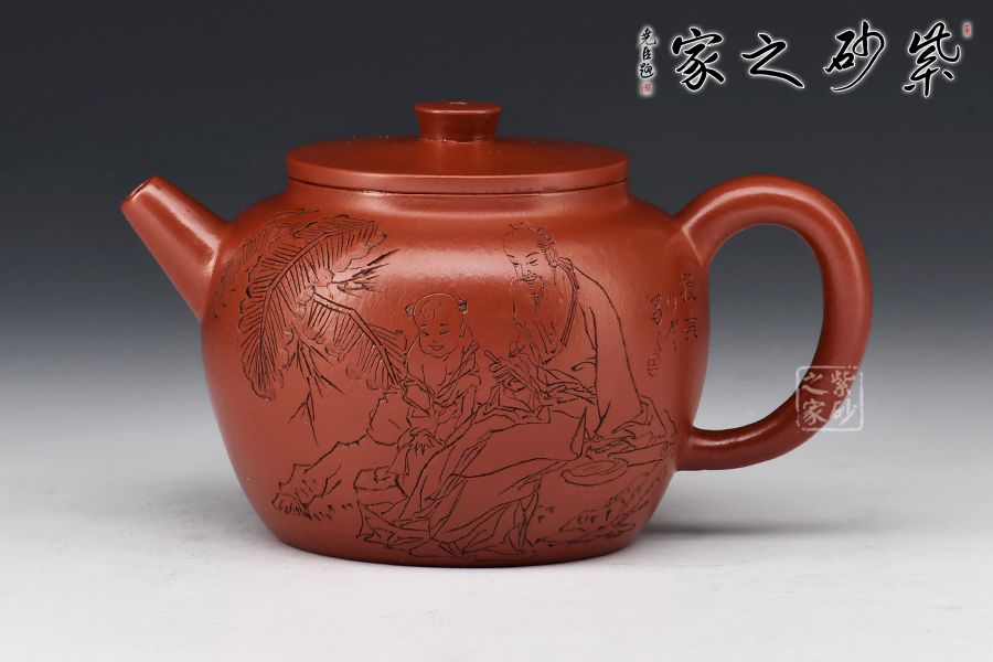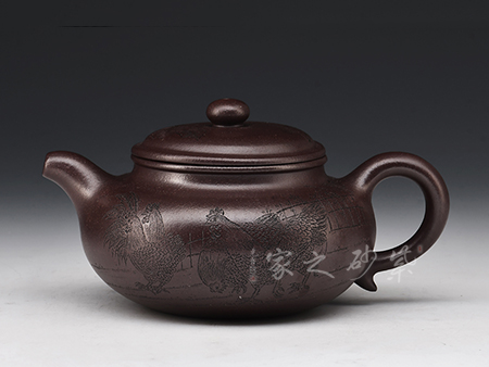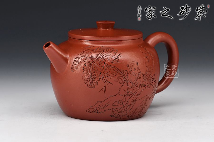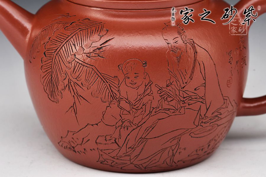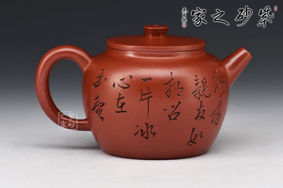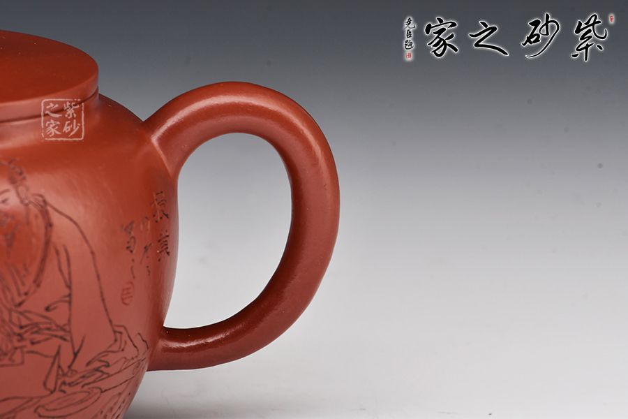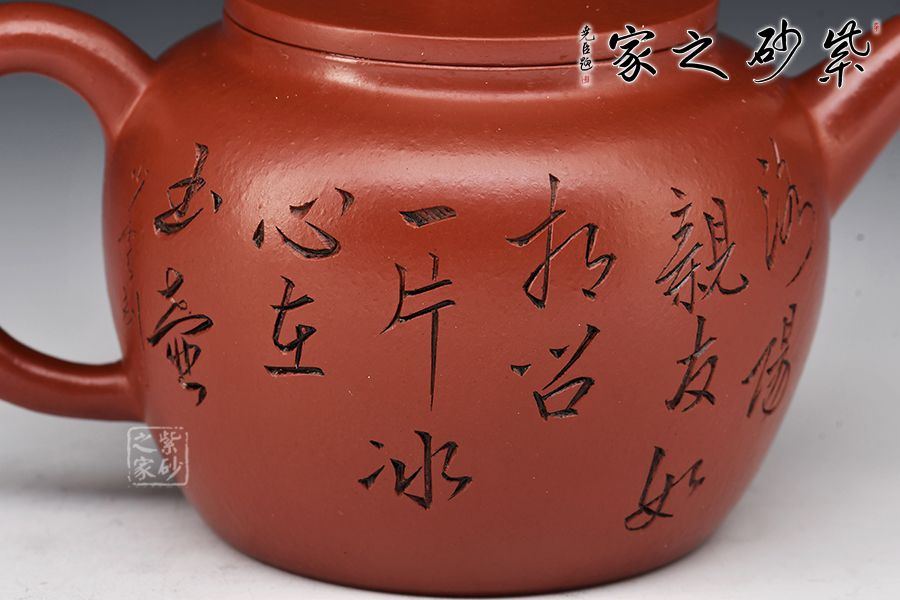 大紅袍所制,紅潤有光,壺身圓潤,線條流暢,直嘴短小古雅,耳把拿捏方便,不易脫手,結實牢固。壺身雙面刻繪,筆鋒蒼勁有力,推薦收藏!