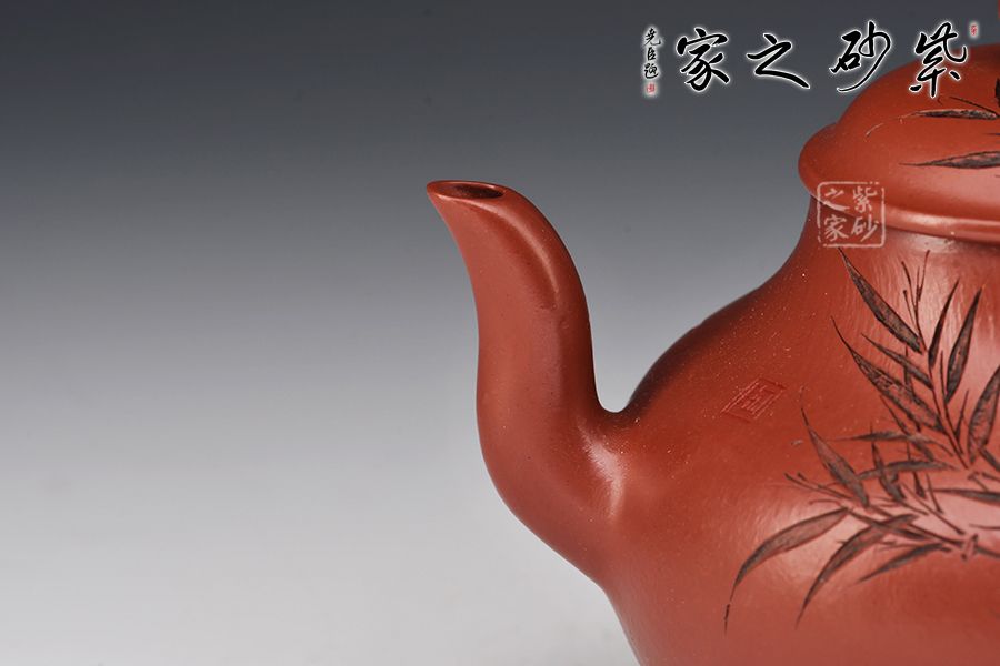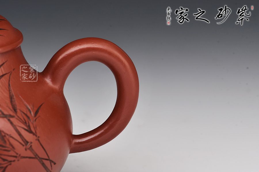 此壺大紅袍作胎,觸之溫潤(rùn),上手舒適。壺身氣韻飽滿,上下收斂,口蓋寬大,利于投茶。圓形口蓋、頸部圈線與底部圈足相映襯,使整體視覺更具層次感。珠鈕、彎流、耳把比例相得益彰,簡(jiǎn)約中透出古雅。好料好工,出水爽利,實(shí)用性強(qiáng),是一款超性價(jià)比的殺茶利器。