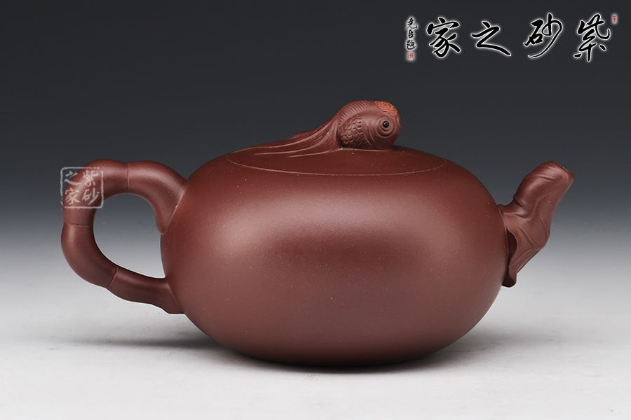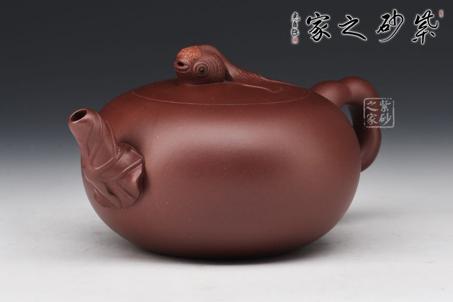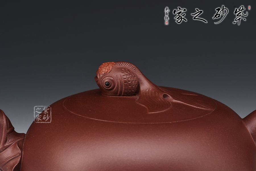 壺身圓潤飽滿、晶潤溫婉,憨態(tài)可掬。壺嘴貼花荷葉與荷花瓣的把手、鯉魚跳躍的壺鈕相映成趣、自成一體,動與靜相結合,又有空間立體感,讓人無限遐想。簡約的造型又不簡單,與主題寓意“年年有余”相吻合。