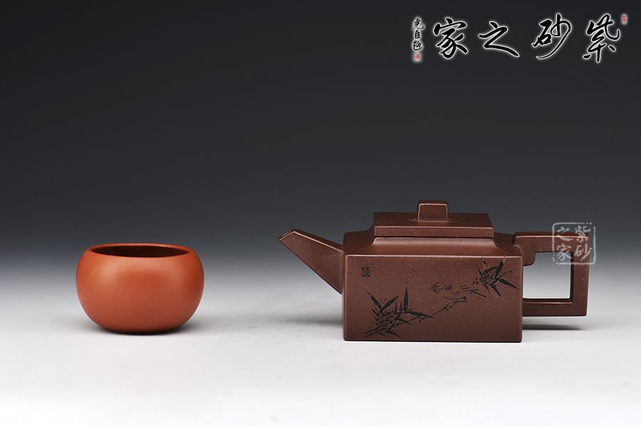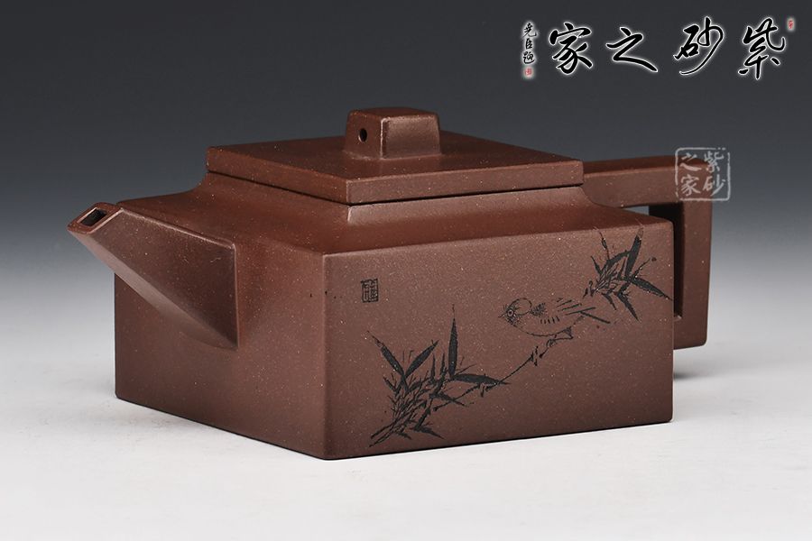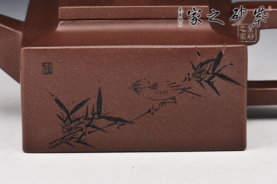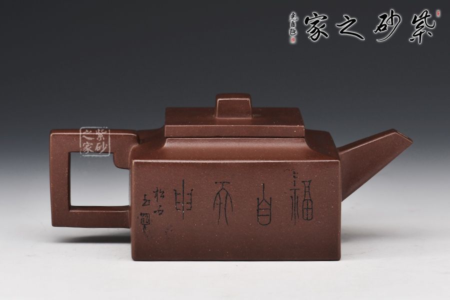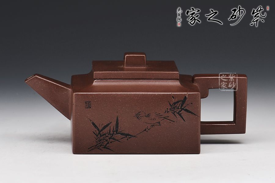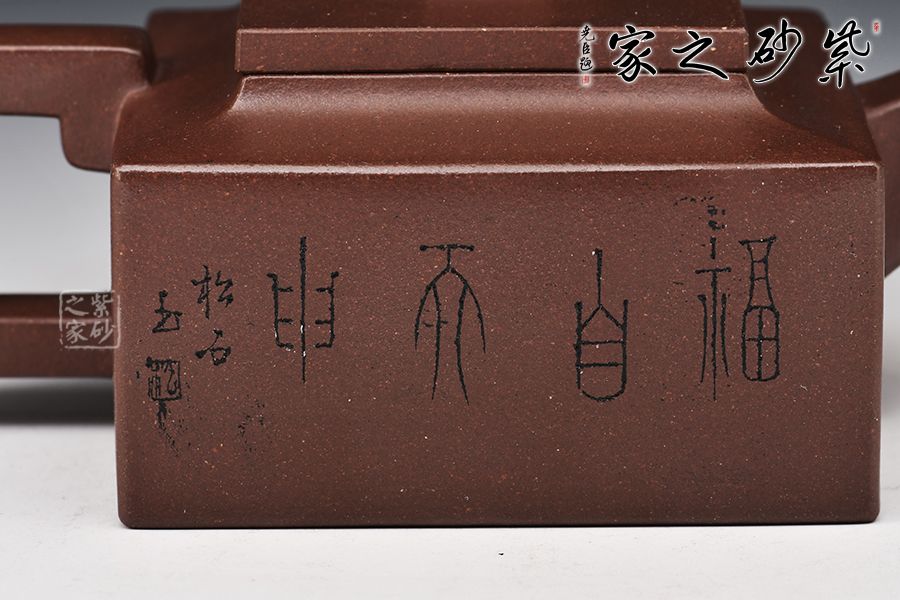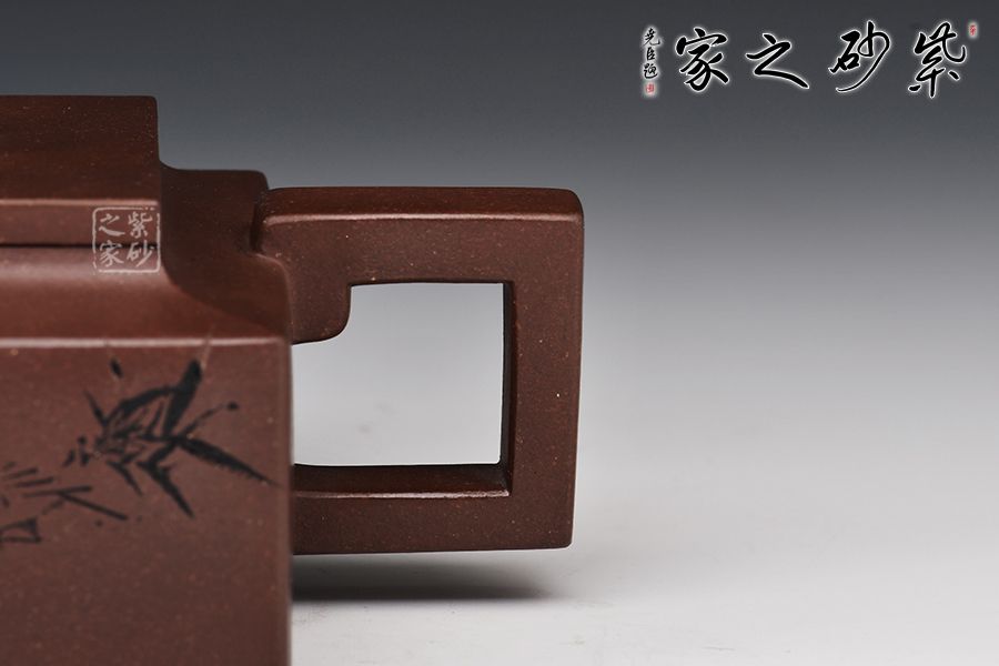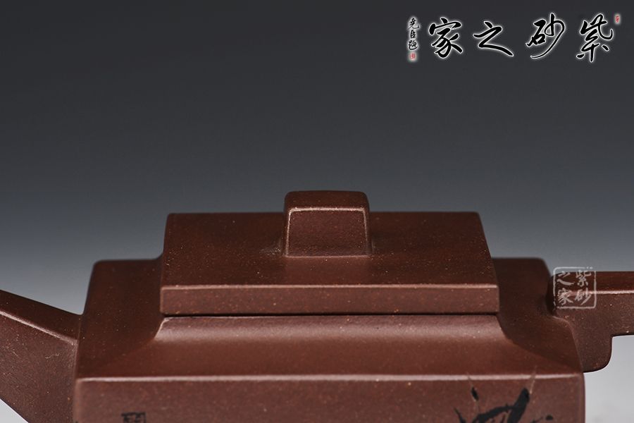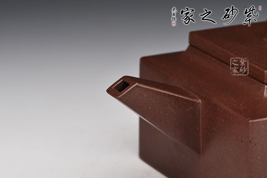 此壺是經(jīng)典的紫砂方器。壺身呈現(xiàn)方形,線面清晰,壺蓋、壺把、壺嘴都由方元素構(gòu)成,規(guī)整大氣。直線線條在此壺中運(yùn)用得大氣磅礴,層次感非常豐富,制作不易,可見(jiàn)工藝師功力。