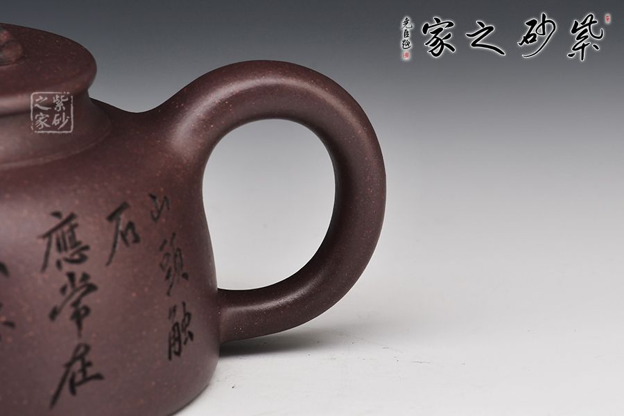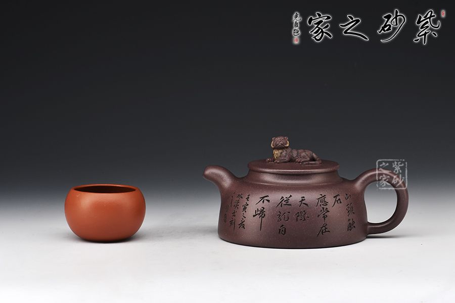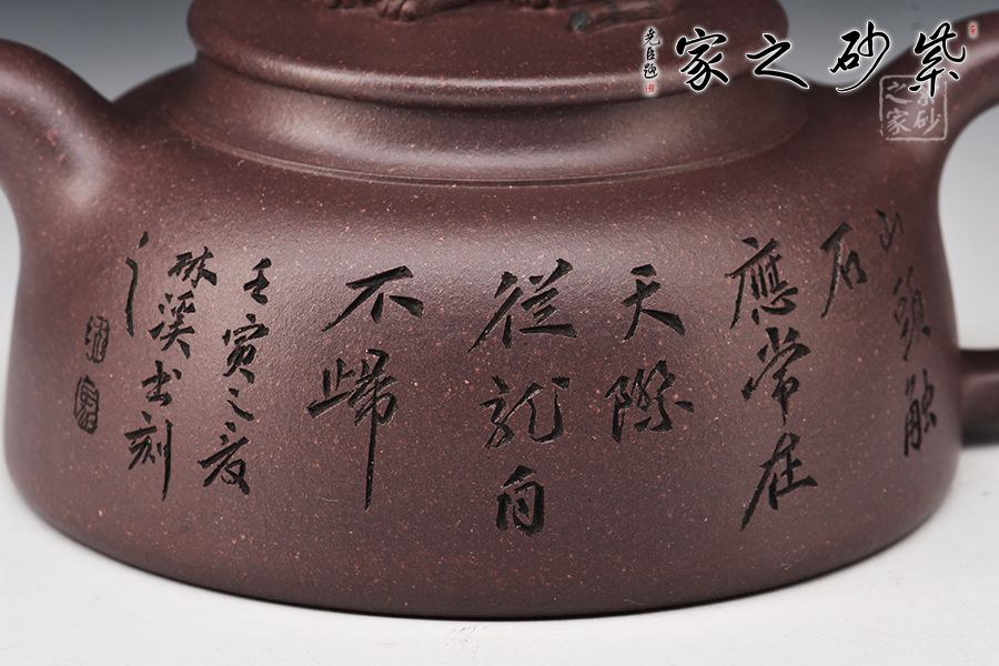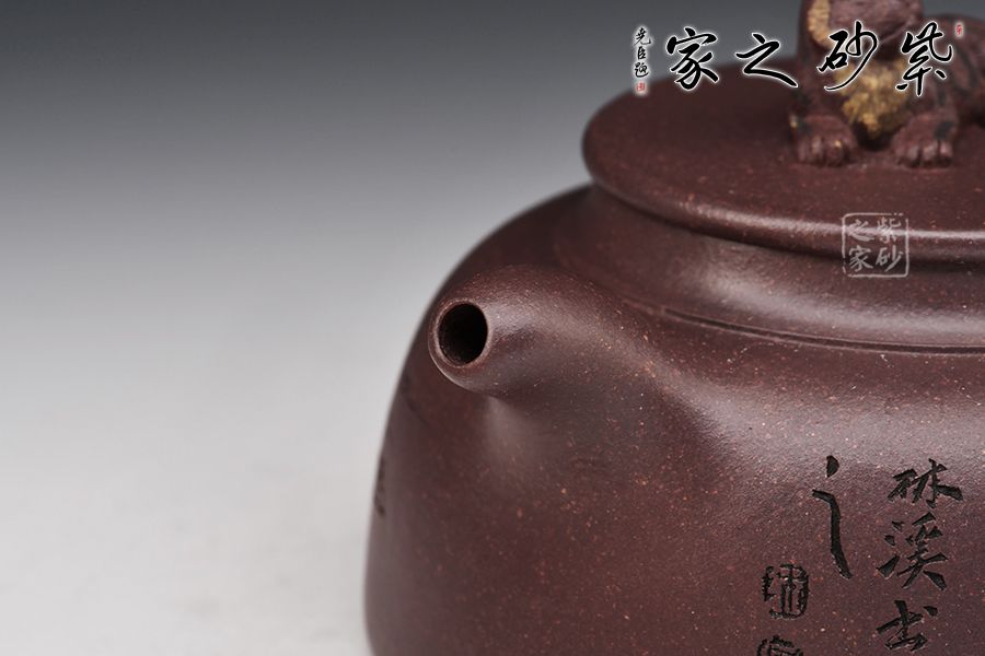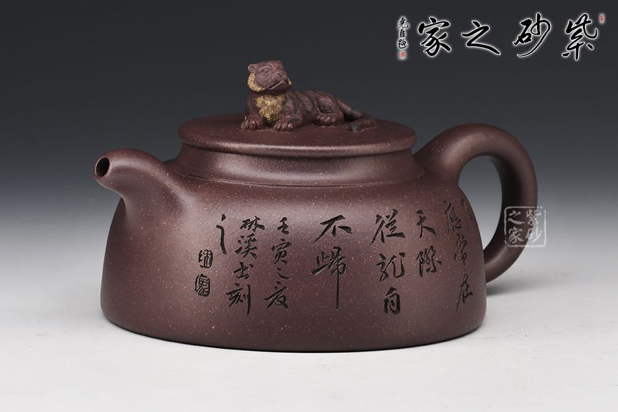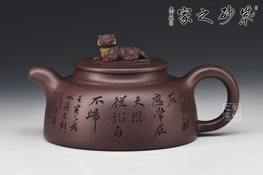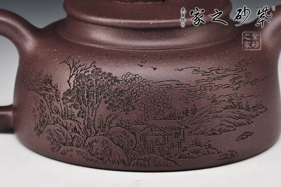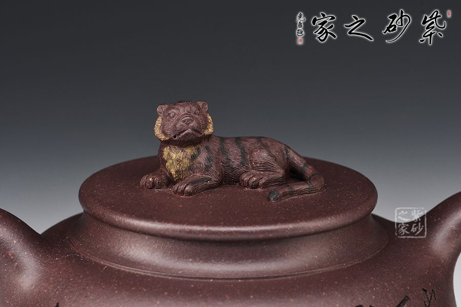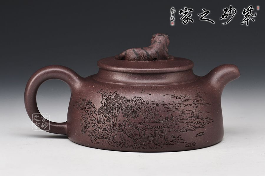 此壺壺身呈柱狀,如井欄,上斂下豐,飽滿圓潤,壺把延壺身上下連接,暗接自然,彎流壺嘴出水爽利,大口蓋好泡茶。壺鈕是一只坐臥的老虎,眼神凌厲,霸氣十足。壺身由陳宏林高徒林溪刻繪(馬建),刻繪行云流水,遠(yuǎn)山近水,意境深遠(yuǎn)。