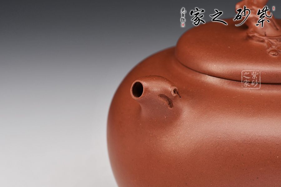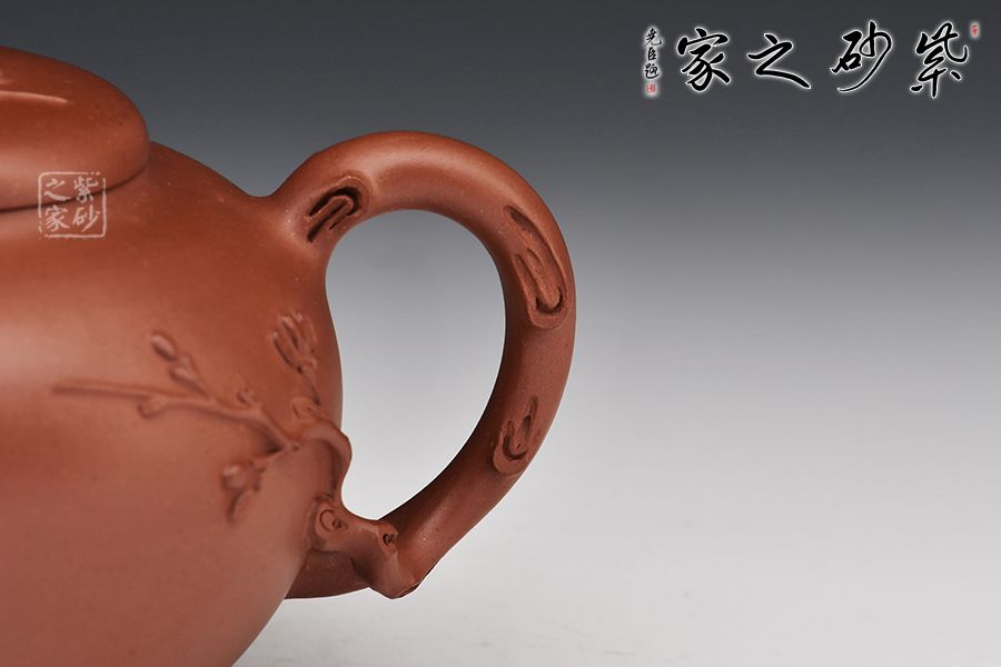 《香雪》壺造型端莊大氣,壺身圓潤外鼓,飽滿豐潤,頗有珠玉之質(zhì),大圓蓋與壺口嚴密合縫、精妙無比,好似將濃濃茶香深藏在了壺中,只待有緣人來輕啟。 三彎流與圈把前呼后應,線條流暢、簡潔輕巧。壺鈕干脆取一段梅樹枝彎折成型,虬枝攀附,生動逼真,依此攀伸出一簇花枝,并在蓋面上蔓延開來,幾朵“香雪”開放枝頭,惟妙惟肖。壺把稍處同樣攀伸出一小段花枝,恰到好處地依附在壺身,盤枝錯節(jié)伸展開來,枝頭隨性地裝飾小巧的梅花,或盛開依舊,或含苞欲放,好似擁有了生命般,各自競風流。