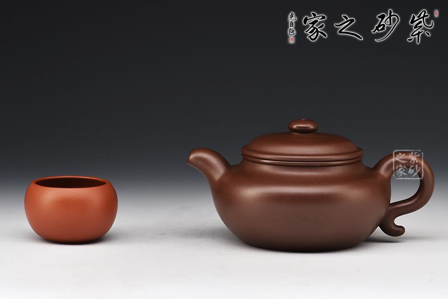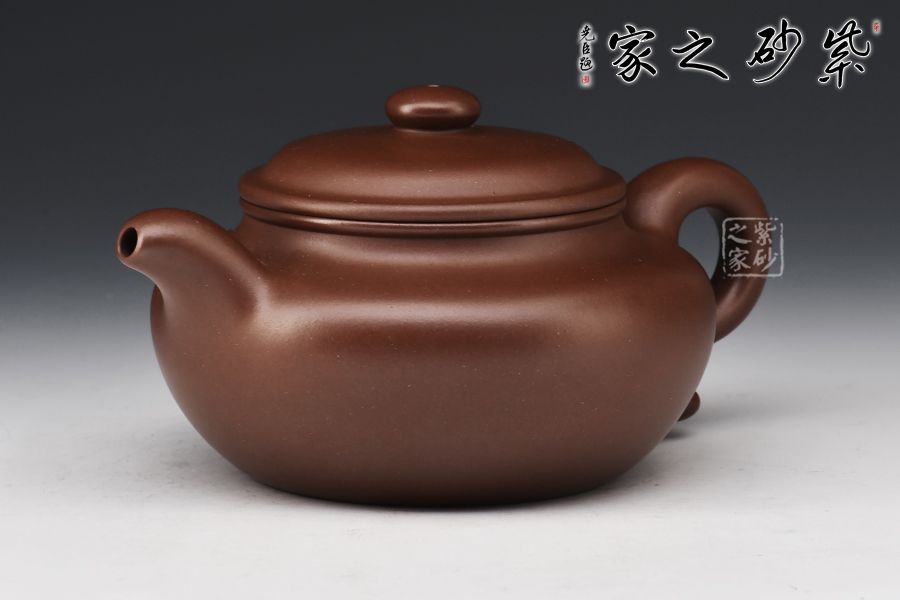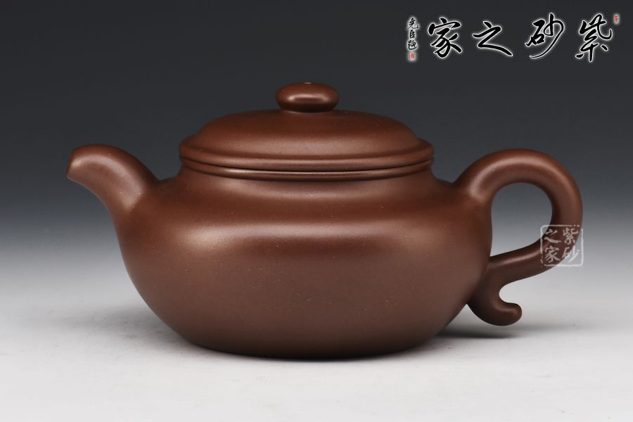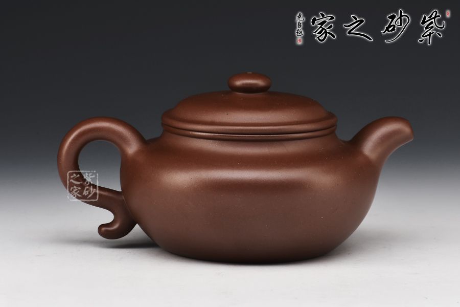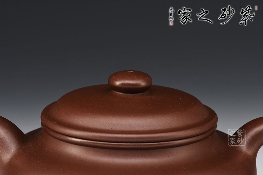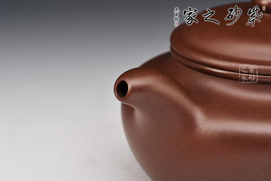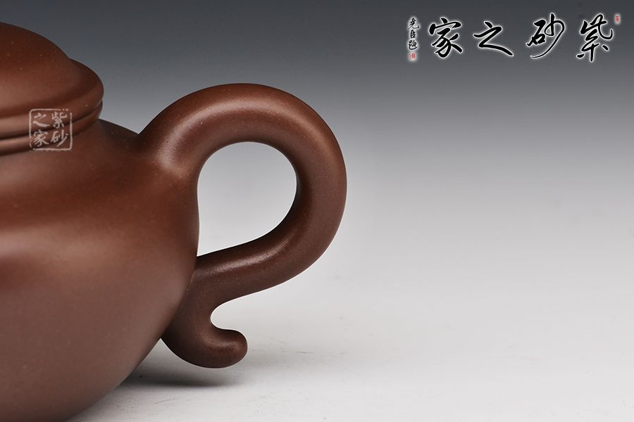 造型仿“鼓”之形,壺身扁圓,壺腹飽滿,鈕、蓋、身三位一體,線條銜接流暢。流、把挺拔胥出,呈對(duì)稱之勢(shì),耳把下留耳垂,更添韻味。整器工藝精良,氣韻充沛,出水爽利,370cc中品容量,上手舒適,乃把玩與殺茶之利器。