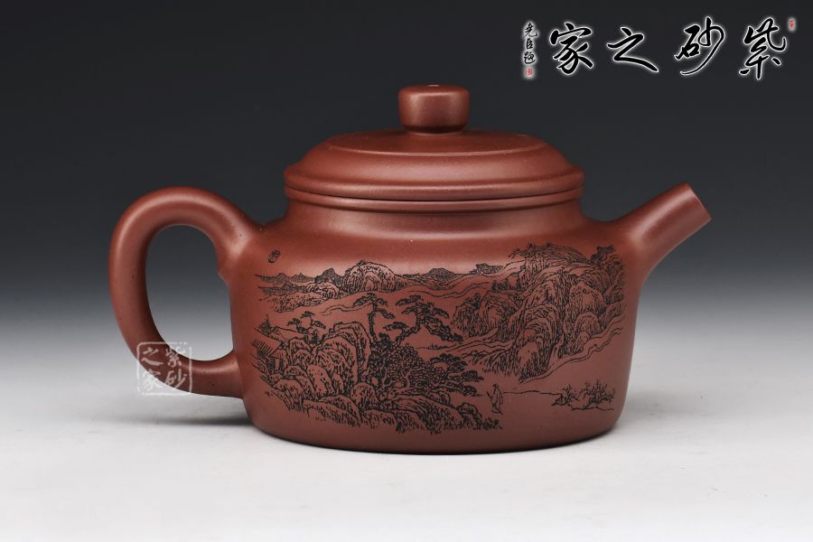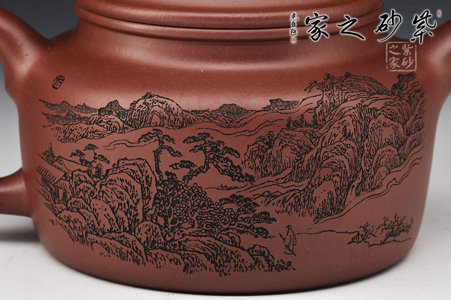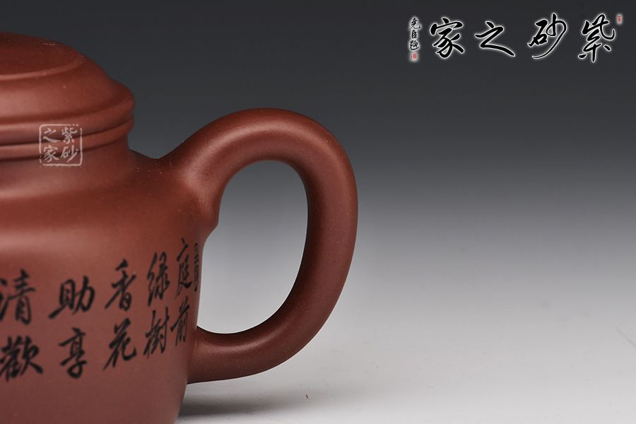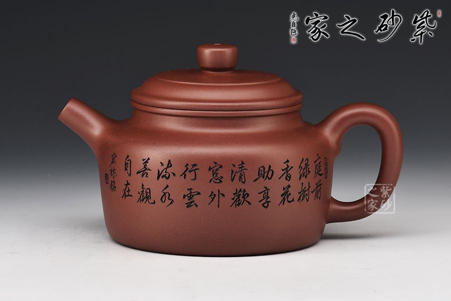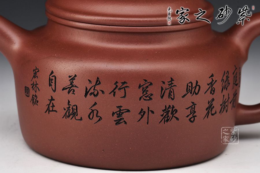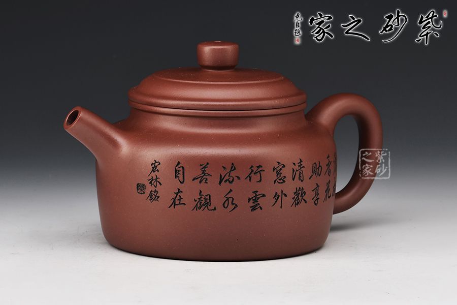 德鐘壺整器線條簡(jiǎn)潔明快,壺頸高而挺拔,正氣凜然,壓蓋敦實(shí),柱鈕與壺身之型相呼應(yīng)。流、把于壺肩自然胥出,直流昂首挺闊,短而俊俏,出水爽利,耳把剛?cè)岵?jì),把握舒適。整器端莊儒雅,沉穩(wěn)周正,雙面刻繪刀法利落,筆力飄逸,情趣韻味優(yōu)雅,值得賞藏。