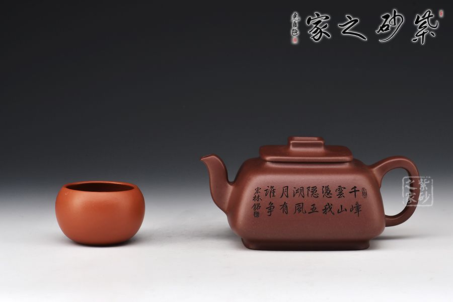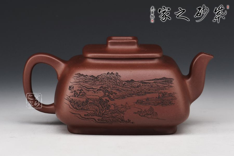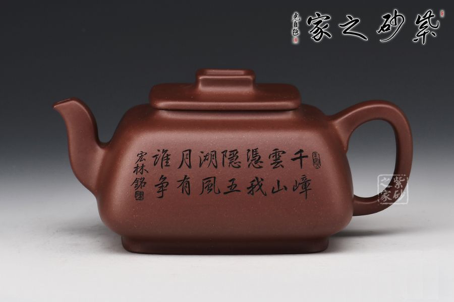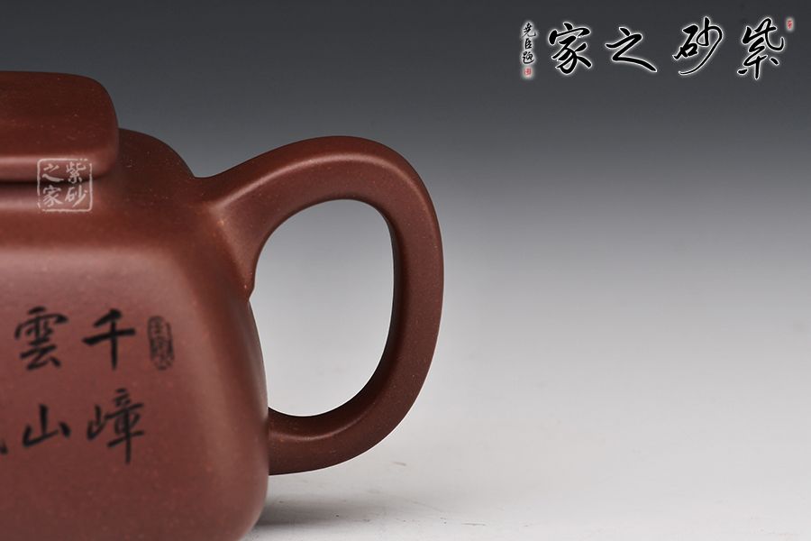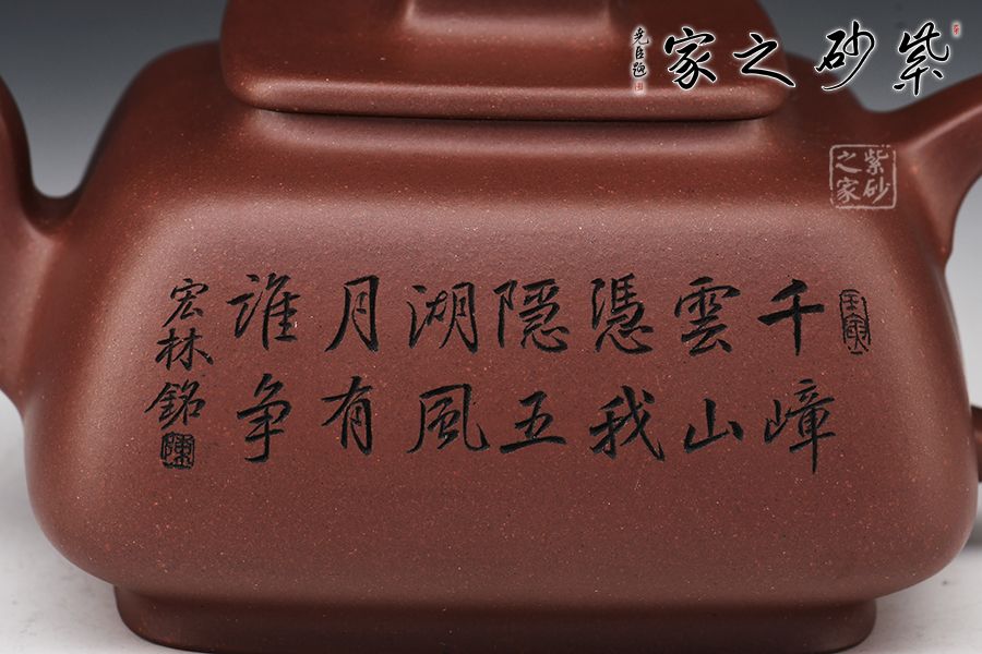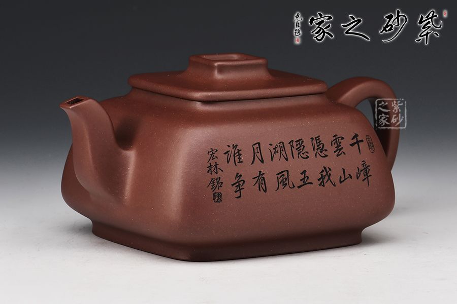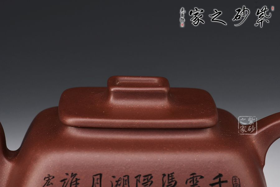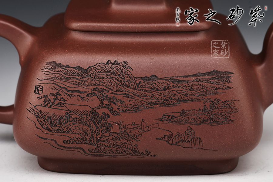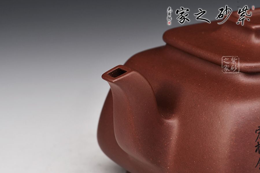 此壺呈四方形輪廓,壺方古樸,轉(zhuǎn)角以圓潤處理為之,方圓結(jié)合顯得尤為古雅大氣,平蓋十分嚴(yán)密,蓋面平實和潤,壺鈕四方,柔和挺立,拿捏便捷。壺身四方有度,轉(zhuǎn)角均勻,弧度優(yōu)雅,這樣的設(shè)計增強了壺型的律動感。壺把呈耳形,把體呈四方形,耳形轉(zhuǎn)角溫和,端握舒適大氣。明接壺嘴,四方彎流,出水迅猛流暢。雙面刻繪刀法利落,筆力飄逸,情趣韻味優(yōu)雅,值得賞藏。