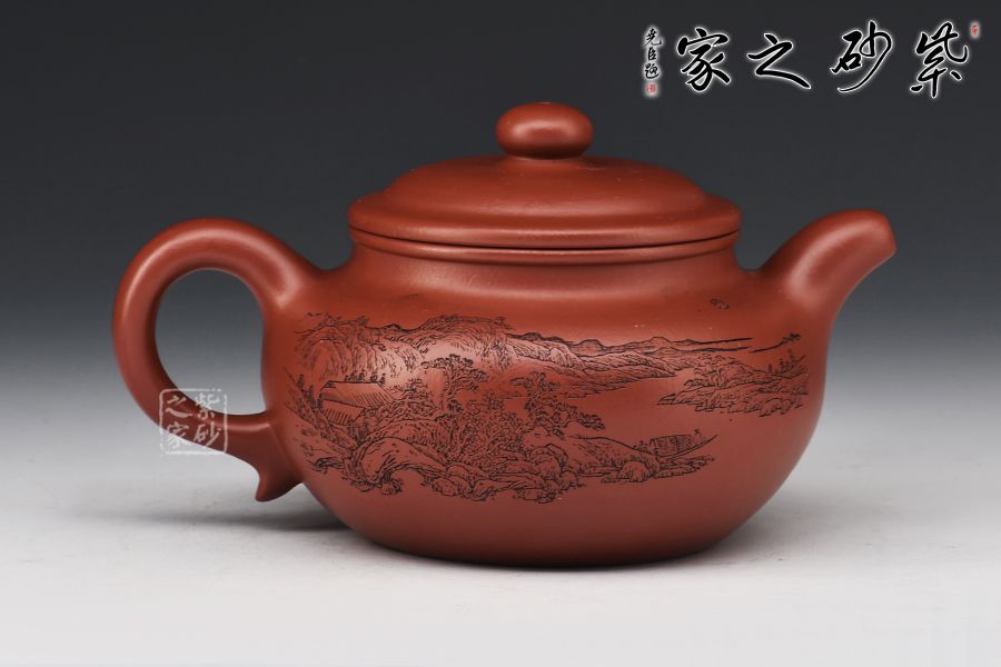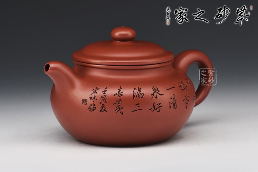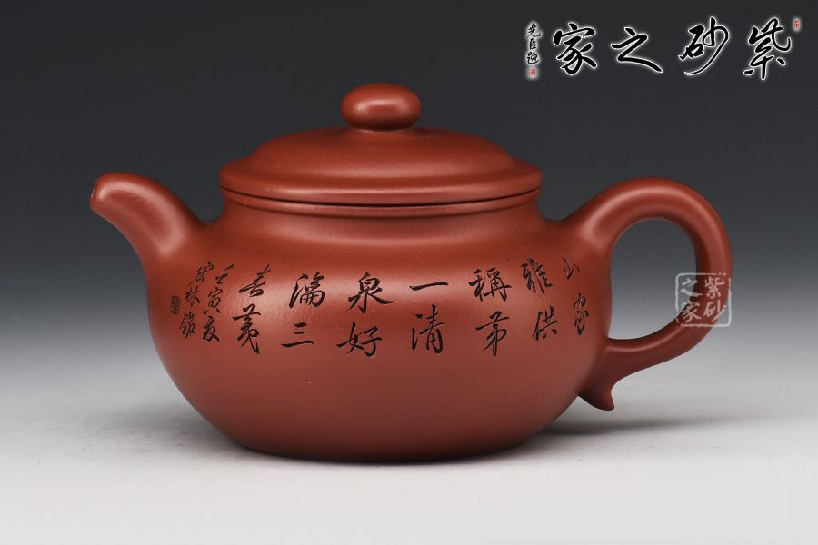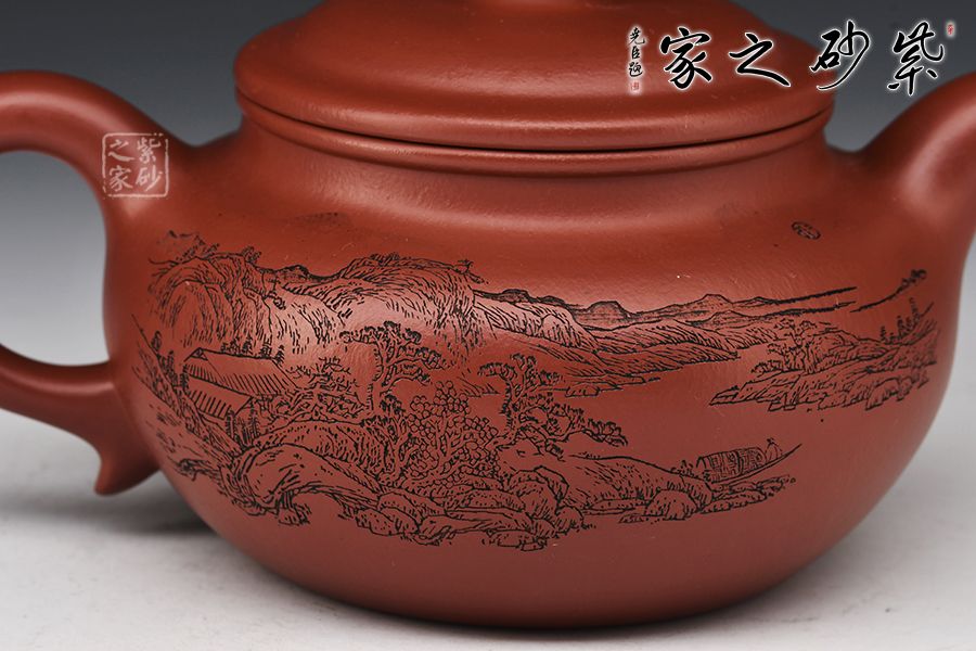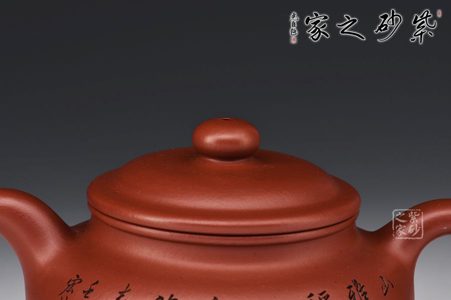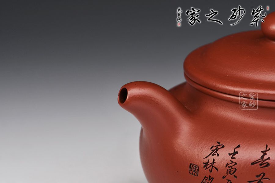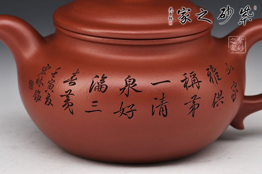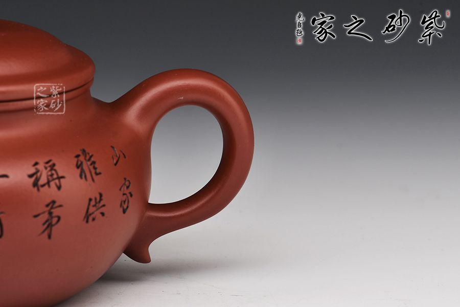 造型仿“鼓”之形,壺身扁圓,壺腹飽滿,鈕、蓋、身三位一體,線條銜接流暢。流、把挺拔胥出,呈對稱之勢,耳把下留耳垂,更添韻味。整器工藝精良,氣韻充沛,出水爽利,330CC黃金容量,上手舒適,乃把玩與殺茶之利器。