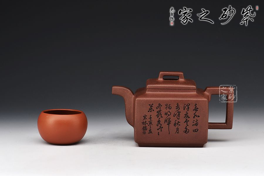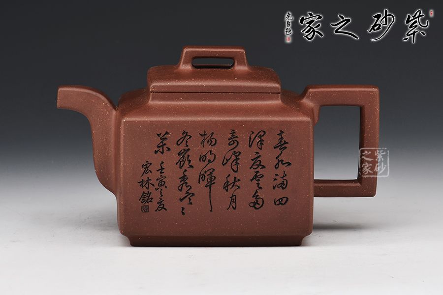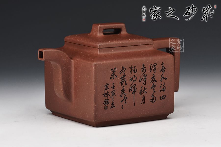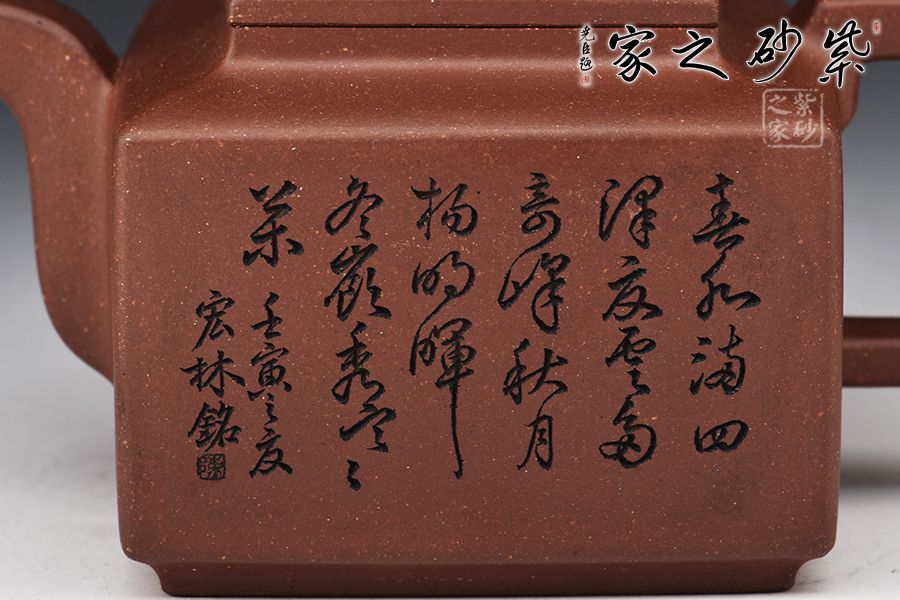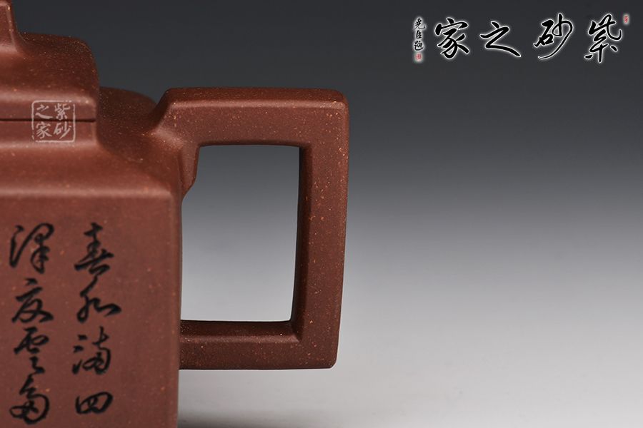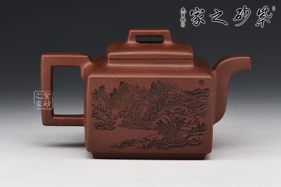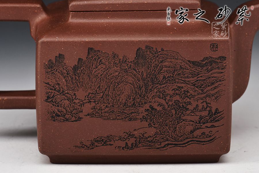 此款亞明四方整體造型比例協(xié)調(diào),線面挺括有力,輪廓分明,全器氣勢(shì)挺拔;英姿颯爽,成就紫砂方器之美。亞明四方是方器中經(jīng)典的器型之一,是著名書(shū)畫(huà)家亞明先生所設(shè)計(jì),故而稱(chēng)之為“亞明四方”,作為方器中的經(jīng)典款,有著古樸典雅的造型,又有渾厚大氣的特點(diǎn)。而作為此壺,值得稱(chēng)道不僅是亞明四方共同具有的器形特點(diǎn),更值得稱(chēng)道的是此壺的裝飾工藝刻繪。