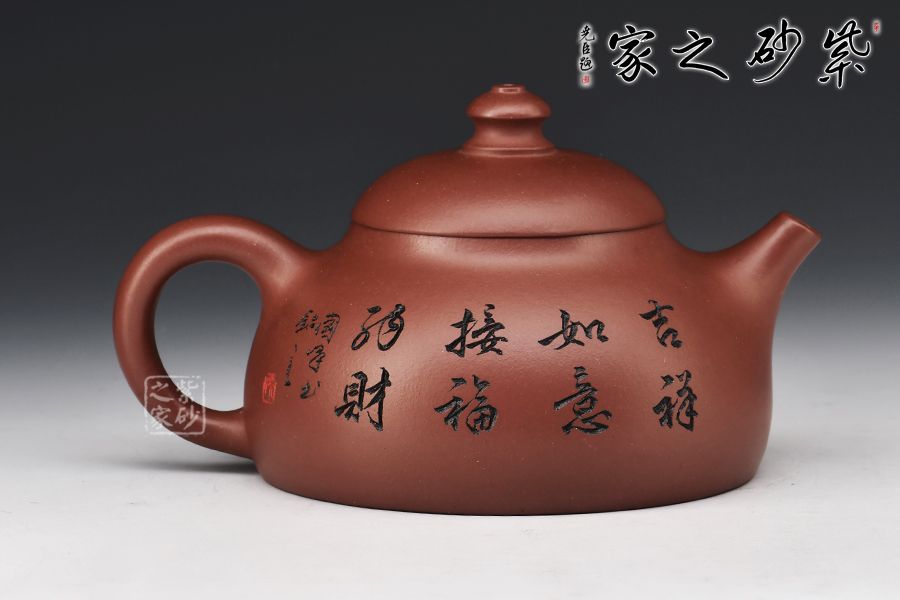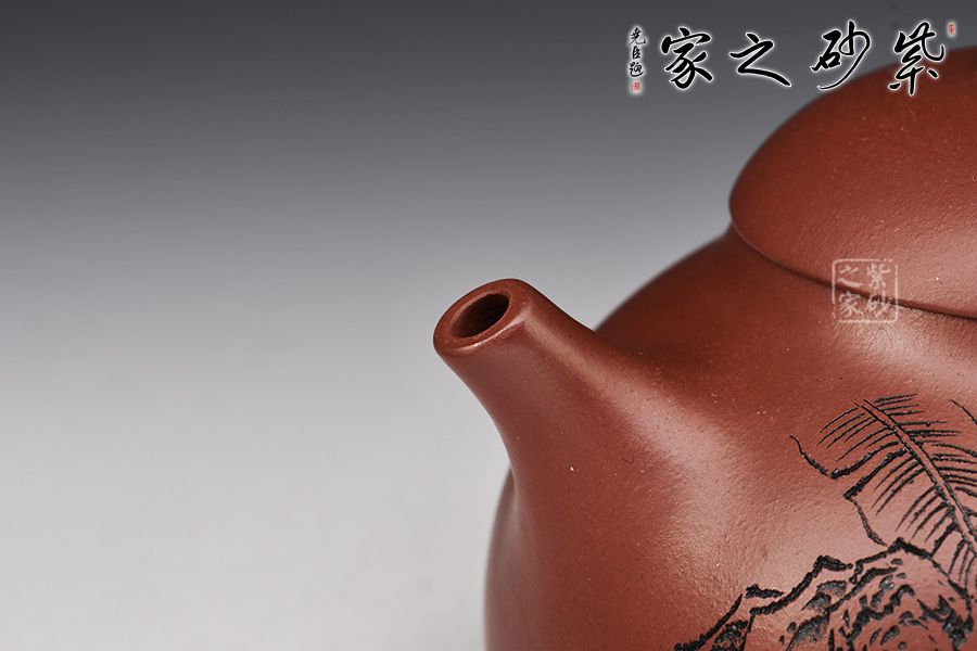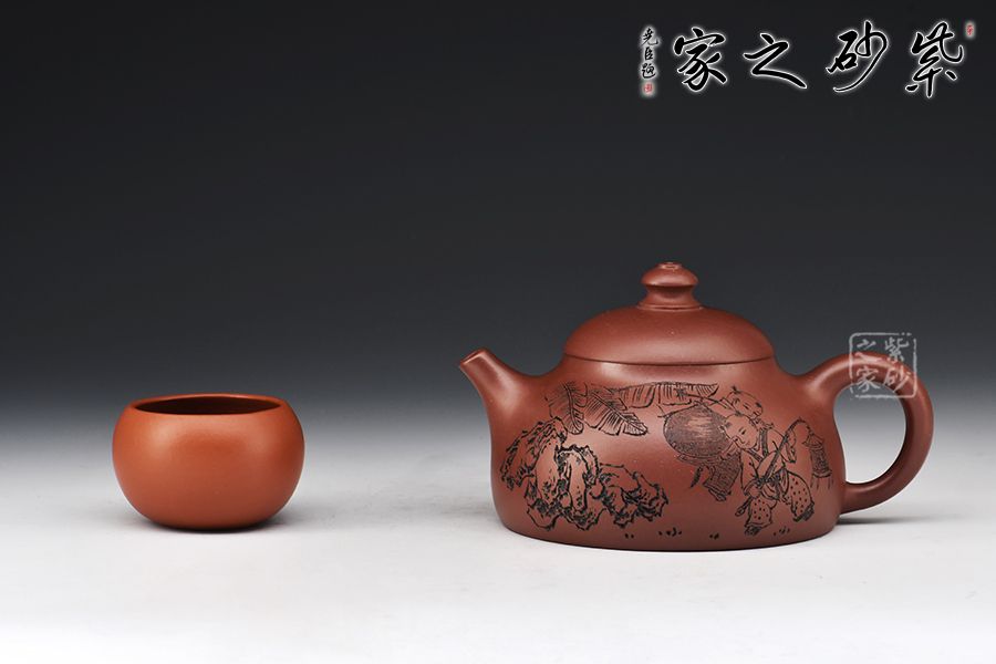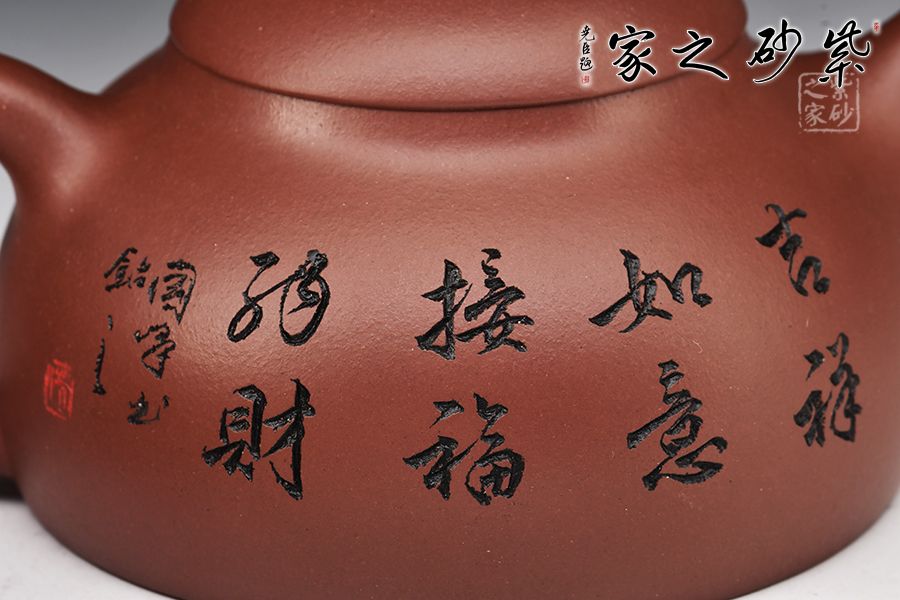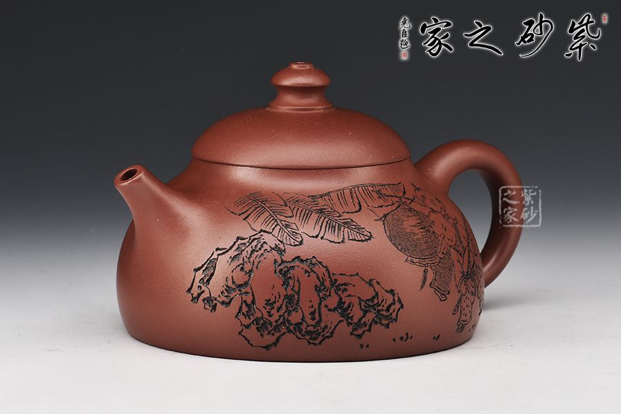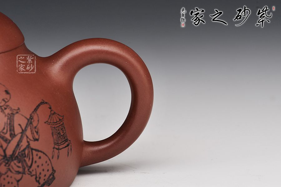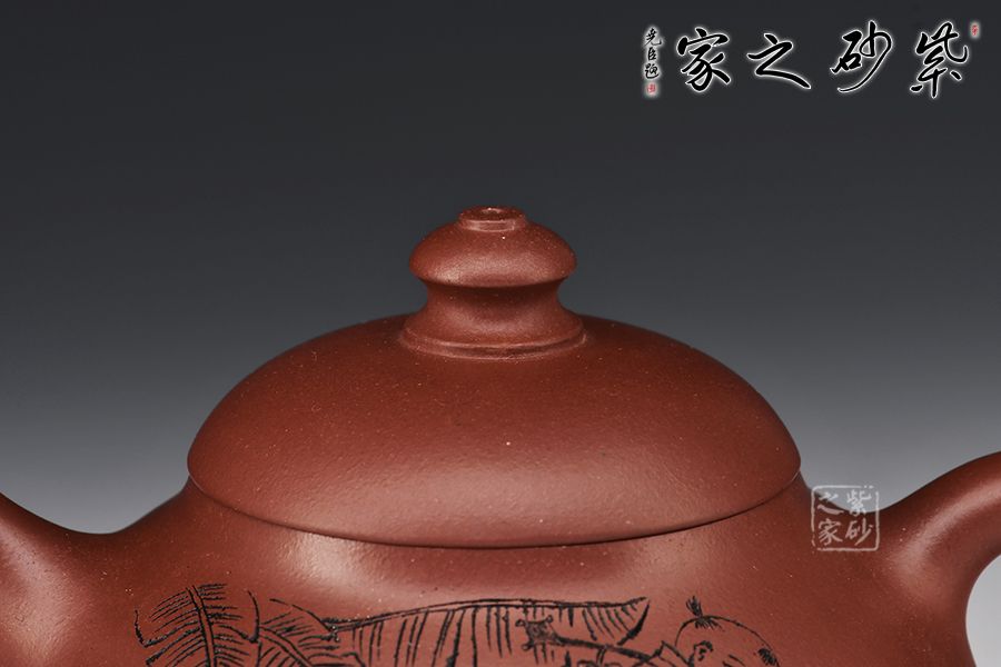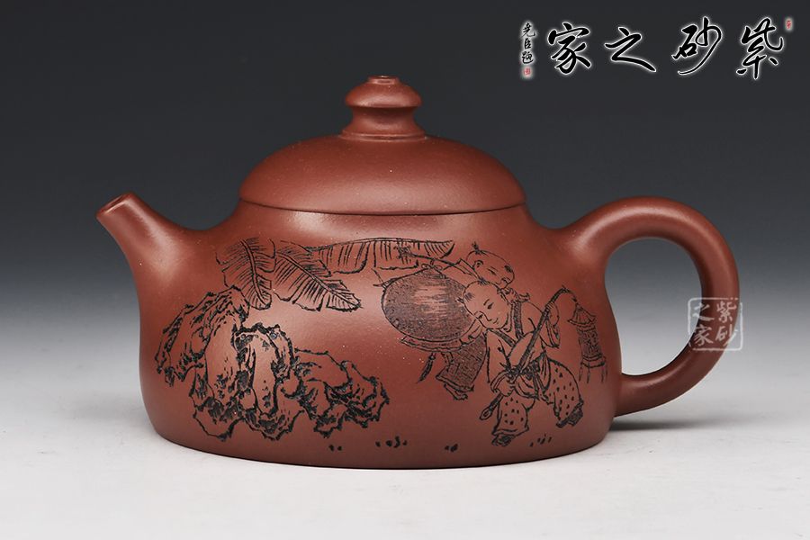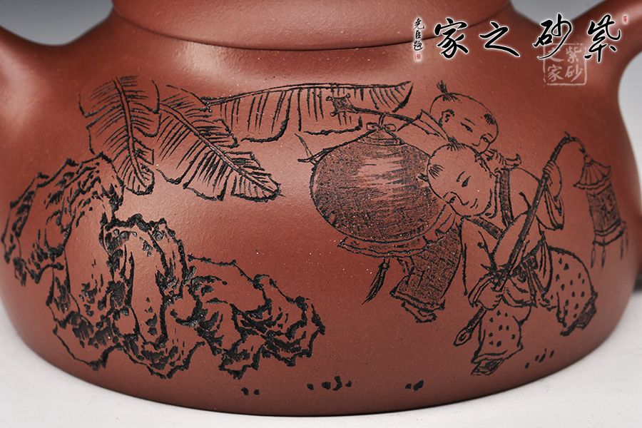 這把壺整個壺型乃是模仿半個匏瓜制作而成,的子就是匏瓜的柄,截蓋恰好在瓢瓜的頸部與壺口對接,嚴(yán)絲合縫,泡茶很實(shí)用。壺嘴短促有力,嘴頭齊整如刀裁而成,嘴口細(xì)致,耳形把拿捏在手很適合。壺身鼓脹飽滿,整把壺盈潤豐腴,很是迷人。壺身刻繪孩童嬉戲,和此壺的田園清趣互相映襯,值得推薦!