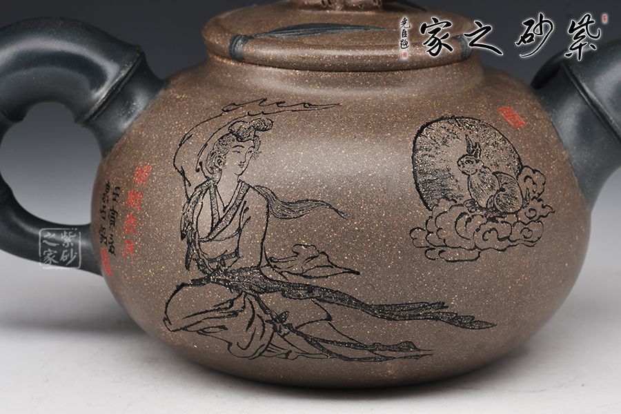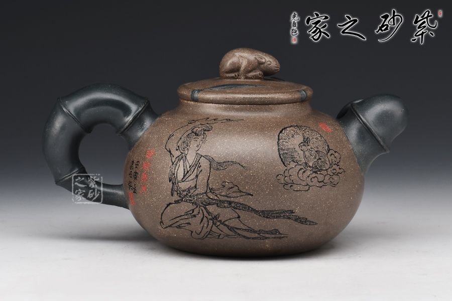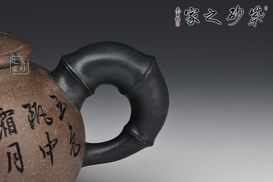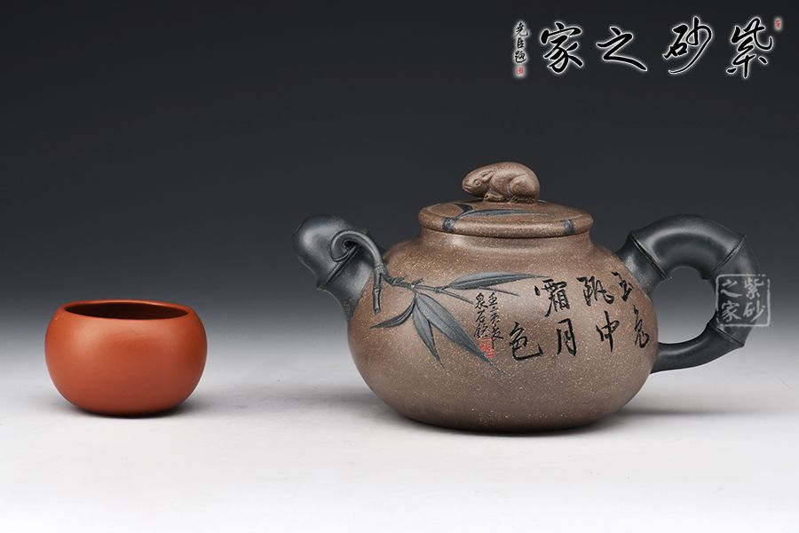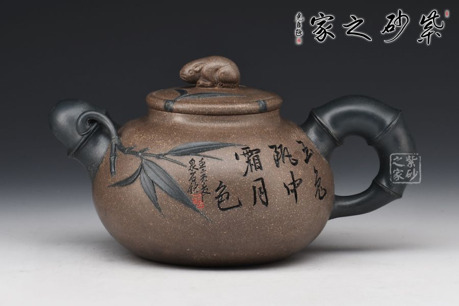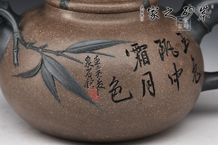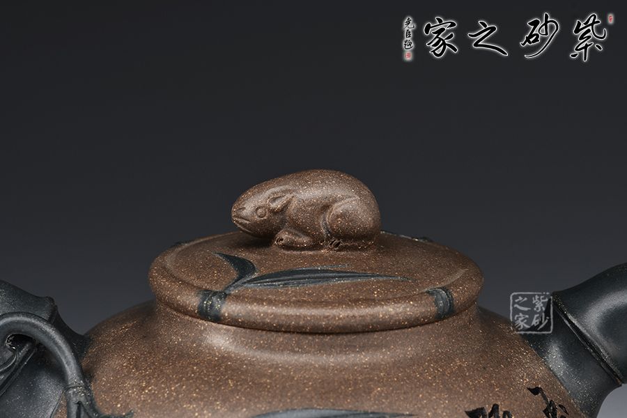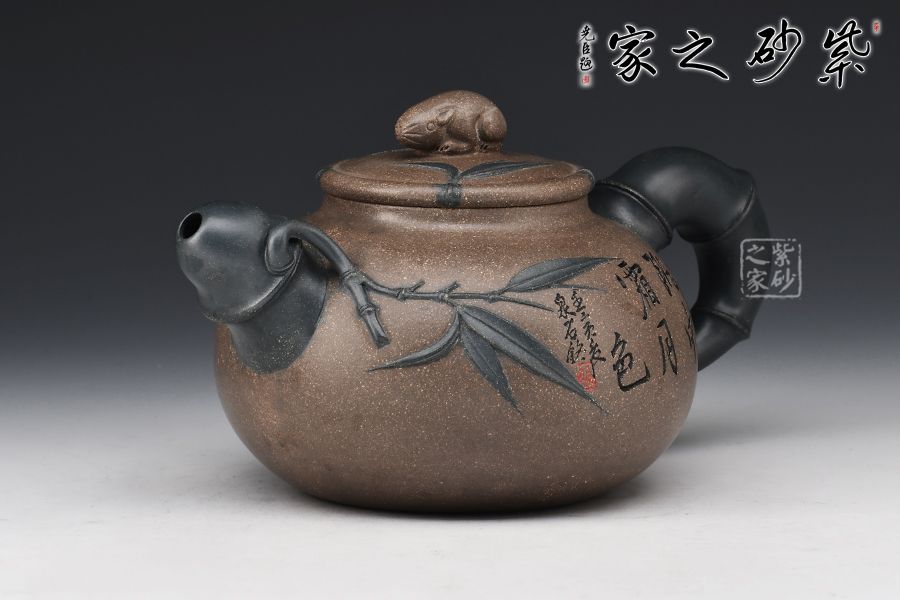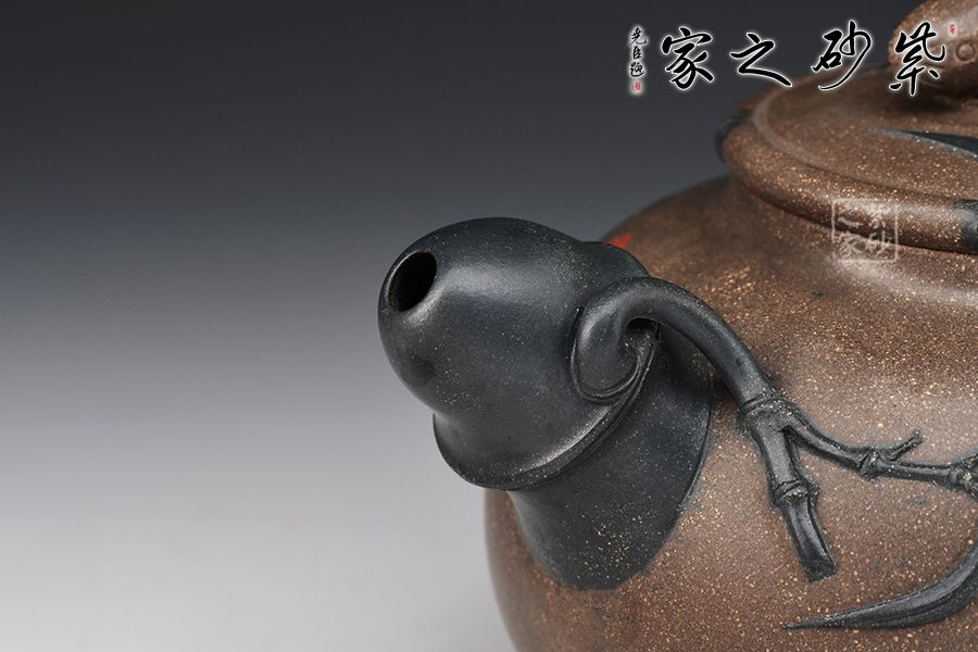 夏瑞娟,受何道洪大師、汪寅仙大師指導(dǎo)壺藝,作品極具道洪風(fēng)格、汪派花器風(fēng)格。此壺以竹元素入壺,壺嘴、壺把皆為竹節(jié),壺身貼花做成的竹葉剛勁有力,壺鈕為動物雕塑,細(xì)節(jié)各處皆極致有感,古韻味十足,優(yōu)美雅致,風(fēng)韻不減。道洪風(fēng)格,干凈利索,活靈活現(xiàn)。