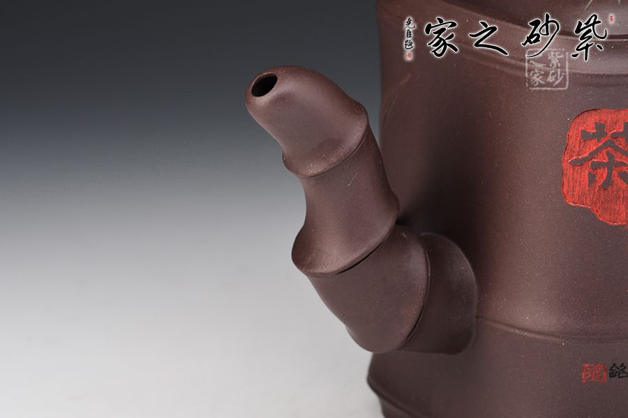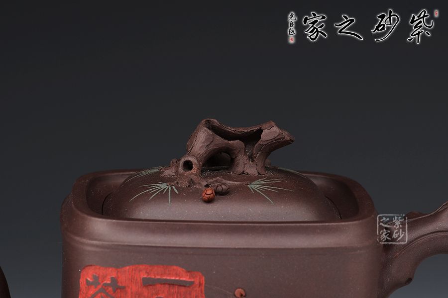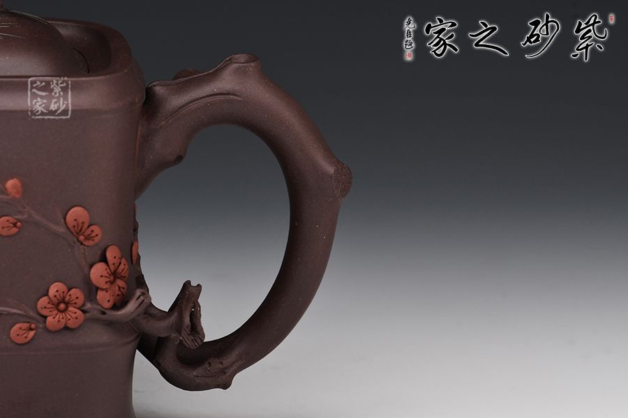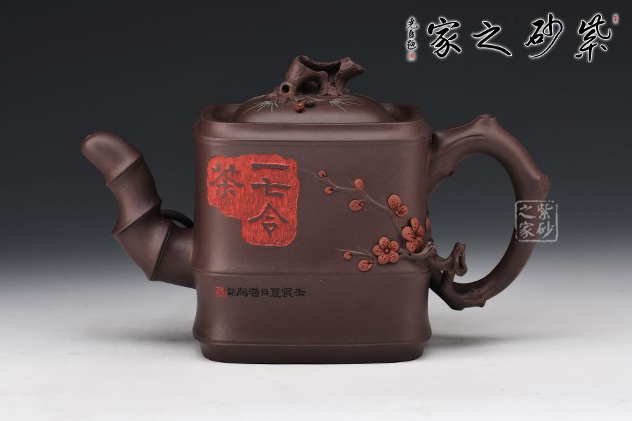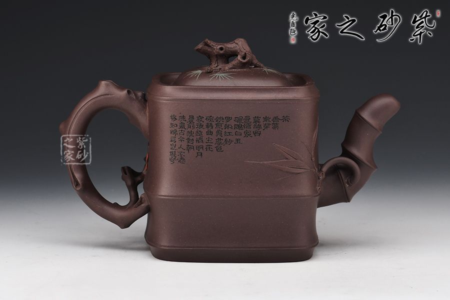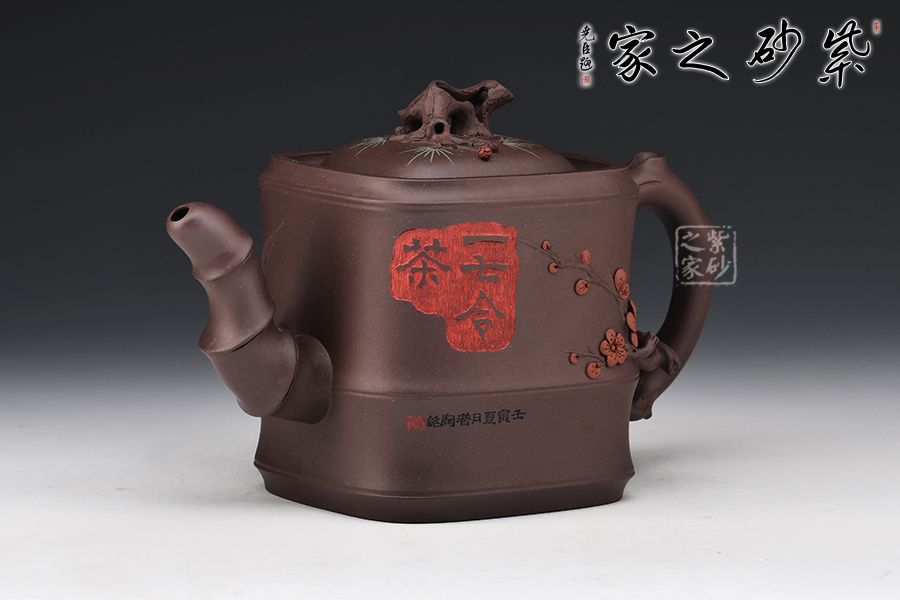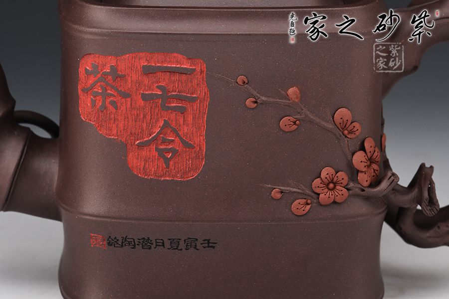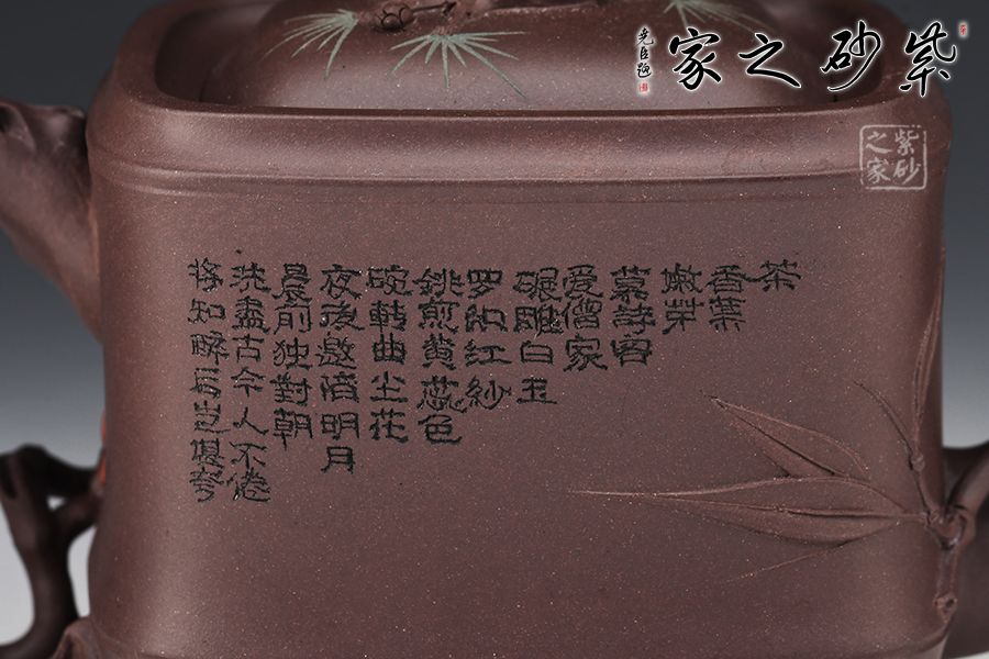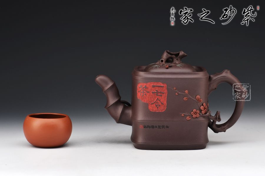 此壺壺身四方,上下貫通,氣密性良好。以梅樁為壺把,從旁胥出的梅花,靈動而有生氣。以竹節(jié)為壺嘴,姿態(tài)俊逸。杯身刻繪《一七令·茶》,字體飄逸俊秀,實(shí)屬上品。