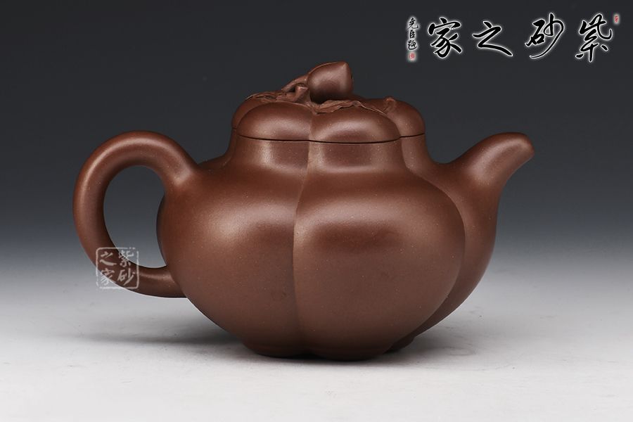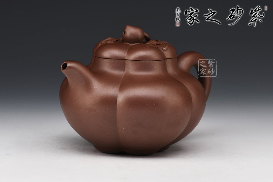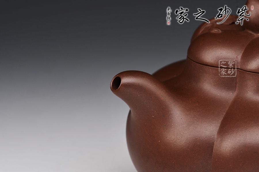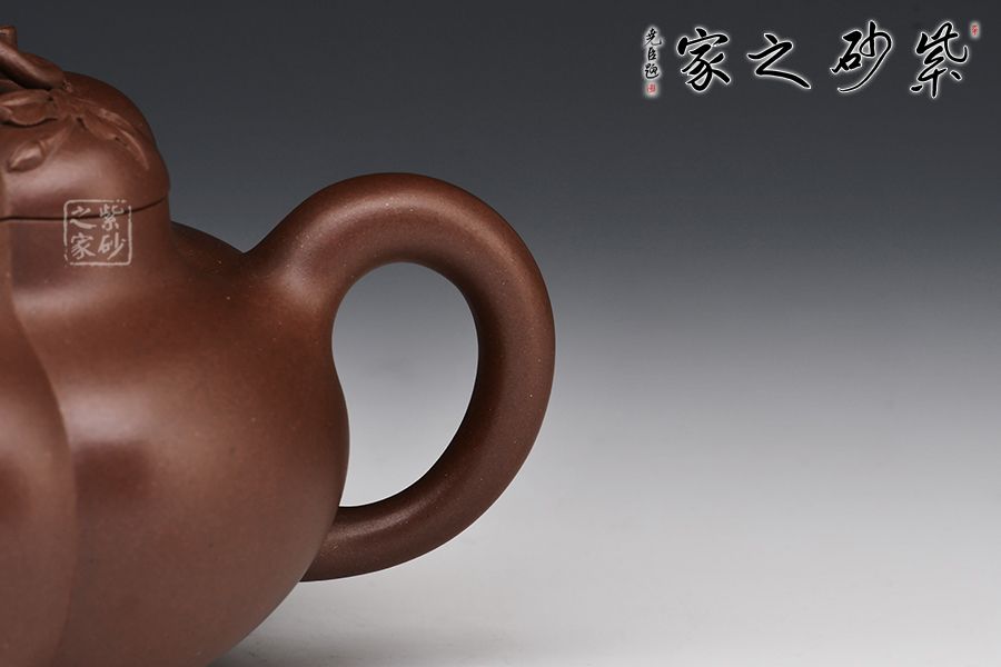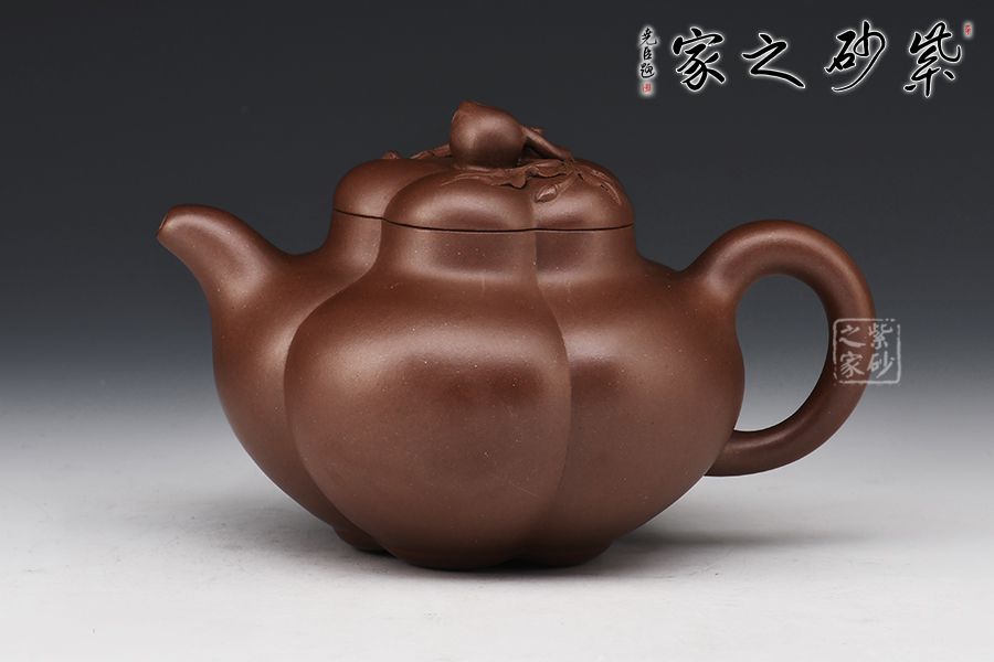 此壺壺身作五瓣筋囊式,等分均勻規(guī)則,線條頗具張力,充滿了成熟的韻味。自壺蓋至壺底均以筋紋裝飾,上下一致。壺鈕以桃子作鮮明的點綴,寓意長壽、吉祥。