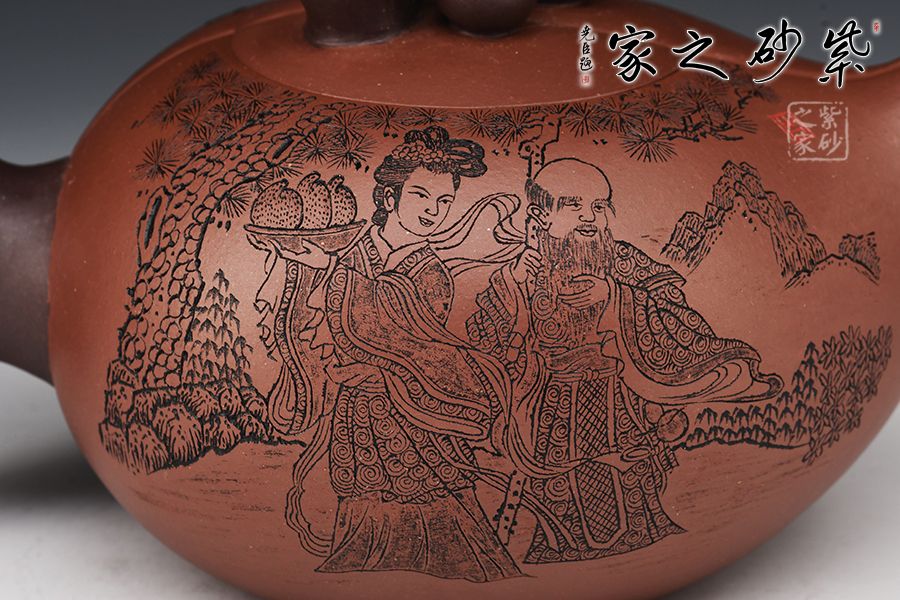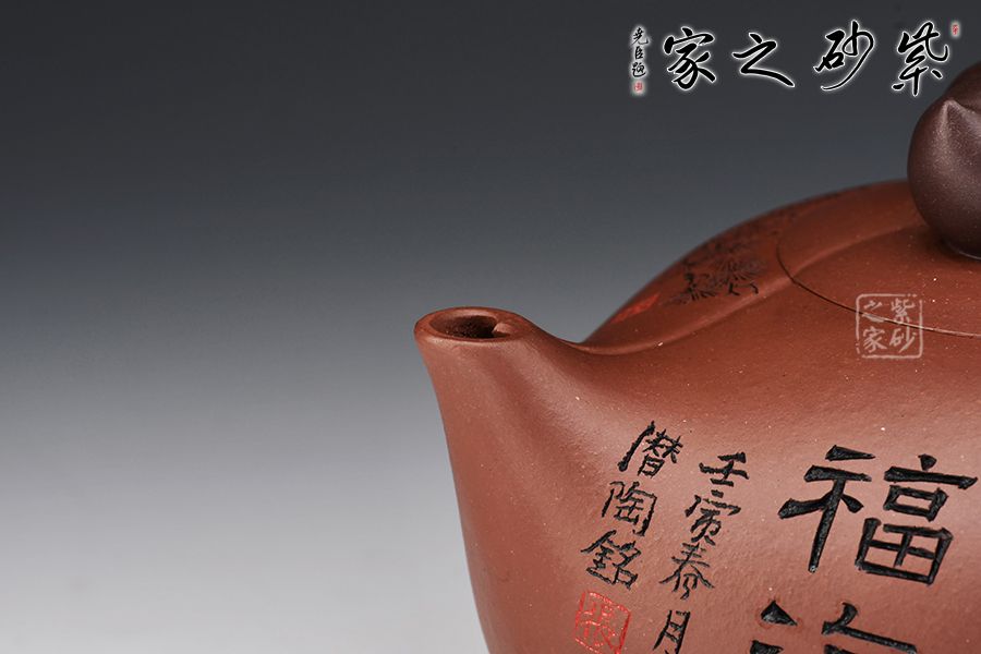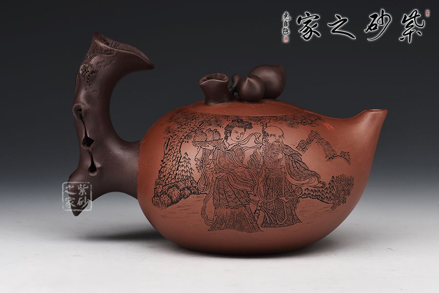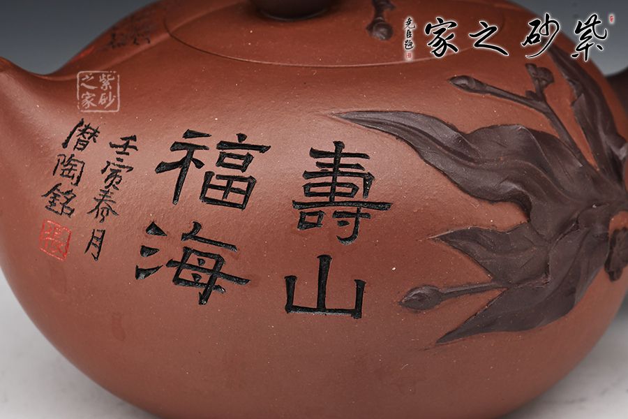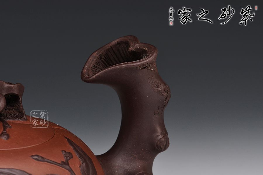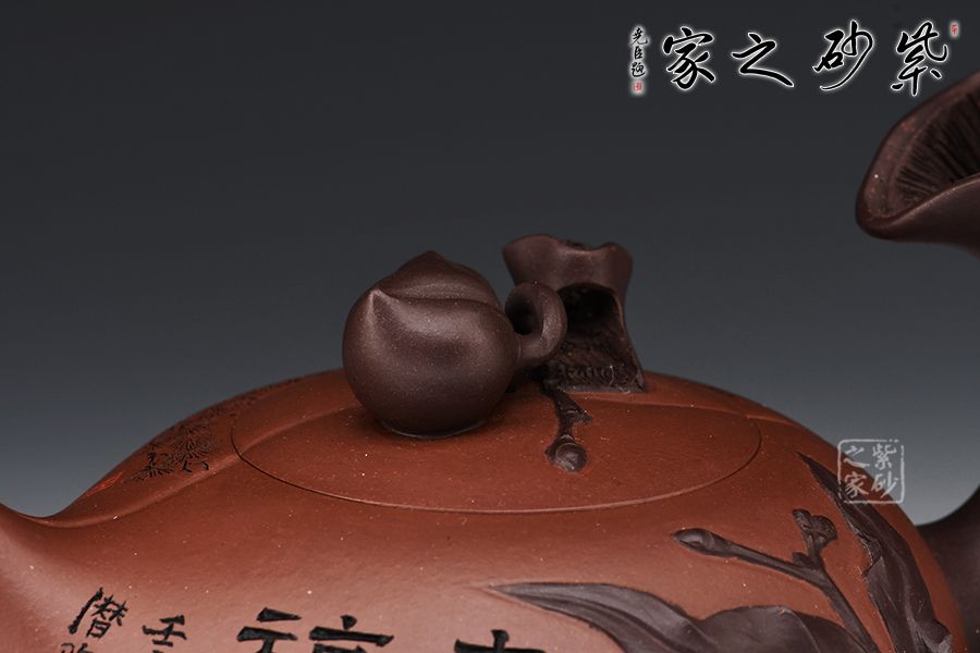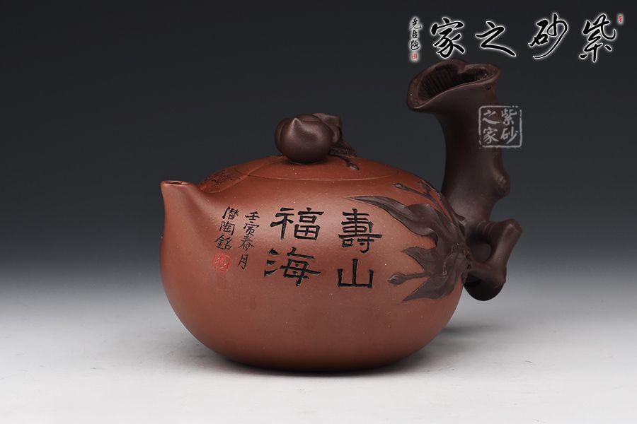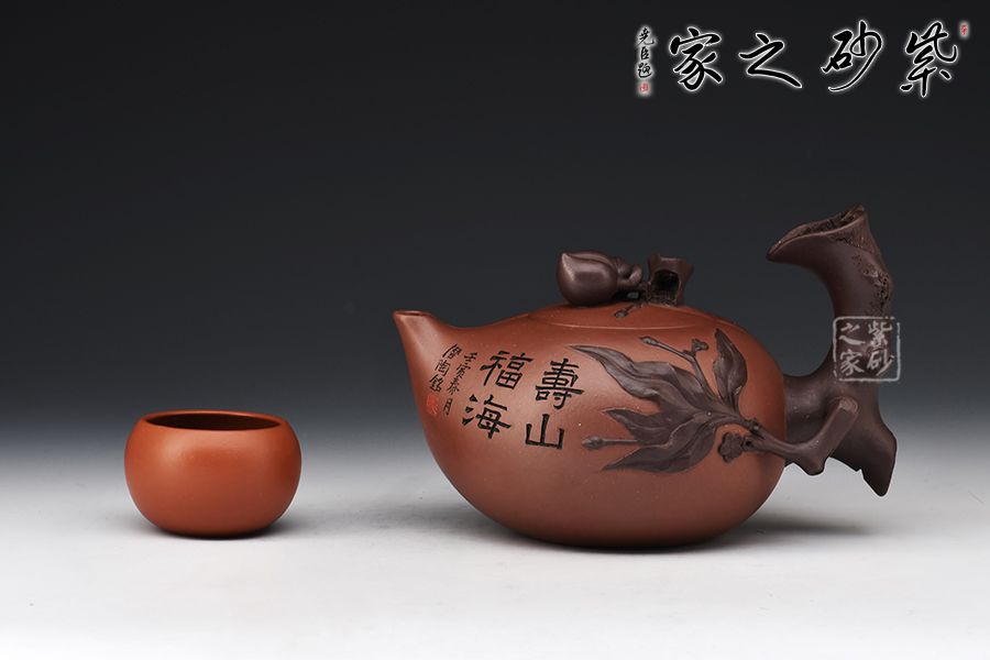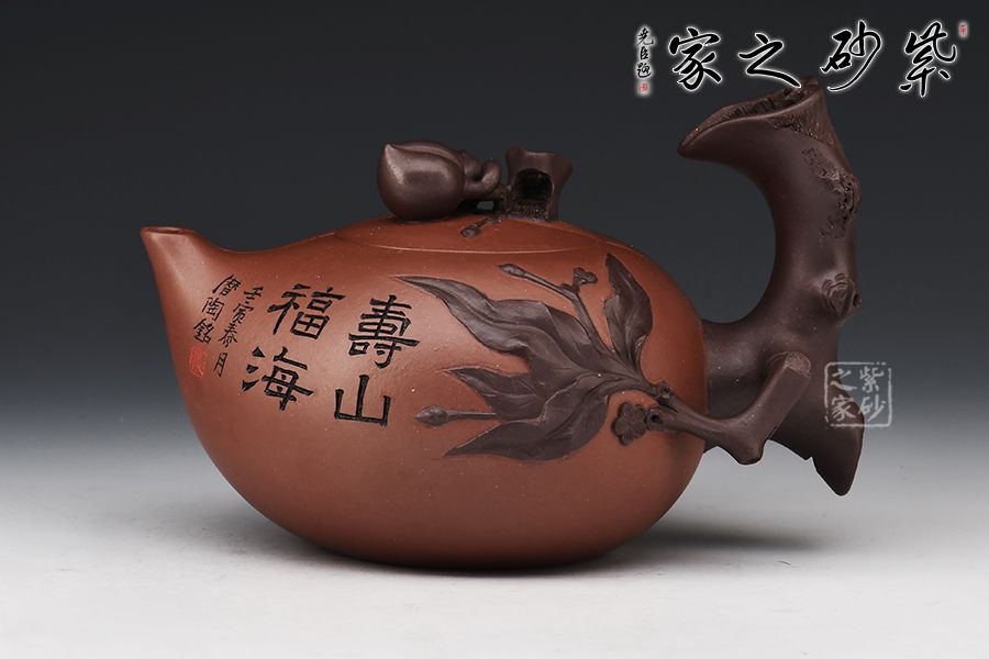 此壺設(shè)計(jì)巧妙,整壺亦是壽桃,壺蓋、把柄像枝干連著葉片與果實(shí),舒展自然。幼桃俯仰,藏露于葉間,靈動(dòng)有趣,寓意子孫同堂,溫馨祥和,色澤自然生動(dòng),形象惟妙惟肖,實(shí)乃巧奪天工。