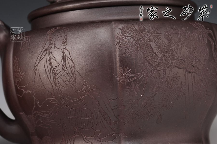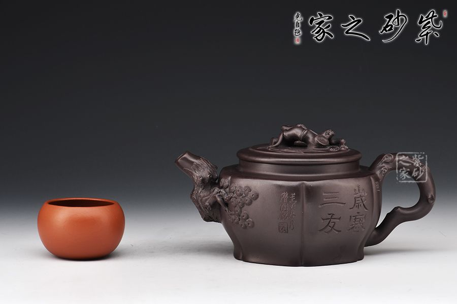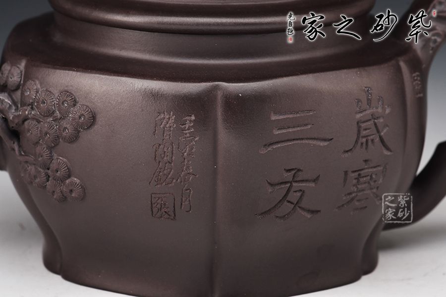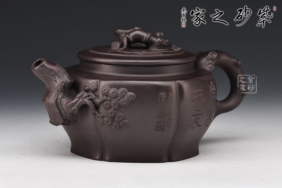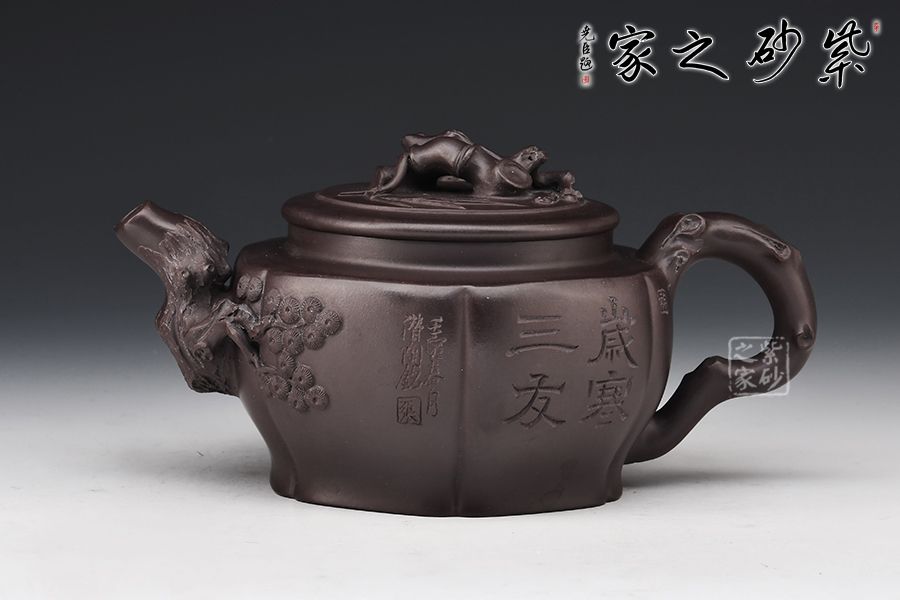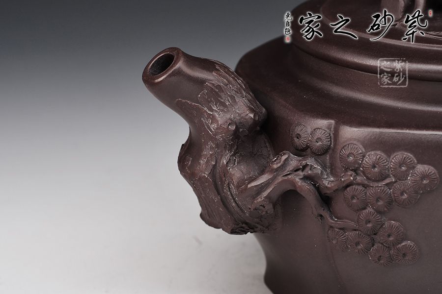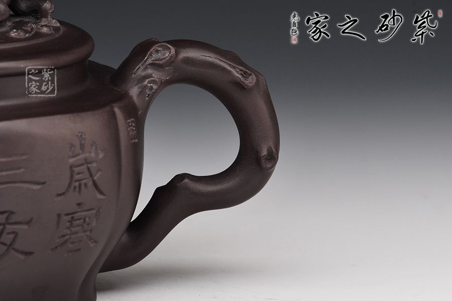 以松竹梅為元素,壺鈕以松枝蒼涼為感,枯藤古樸,形象逼真。壺嘴以梅枝為韻,宛若一顆蒼勁的梅樹,彎曲叩首而成,梅花鮮艷綻放,若暗香浮動(dòng)而來(lái)。壺身刻繪遒勁有力,給人之感,意味無(wú)窮,值得把玩。