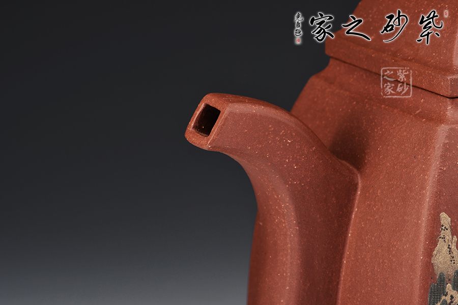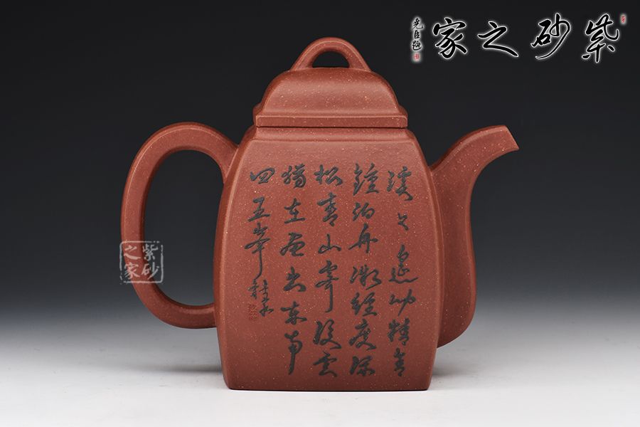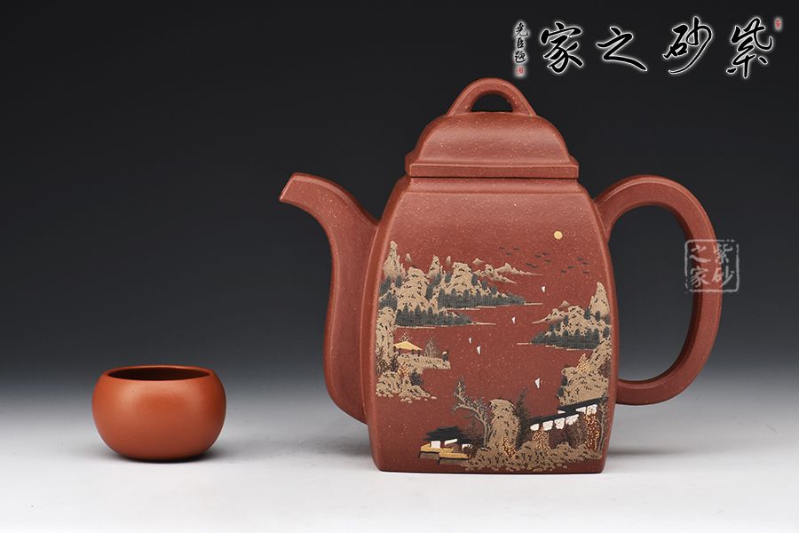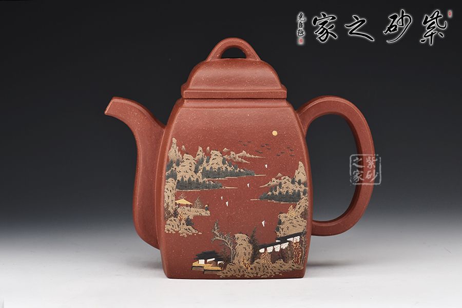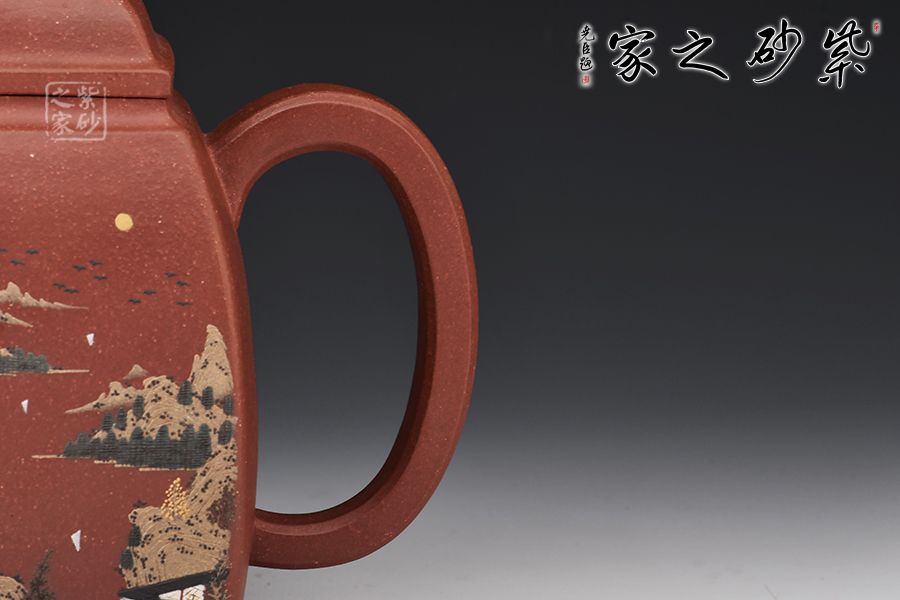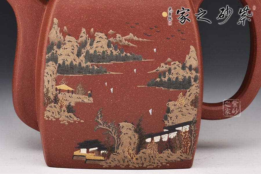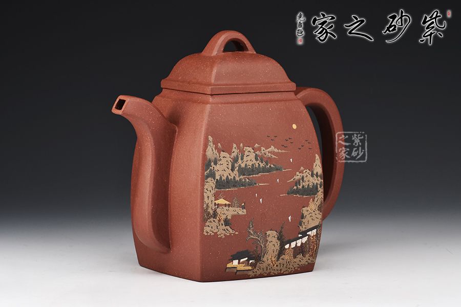 此壺壺身為高四方,上部收分大,下部收分小,四棱作圓化處理。正面裝飾山水畫面,背面題字:“溪上遙聞精舍鐘,泊舟微徑度深松。青山霽后云猶在,畫出東南四五峰?!睂懗隽搜乓莸囊饩常咕拔锍湟缁盍?。