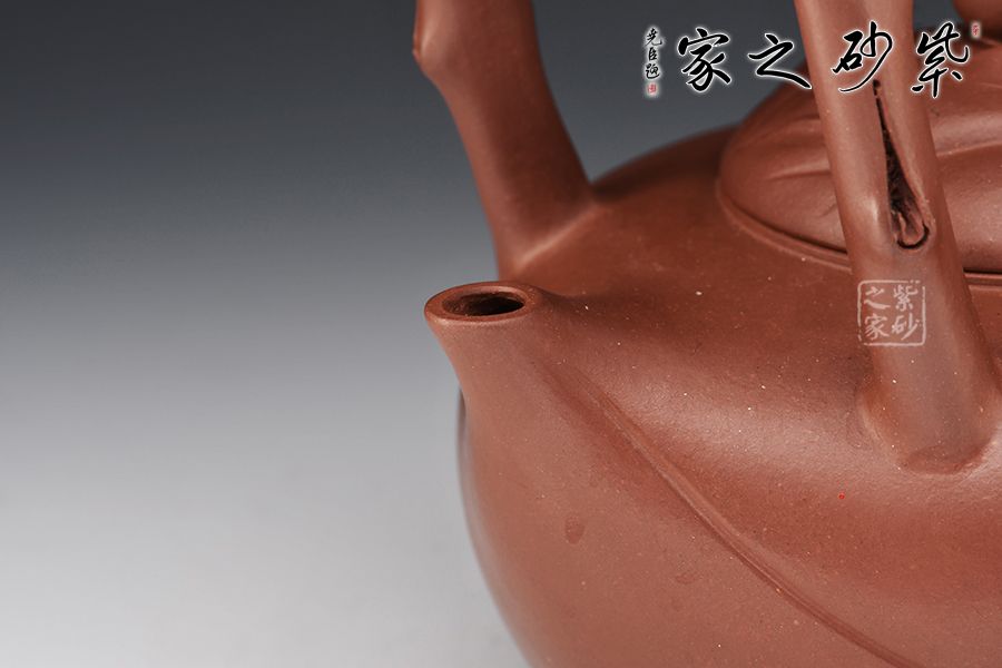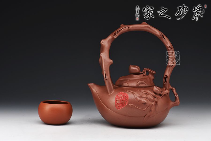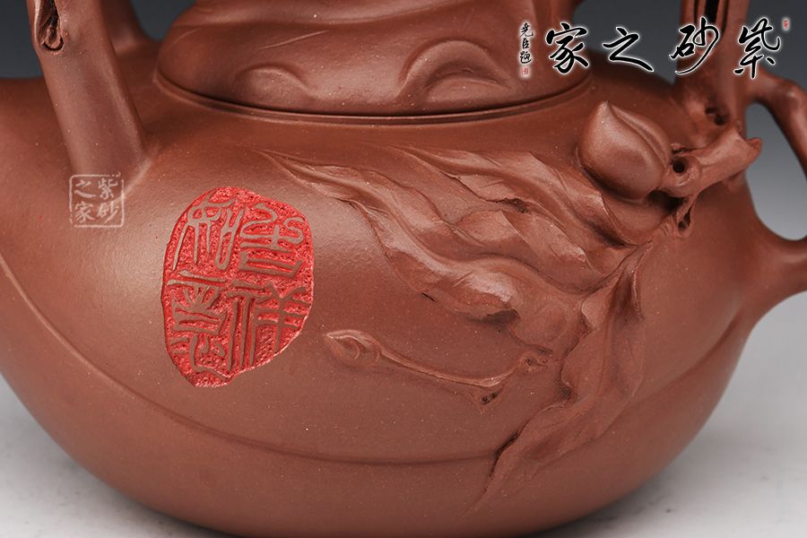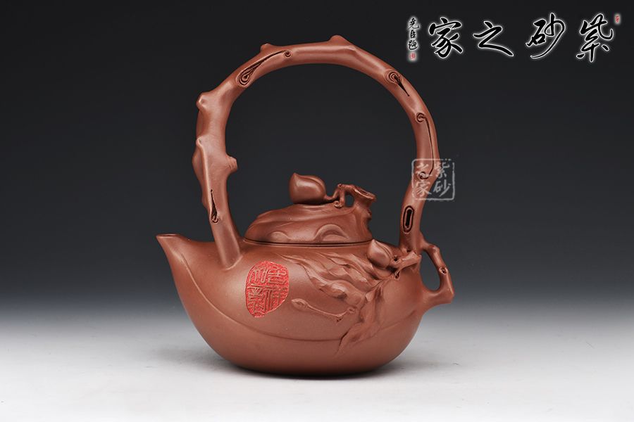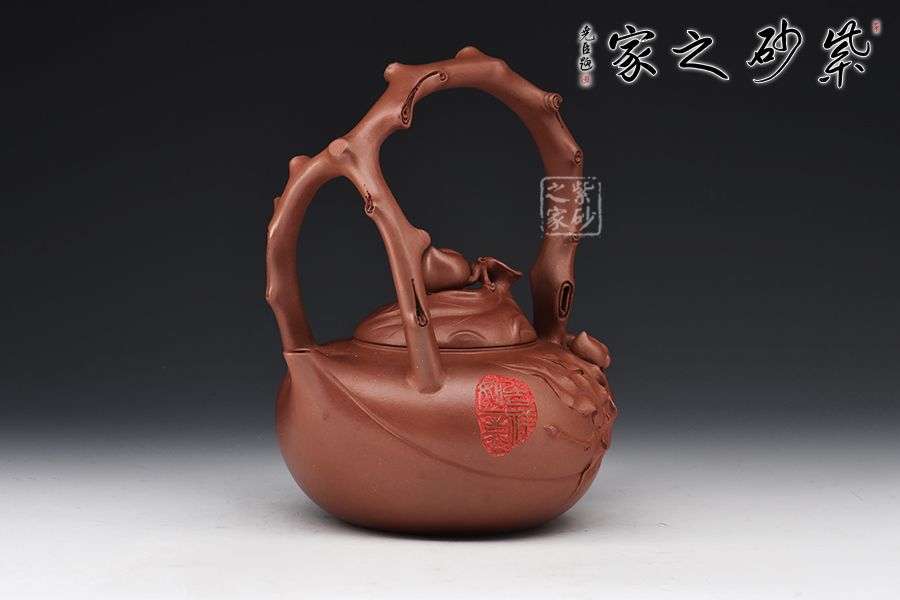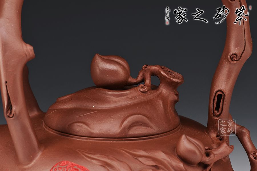 此壺以壽桃為原型,扁圓的形態(tài),細膩的外表,正像一顆熟透的桃一般無二。壺嘴化為桃尖,桃瓣線條從嘴口延伸下來,縱貫半身。壺蓋又是一只桃形,蓋上的壺鈕是一顆小桃。貼花裝飾,栩栩如生的小桃子與桃葉點綴在壺身周圍,襯托得壺身這顆大桃惟妙惟肖。壺嘴的桃心形狀更讓人會心一笑,連著提梁把的桃枝外觀,田園情趣讓人心神安寧。