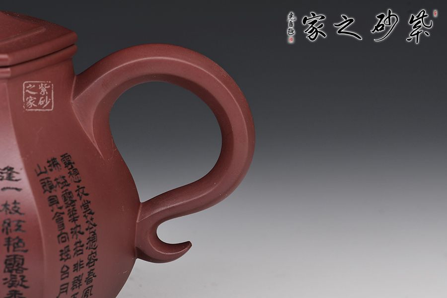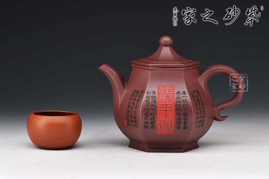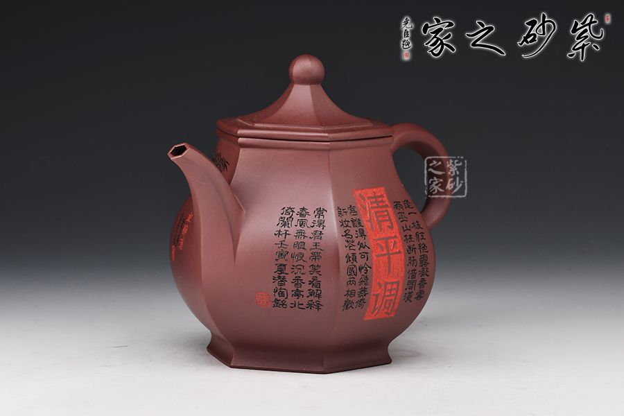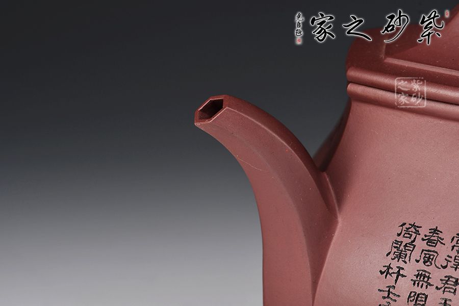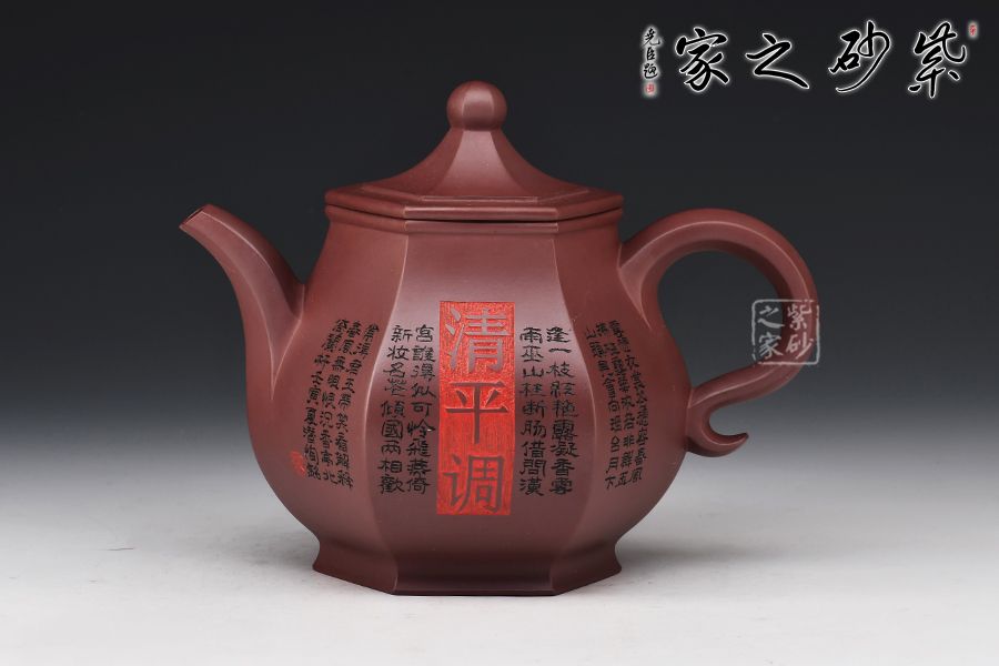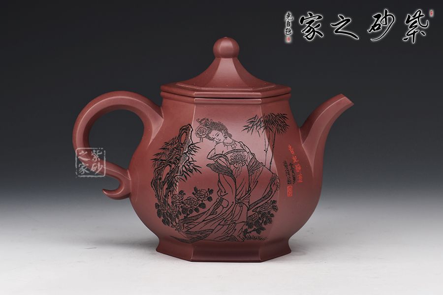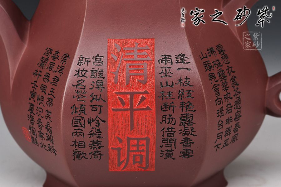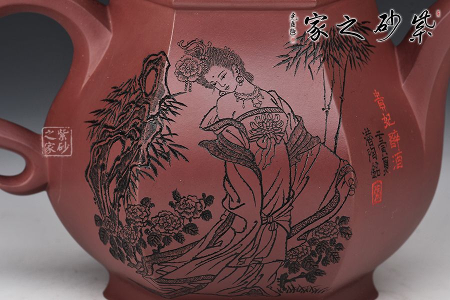 此壺器型挺立,線面挺括平直,輪廓線條分明,一種內(nèi)在的張力和外在的沉穩(wěn)相互交融,更襯托出此壺形體的虛實之美。壺身一面刻繪貴妃醉酒圖,一面題字《清平調(diào)》,相互呼應(yīng),意境深遠。