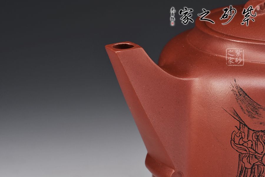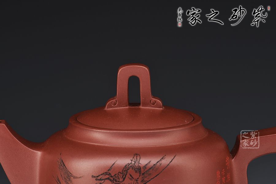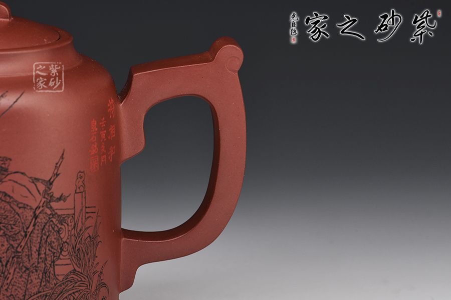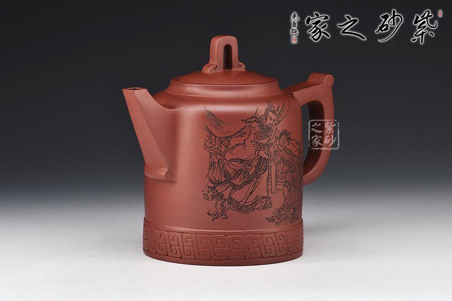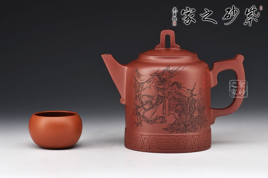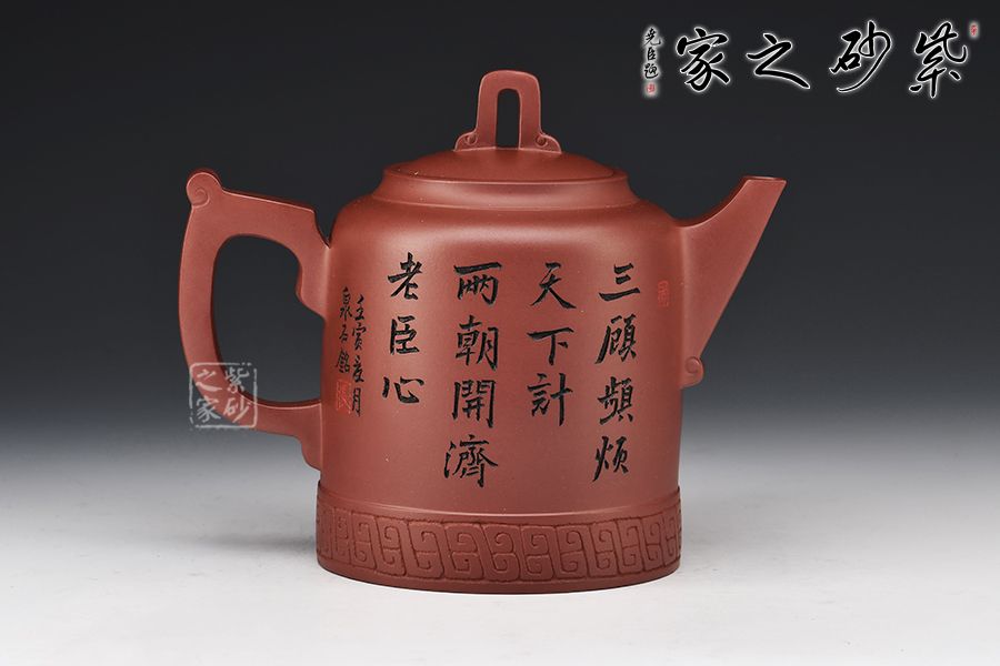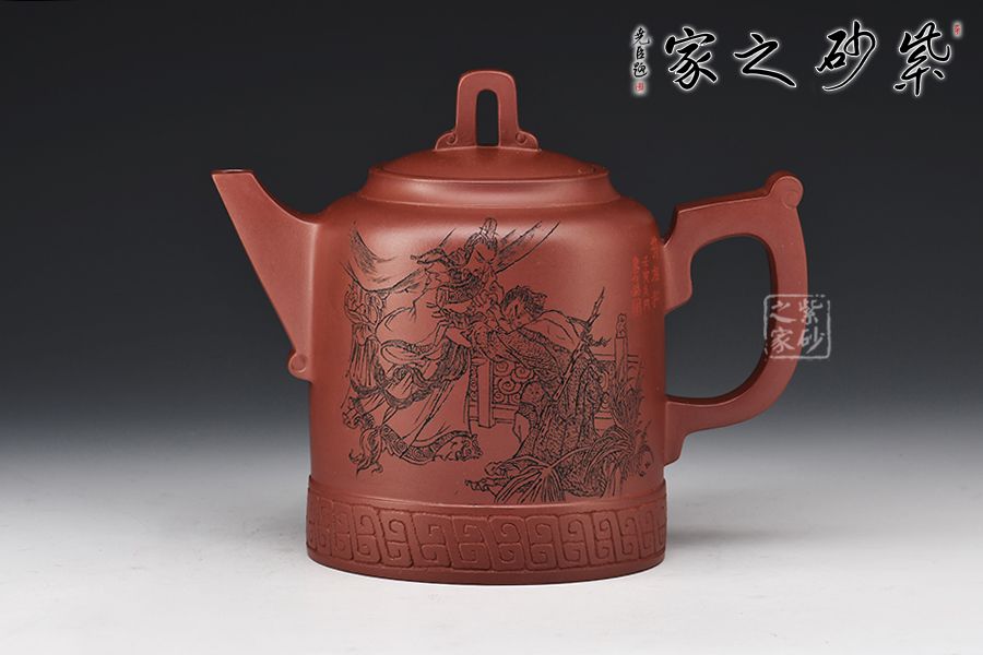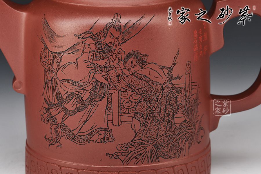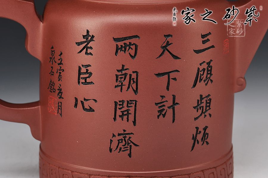 此壺器身高挑挺拔,氣度恢宏,壺肩微凹,天地合一。橋鈕氣貫如虹,流把胥出有力,瀟灑自若。整器簡(jiǎn)潔明快,剛勁古雅,撲面而來(lái)的宏大氣勢(shì),深沉拙樸的張力,蘊(yùn)君王風(fēng)范而又內(nèi)斂、謙遜。壺身一面刻繪負(fù)荊請(qǐng)罪圖,一面刻“三顧頻煩天下計(jì),兩朝開(kāi)濟(jì)老臣心。”逸顯坦蕩與自在,使人于品賞間,感心胸豁達(dá)。
