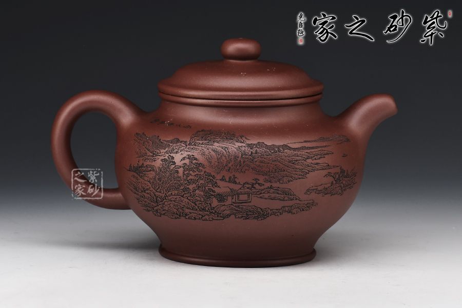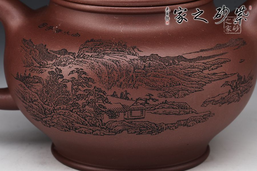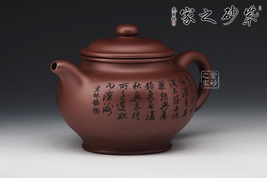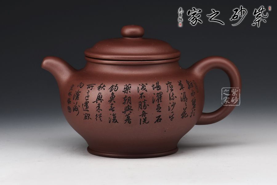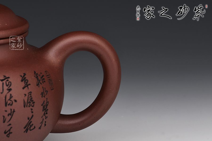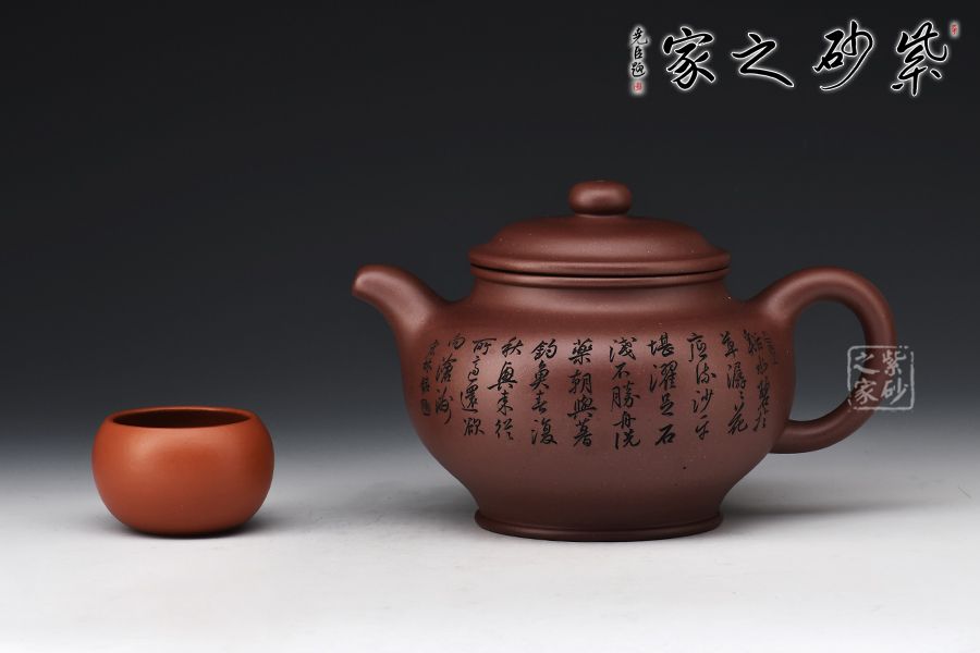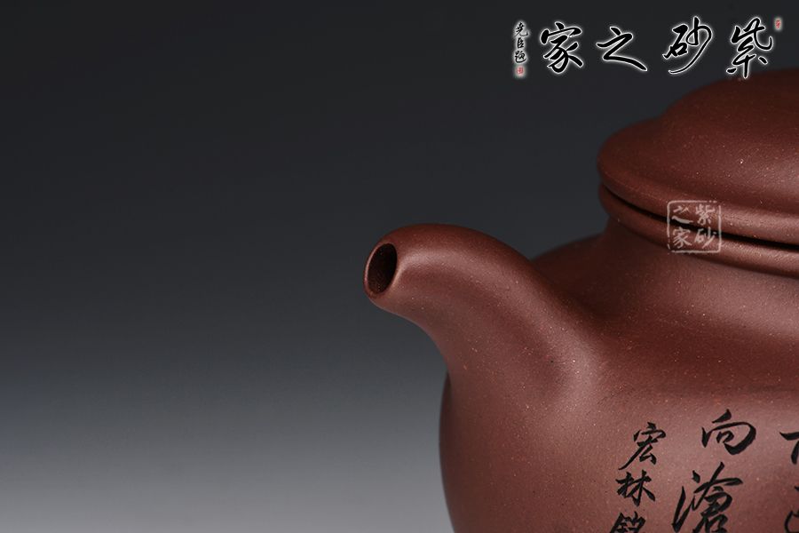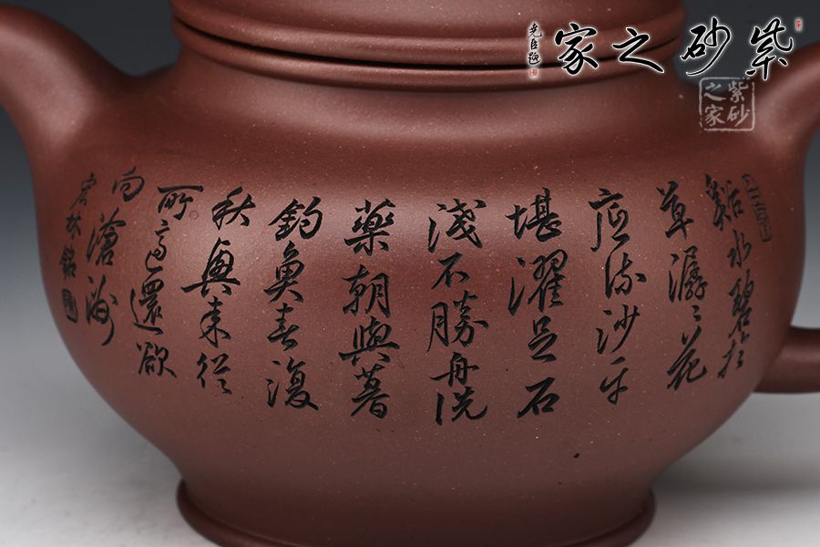 掇只壺為紫砂圓器中的經(jīng)典壺式,此壺以原礦底槽青作胎,泥色溫潤雅致。整器簡潔大氣,壺鈕、壺蓋、壺身以扁圓之形相呼應,流、把之比例恰到好處,線條柔和而圓潤,細膩且自然,壺身雙面刻繪刀法利落,筆力飄逸,情趣韻味優(yōu)雅,值得賞藏。
