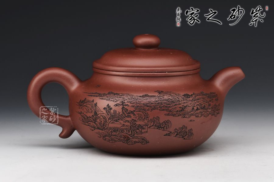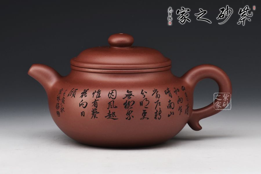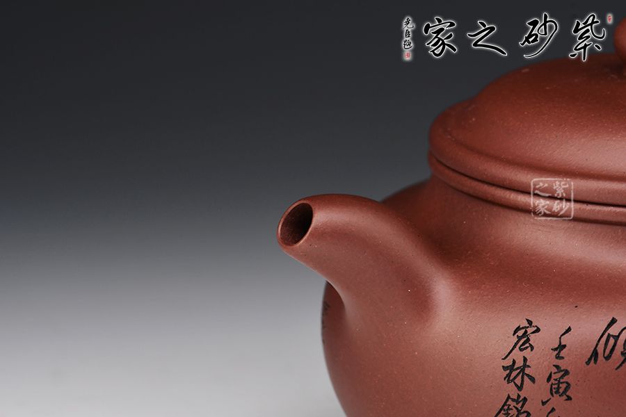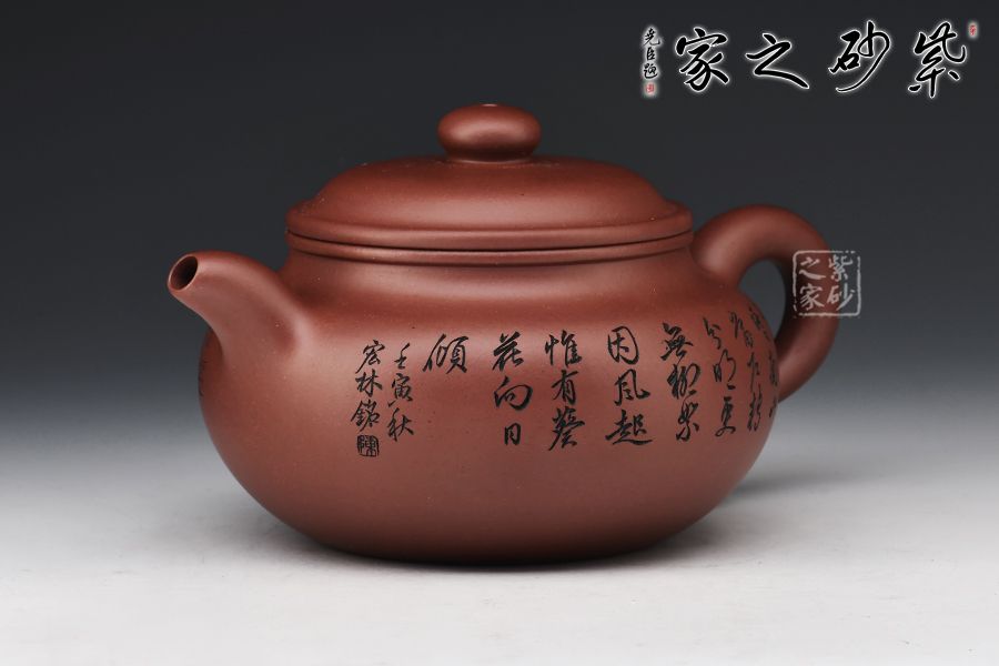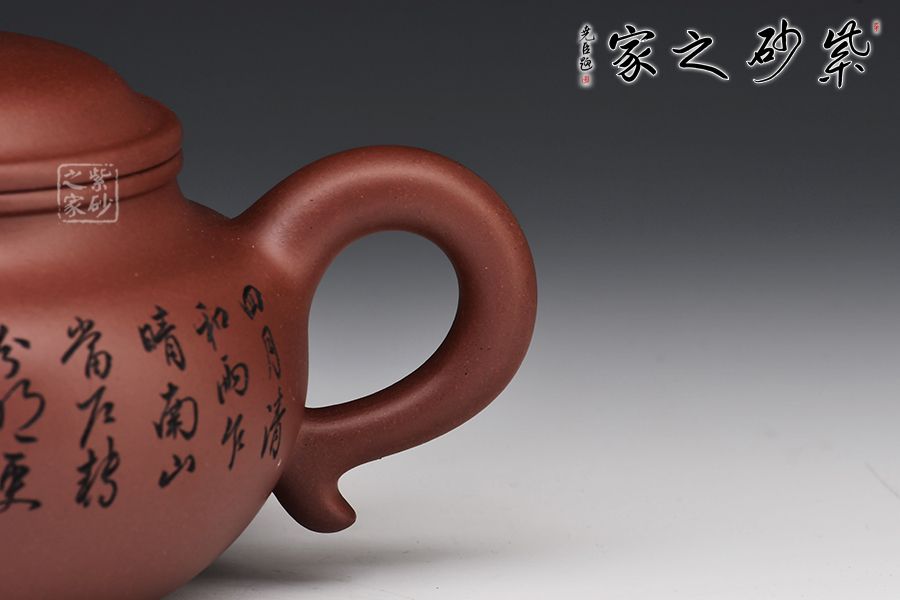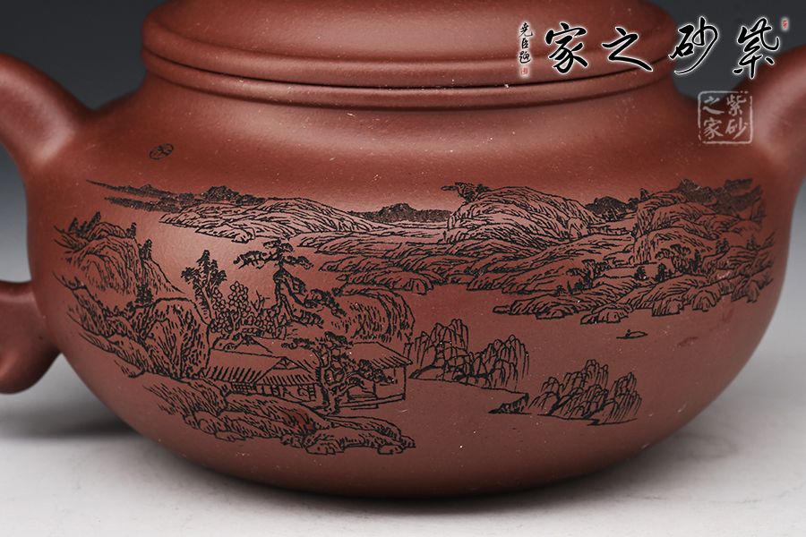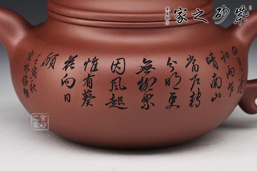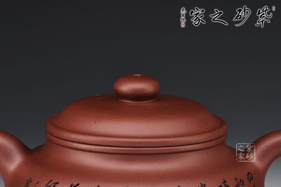 整壺采用了原礦底槽清制作而成,泥質(zhì)細(xì)膩,泥色明潤,盡顯高雅。造型仿“鼓”之形,壺身扁圓,壺腹飽滿,鈕、蓋、身三位一體,線條銜接流暢。流、把挺拔胥出,呈對稱之勢,耳把下留耳垂,更添韻味。壺身雙面刻繪刀法利落,筆力飄逸,情趣韻味優(yōu)雅,值得賞藏。