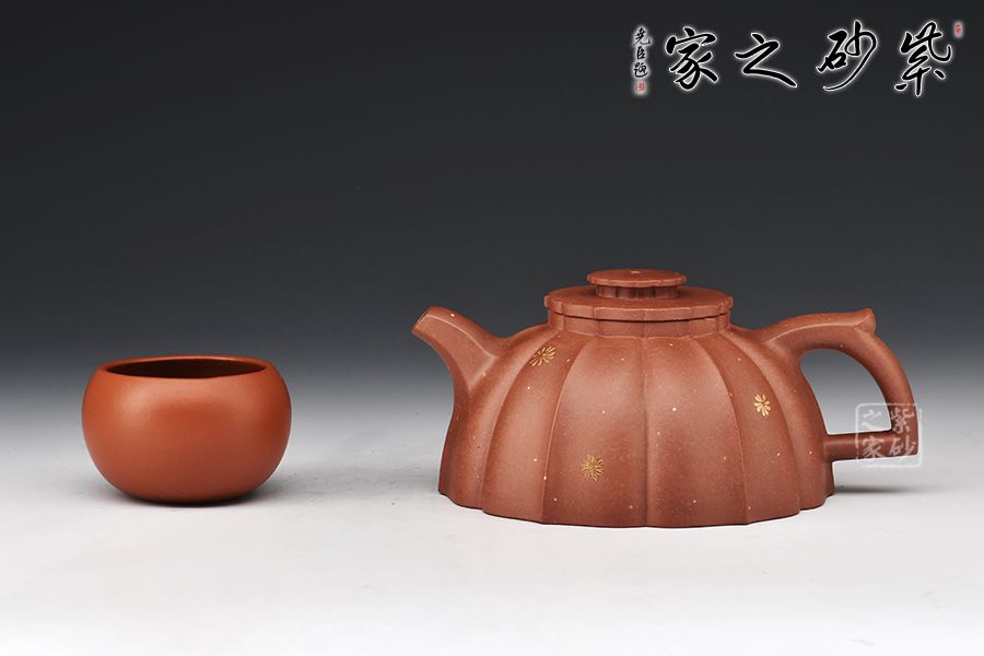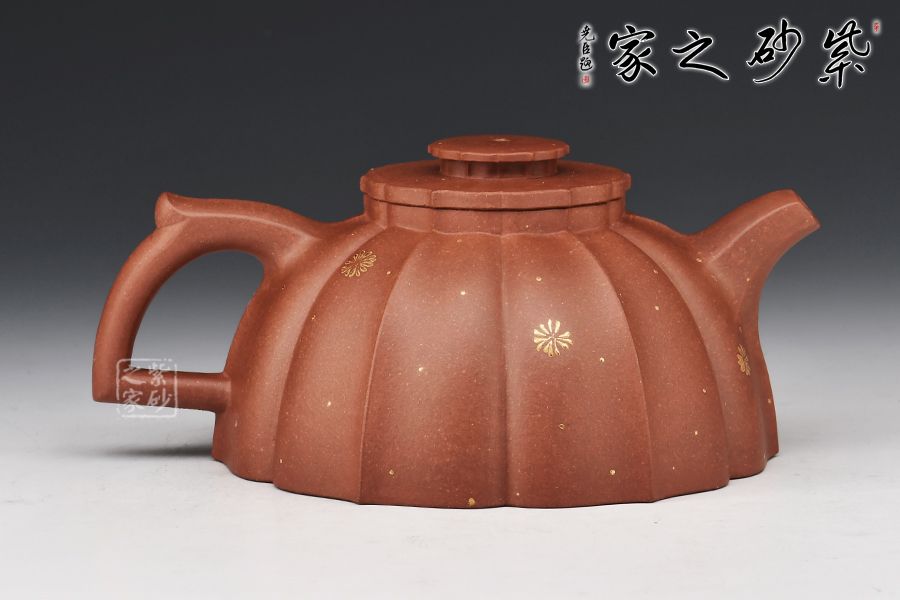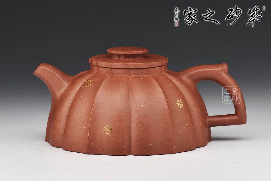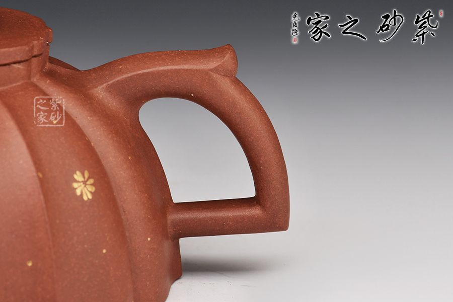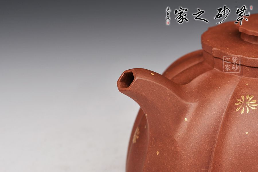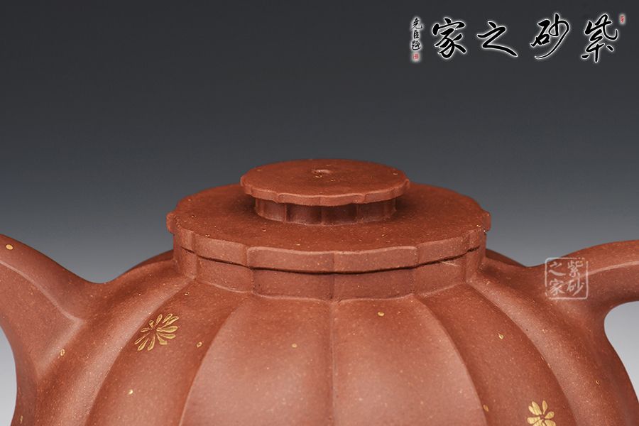 此成型難度高,筋紋入壺,制作精細(xì)規(guī)整,做工嚴(yán)謹(jǐn),每一個瓣棱之間排列勻稱,飽滿,韻味濃郁,無生硬之處。此壺造型優(yōu)雅寫意,凹凸線亦在肩上勾勒出花形輪廓。鈕,蓋,頸六囊紋自與壺身對應(yīng),氣流暢自如,顯見功力。整個壺形比例精確,紋理清晰,深淺自如,明暗分明,壺蓋與壺身上下貫通,渾然一體,壺蓋可以任意調(diào)換角度,與壺口配合嚴(yán)密,分毫不差,展現(xiàn)了點線面的最佳組合。描金裝飾,如一朵朵小花點綴其間,十分精致美觀,推薦收藏!